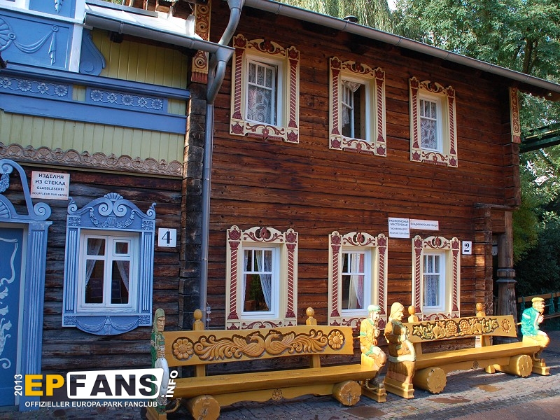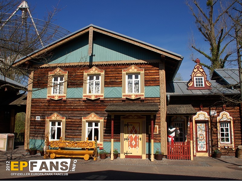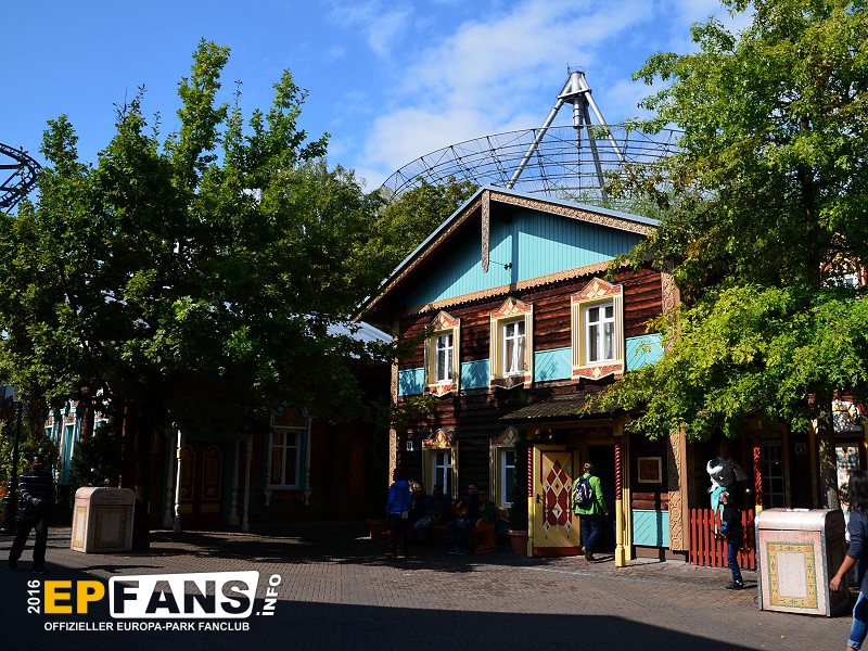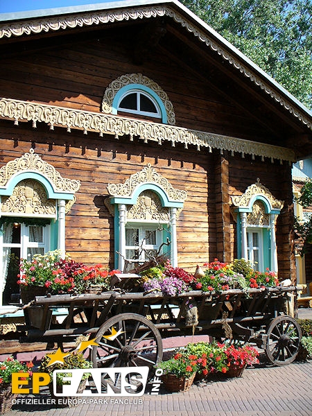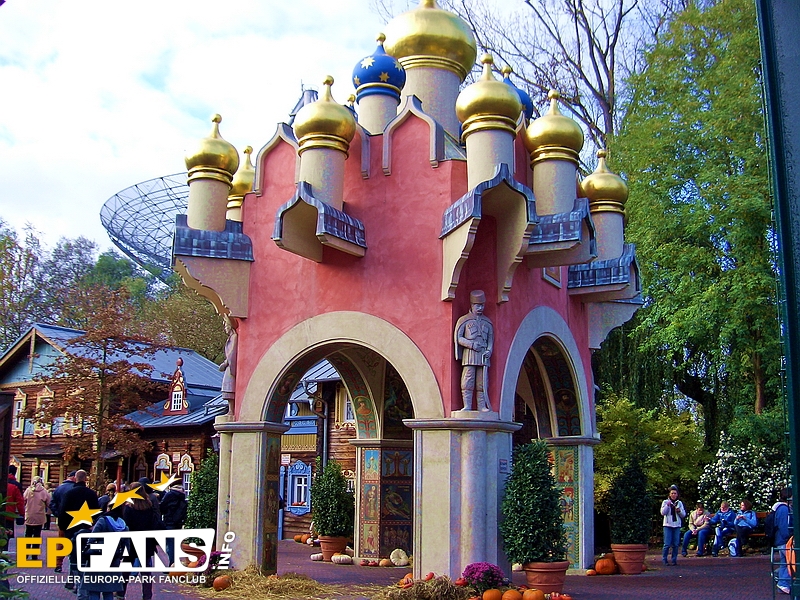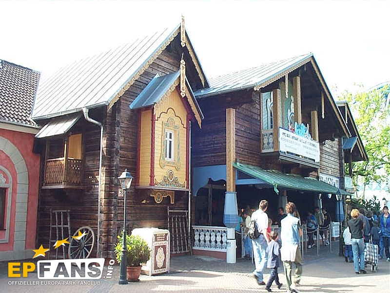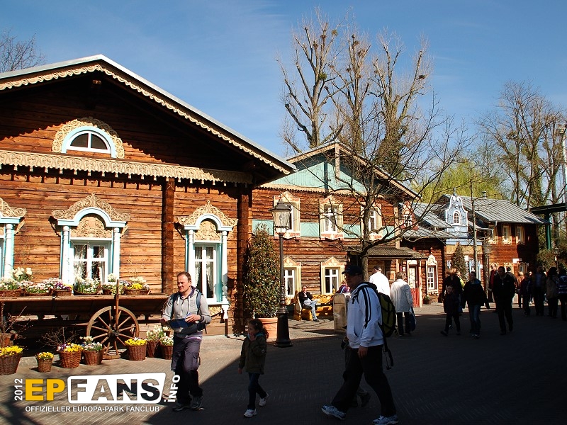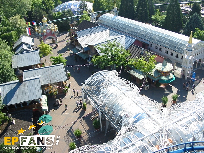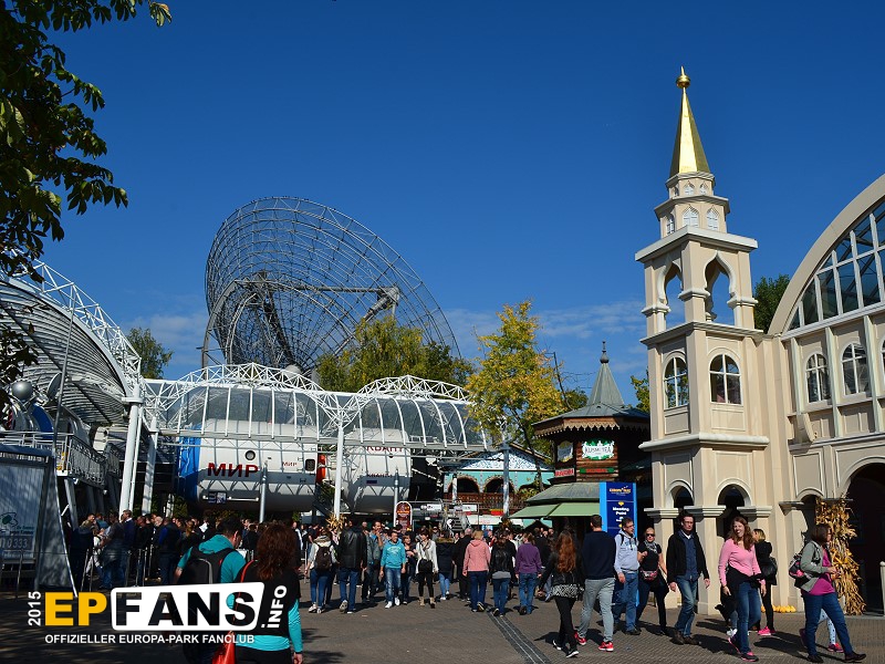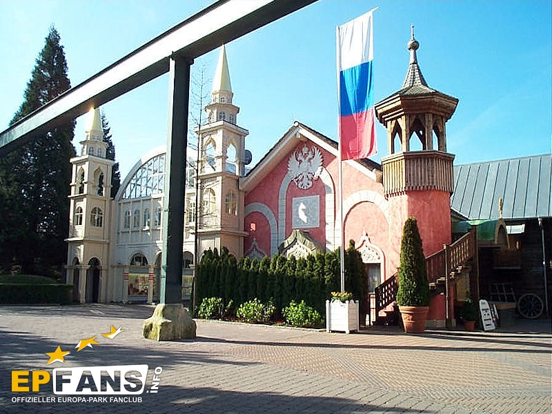 Und nicht nur dieses Trainingsmodul, sondern unzählige weitere Attraktionen beleben den Themenbereich von Russland. Allen voran ein Gigant aus Glas und Stahl, die Achterbahn Euro-Mir, die ihren Weg langsam um gigantische Glastürme zieht, ehe sie mit Tempo 80 in die Tiefe stürzt, so wie es ihr Vorbild im Weltraum getan hat. Doch nicht nur pure Technik, sondern auch die kulturelle Vielfalt Osteuropas lernt man auf eindrucksvolle Weise im russischen Themenbereich kennen. Bunt verzierte und mit vielen Schnitzereien versehene Holzkaten bilden das Russische Dorf, wo auch vergoldete Zwiebeltürme nicht fehlen dürfen.