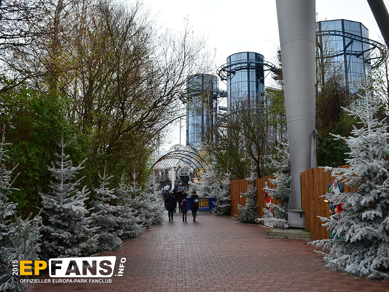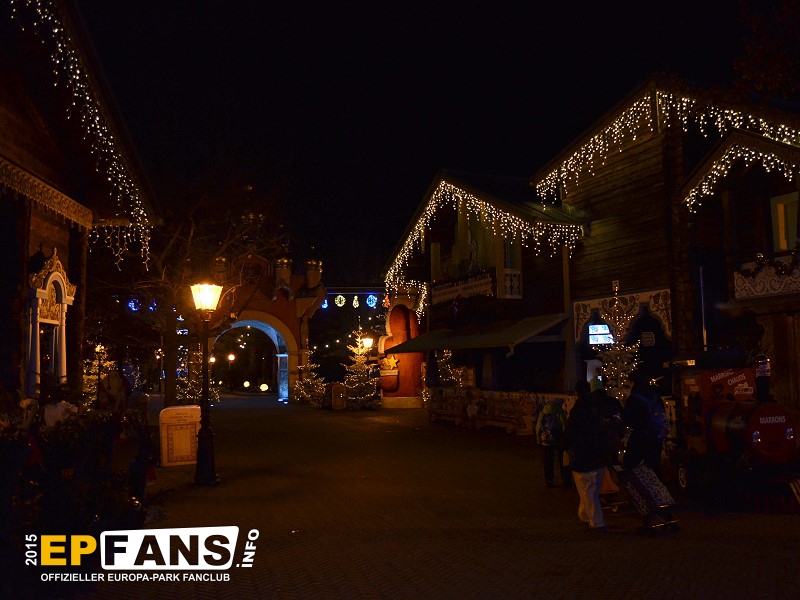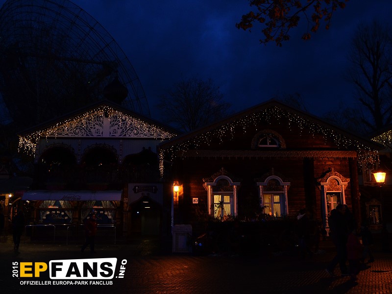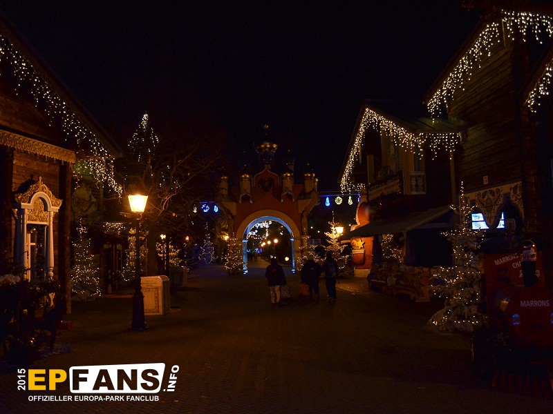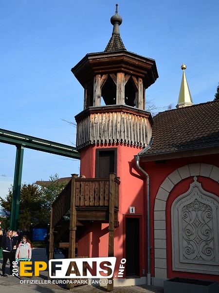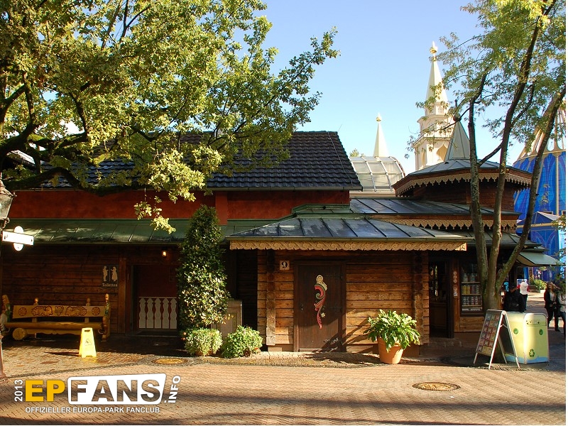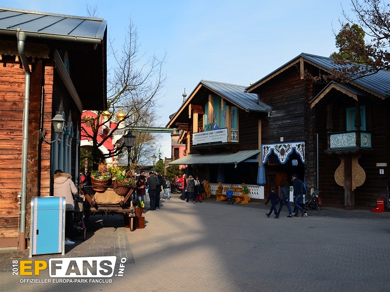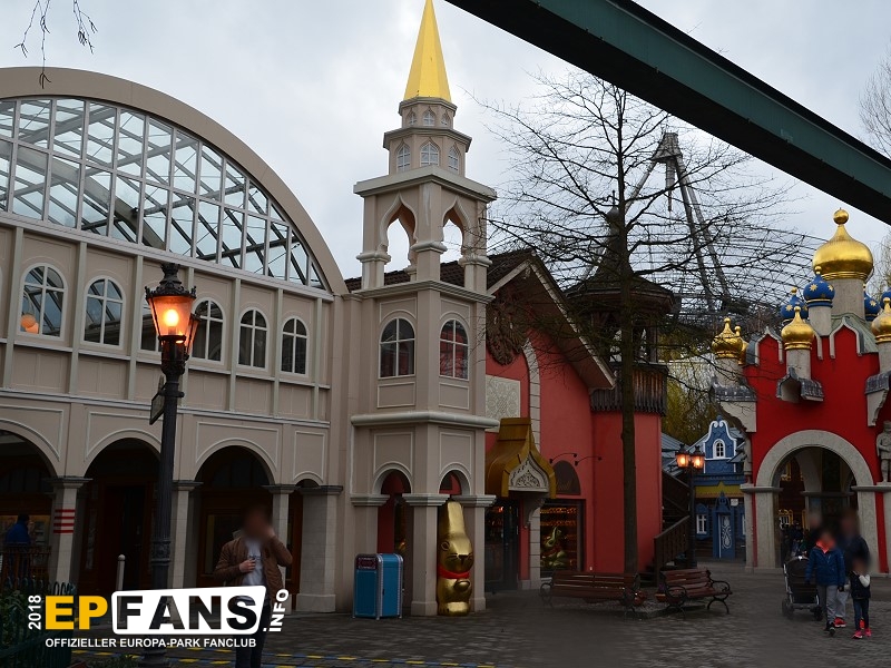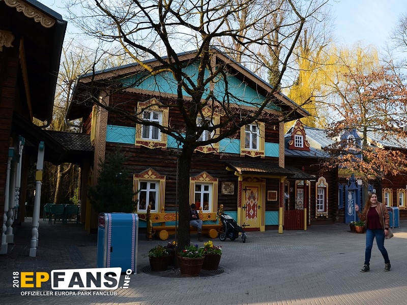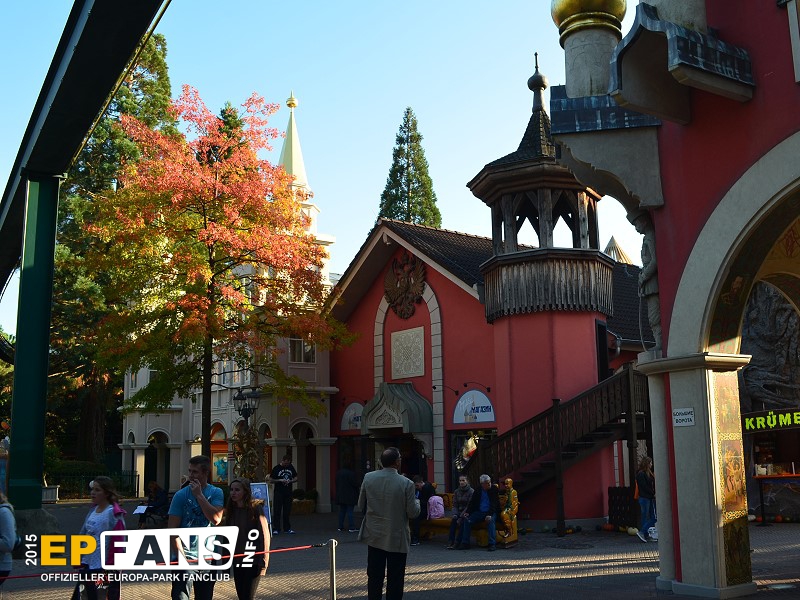 Und nicht nur dieses Trainingsmodul, sondern unzählige weitere Attraktionen beleben den Themenbereich von Russland. Allen voran ein Gigant aus Glas und Stahl, die Achterbahn Euro-Mir, die ihren Weg langsam um gigantische Glastürme zieht, ehe sie mit Tempo 80 in die Tiefe stürzt, so wie es ihr Vorbild im Weltraum getan hat. Doch nicht nur pure Technik, sondern auch die kulturelle Vielfalt Osteuropas lernt man auf eindrucksvolle Weise im russischen Themenbereich kennen. Bunt verzierte und mit vielen Schnitzereien versehene Holzkaten bilden das Russische Dorf, wo auch vergoldete Zwiebeltürme nicht fehlen dürfen.