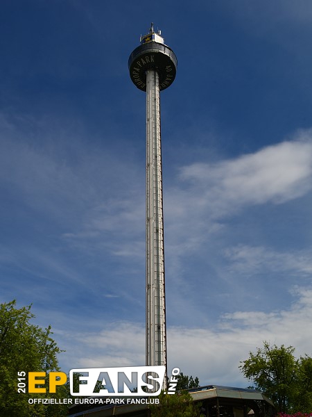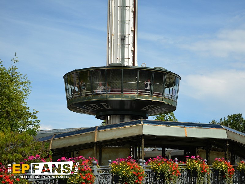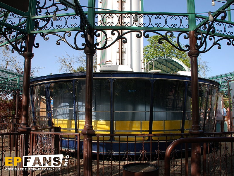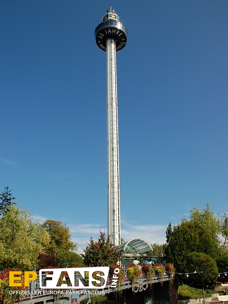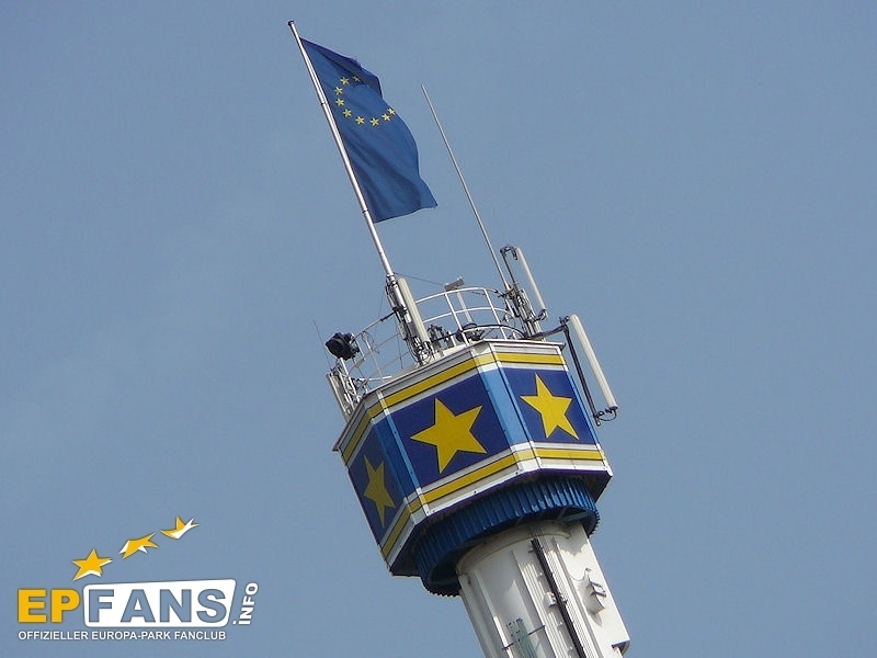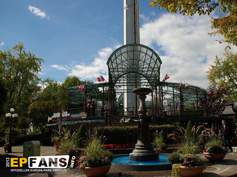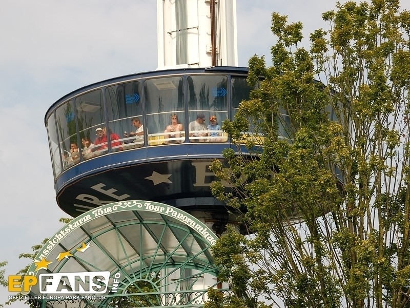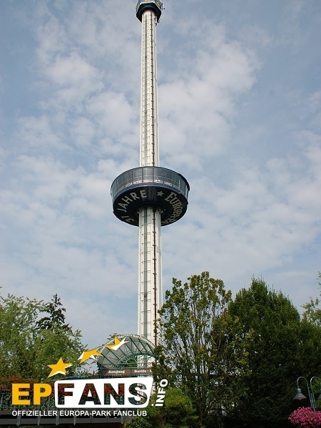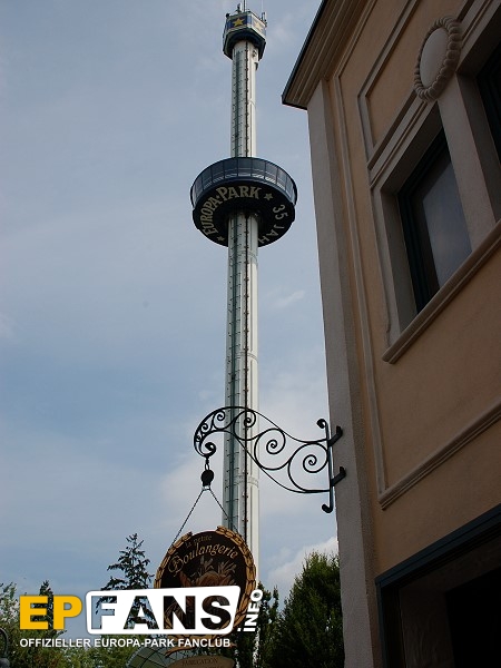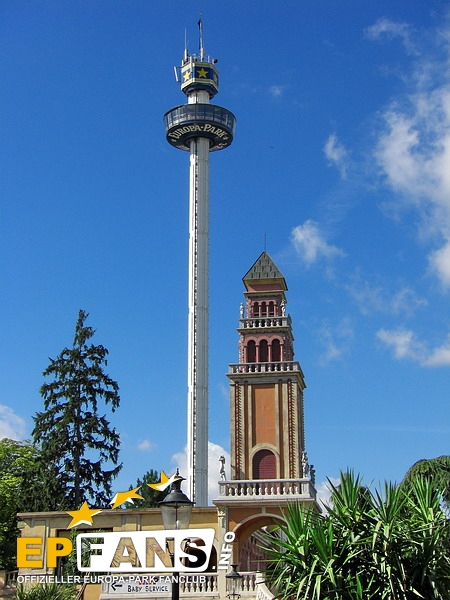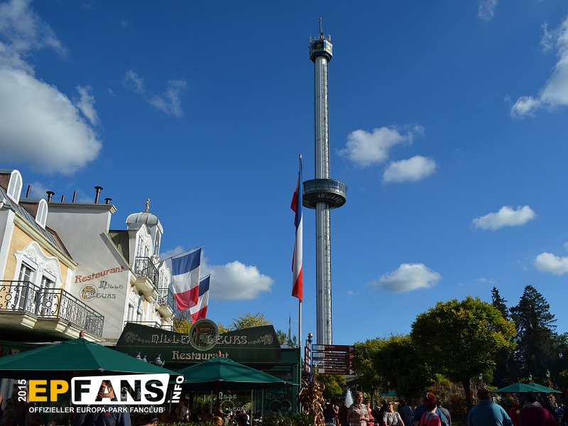 Euro-TowerFrankreich - Der Euro-Tower ist 75 m hoch und wurde von der Firma Intamin hergestellt. Bei diesem Turm fährt man wie in einem Fahrstuhl langsam nach oben. Während der Fahrt dreht sich die Gondel und somit bekommt man einen Rundblick über den Park sowie bei klarem Wetter eine herrliche Fernsicht auf den Schwarzwald und die Vogesen. Der Panorama-Aussichtsturm stand, bevor er 1983 im Europa-Park aufgebaut wurde, auf der Bundesgartenschau in Kassel und auf der "Grün" in Basel. 3 Jahre hat Roland Mack gebraucht, um die Genehmigung von den Behörden für diese Höhe zu bekommen. Der Turm hat eine stündliche Kapazität von 600 Personen und gehört zu den Wahrzeichen des Parks, da man ihn schon aus der Ferne sehen kann.