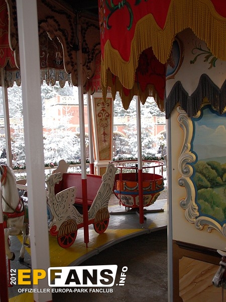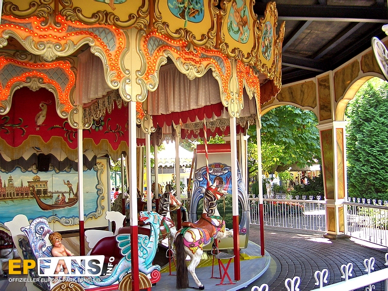 Info-Tafel des Europa-Park: Original 100 Jahre altes Pferdekarussell. Durch einen Zufall ist es uns gelungen, diese Rarität, ein echtes altes, handgearbeitetes Pferdekarussell zu erwerben. Es war 4 Generationen in Familienbesitz. Wieviele blanke Kinderaugen mögen zu ihm aufgeschaut haben, wieviele Freundschaften mögen durch eine erste gemeinsame Fahrt auf dem hölzernen Pferderücken entstanden sein und noch entstehen?