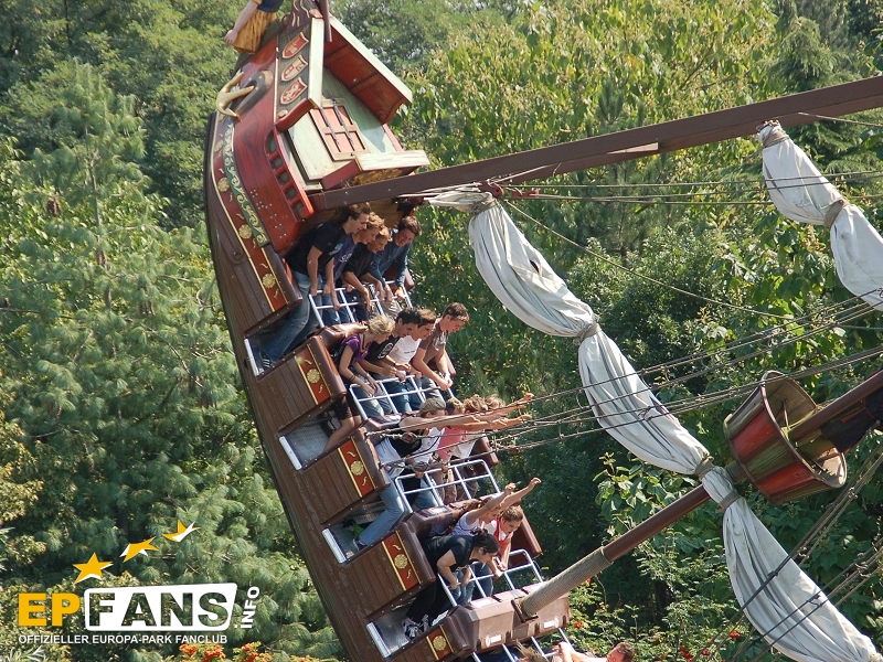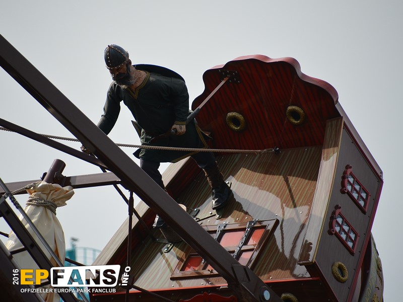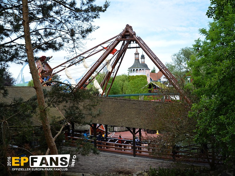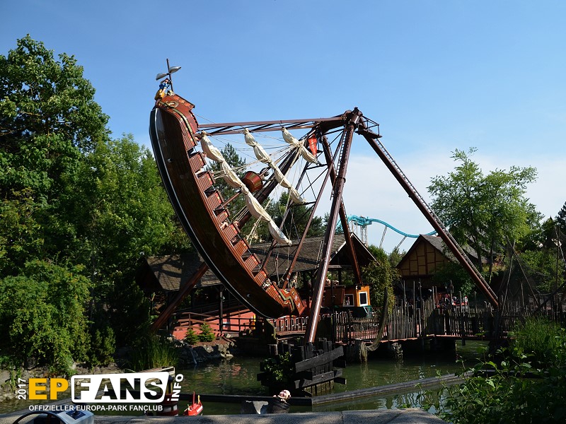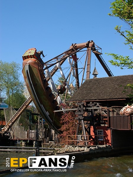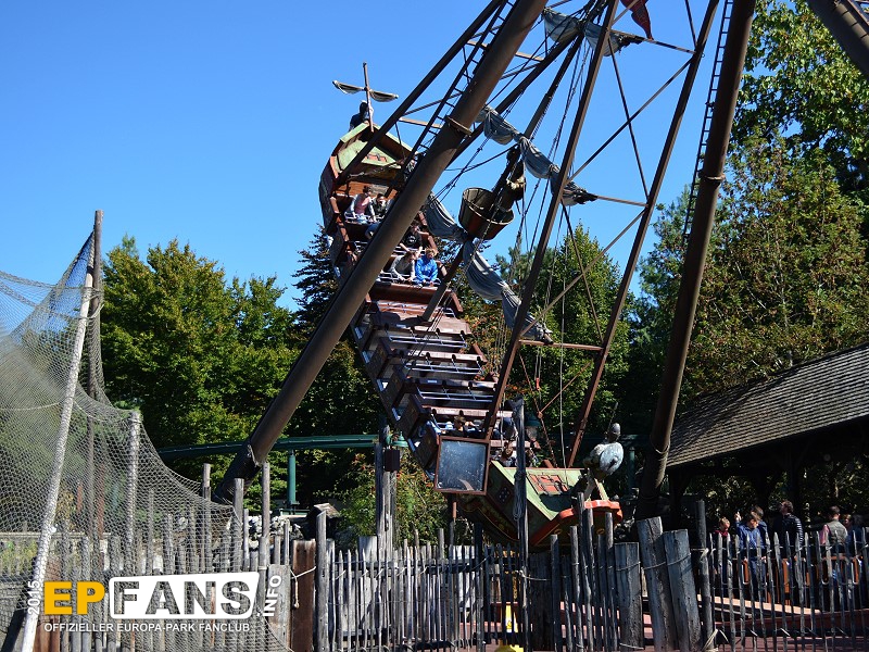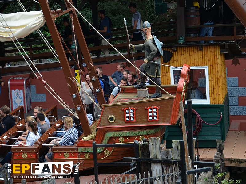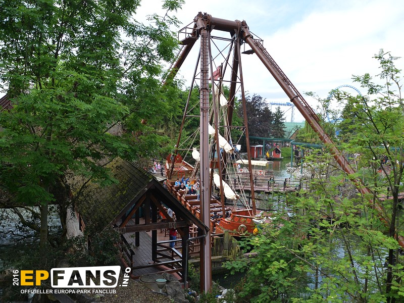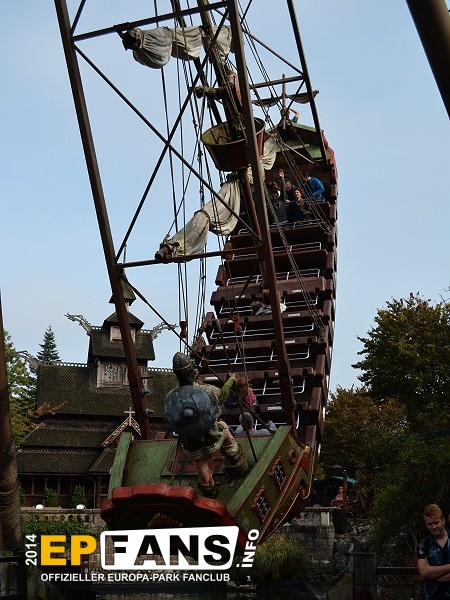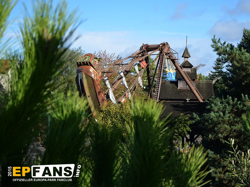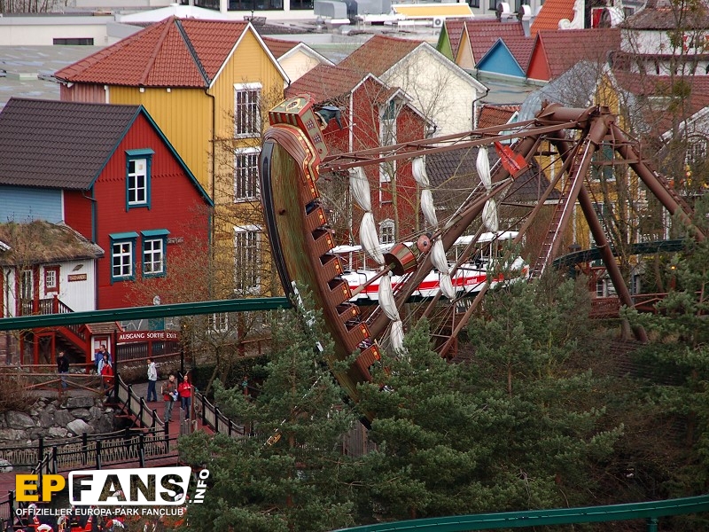VindjammerSkandinavien - Schon die Wikinger wussten, wie gefährlich eine Überfahrt sein kann. Dazu muss nur das Wetter nicht mitspielen und schon schaukelt sich das Schiff auf den Wellen in die Höhe. Doch im Europa-Park wünschen wir Ihnen kein schlechtes Wetter - hier genügt es auf einer der Bänke der Schiffschaukel Platz zu nehmen. Das Boot wird durch einen Reifen auf der Unterseite angetrieben und wieder gebremst. Dabei wechselt er ständig die Drehrichtung um das Boot mit Schwung zu versorgen. Vor allem die äußeren Bänke sind sehr begehrt, weil hier der höchste Ausschlag des Schiffs auftritt und somit auch am meisten Magenkribbeln verursacht.