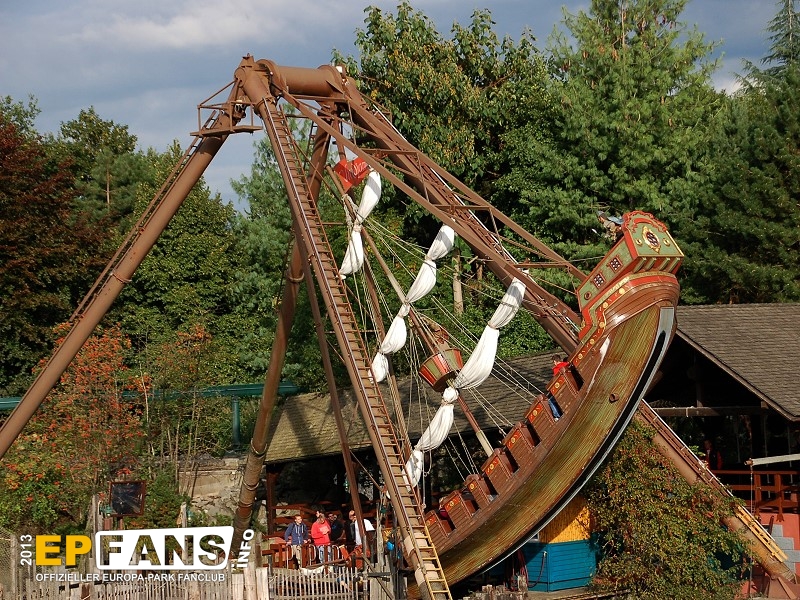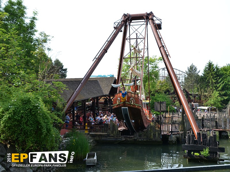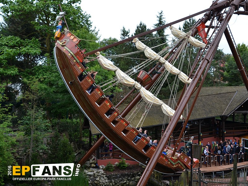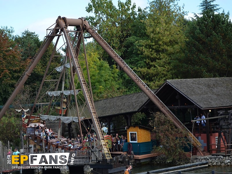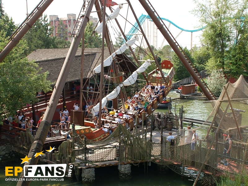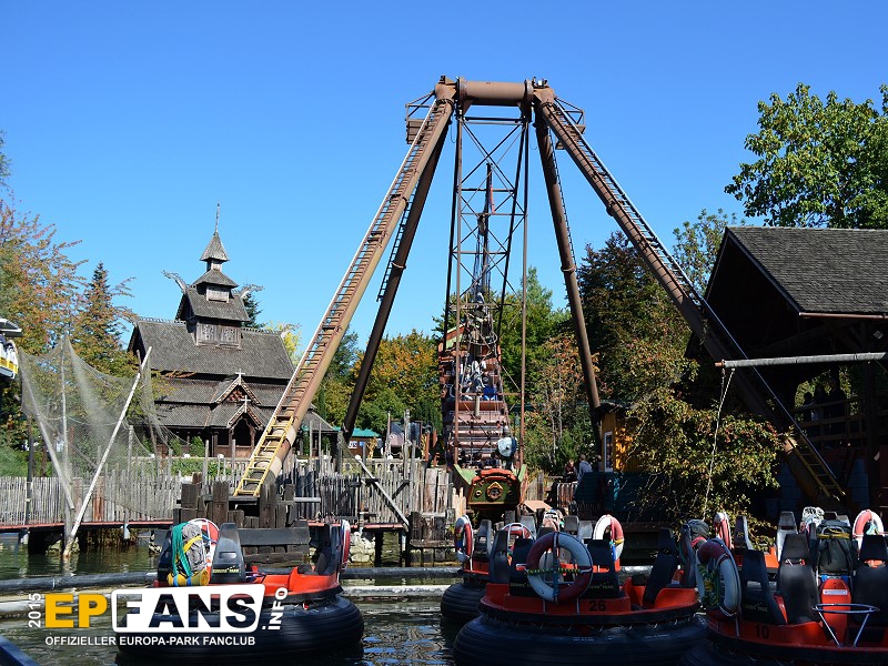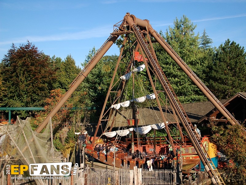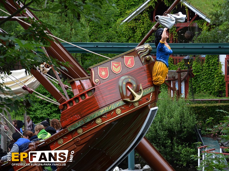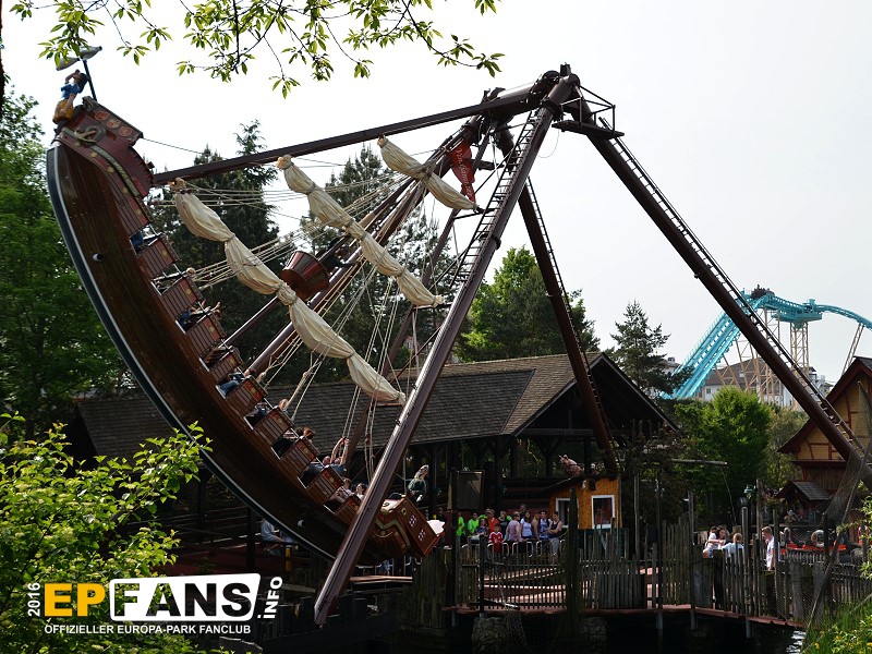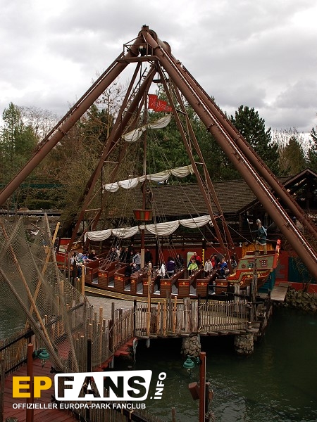 VindjammerSkandinavien - Schon die Wikinger wussten, wie gefährlich eine Überfahrt sein kann. Dazu muss nur das Wetter nicht mitspielen und schon schaukelt sich das Schiff auf den Wellen in die Höhe. Doch im Europa-Park wünschen wir Ihnen kein schlechtes Wetter - hier genügt es auf einer der Bänke der Schiffschaukel Platz zu nehmen. Das Boot wird durch einen Reifen auf der Unterseite angetrieben und wieder gebremst. Dabei wechselt er ständig die Drehrichtung um das Boot mit Schwung zu versorgen. Vor allem die äußeren Bänke sind sehr begehrt, weil hier der höchste Ausschlag des Schiffs auftritt und somit auch am meisten Magenkribbeln verursacht.