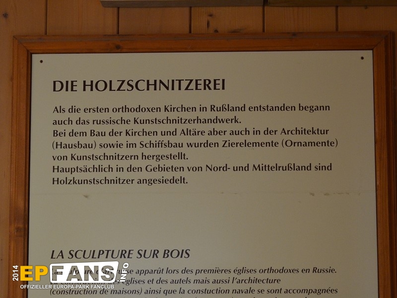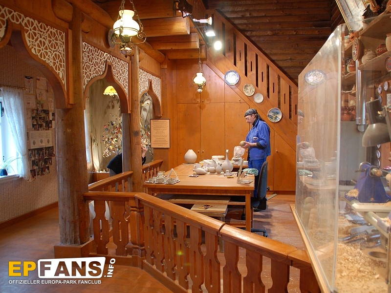 Russisches DorfRussland - In den Holzhäusern im russischen Themenbereich wird die traditionelle Handwerkskunst des Schnitzens und Malens weitergeführt. Tritt herein und schau dir die fantastischen Kunstwerke an, die hier hergestellt werden. Du wirst erstaunt sein wie filigran und genau hier gearbeitet wird.