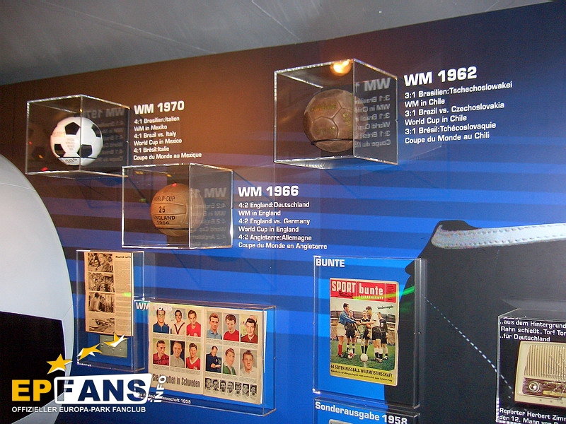 |  |  | Walk of Fame - adidas - die Fußball-ErlebnisweltEngland - Begebt euch auf Zeitreise durch die Geschichte des größten Sportereignisses der Welt auf dem "Walk of Fame - die Geschichte der WM". Hier können die Fußballfans die schönsten Momente aus der Fußball-Weltmeisterschaftsgeschichte zwischen 1930 und heute hautnah erleben - mit Replikten legendärer Pokale, original Fußballschuhen herausragender Spieler, original Fußbällen aus Weltmeisterschaftsspielen, vielen Fotos, Karikaturen, Zeitungsausschnitten, Radiokommentaren u.v.m. In historischen Filmsequenzen werden anhand vergangener Weltmeisterschaften herausragende Momente zwischen Sieg und Niederlage lebendig.
