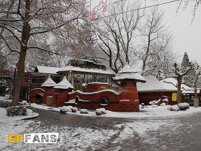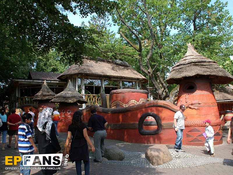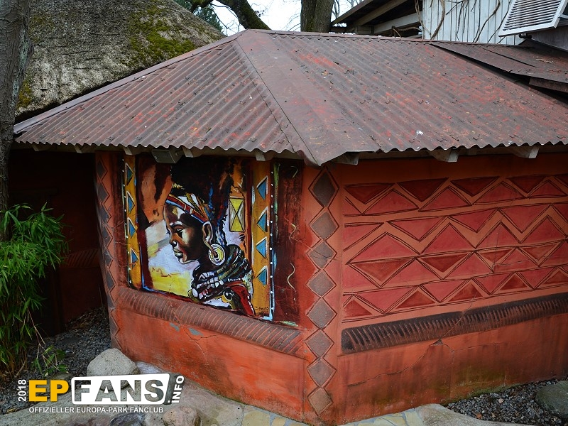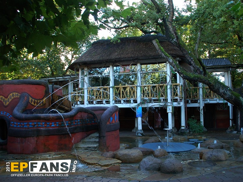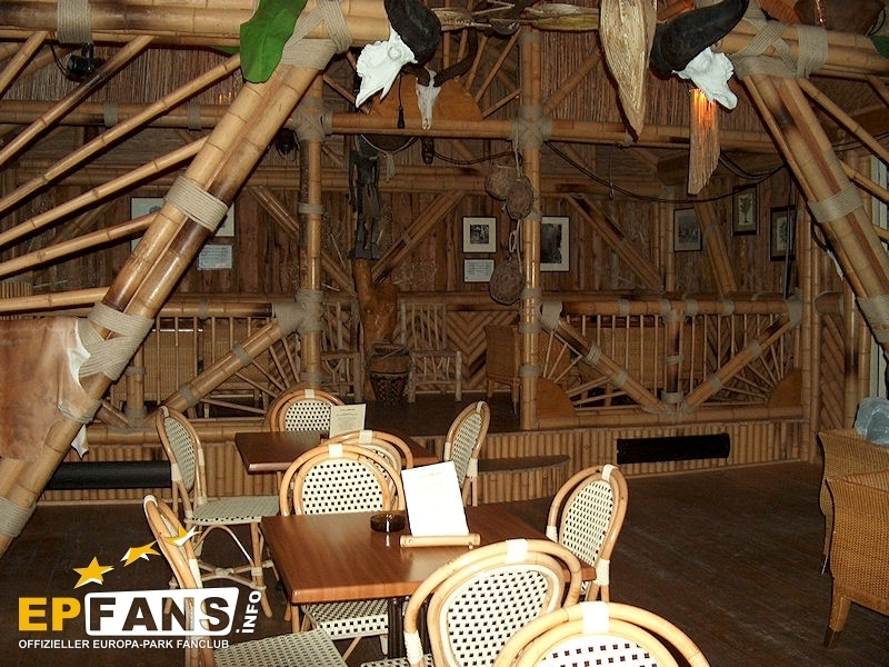 Das im typisch afrikanischen Stil gebaute Haus aus Bambus und Holz lässt die Vorstellung zu, sich mitten in Afrika zu befinden. Neben vielen Kunstgegenständen und Original Dekor-Elementen aus Afrika kannst du in regelmäßigen Abständen auch ein tropisches Gewitter mit Donner, Blitz und Regenschauern erleben.