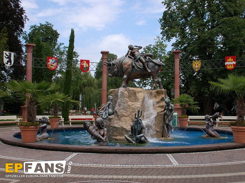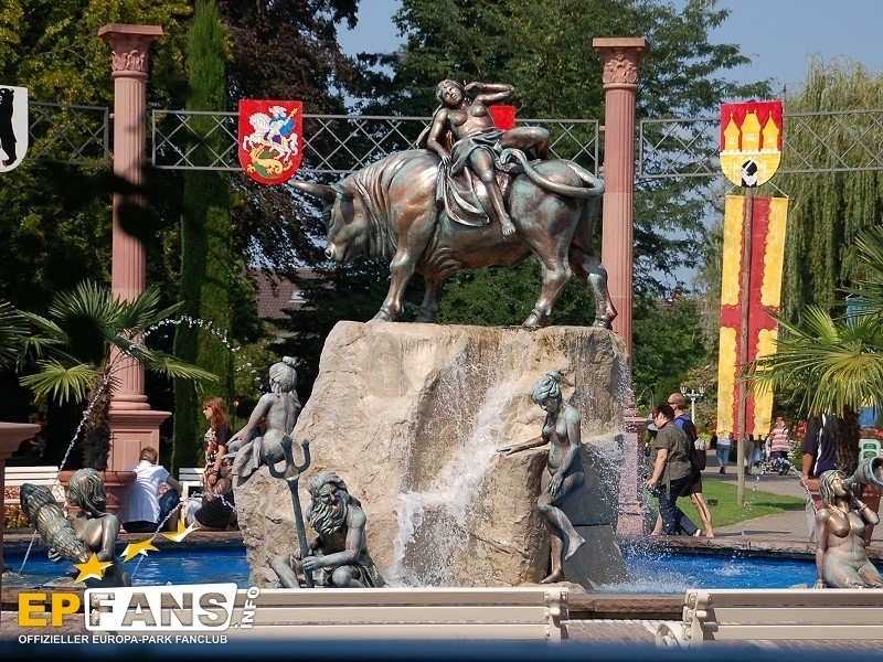 Info-Tafel des Europa-Park: Dort, wo heute Israel, Libanon und Syrien ans Mittelmeer grenzen, lebten im Altertum die Phönizier. Ihr König Agenor hatte eine Tochter mit dem Namen "EUROPA". Während diese mit Freundinnen am Strand des Mittelmeeres spielte, näherte sich ihr Göttervater Zeus. Dieser hatte sich leidenschaftlich in sie verliebt. Er verwandelte sich in einen Stier und entführte die schöne Königstochter in sein Reich auf der Insel Kreta. Die Sage behauptet, dass der Erdteil seither den Namen der Königstochter "EUROPA" trägt.