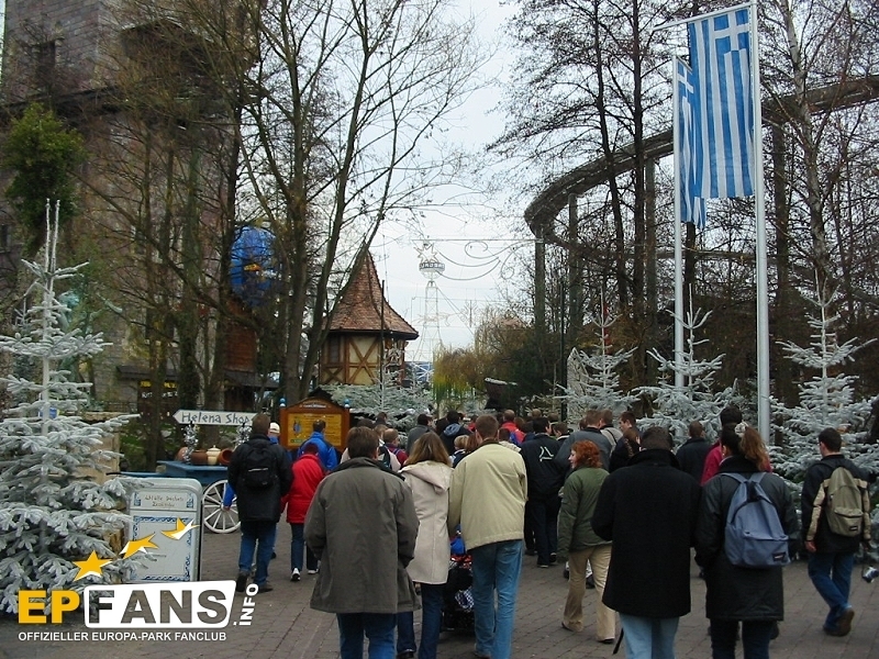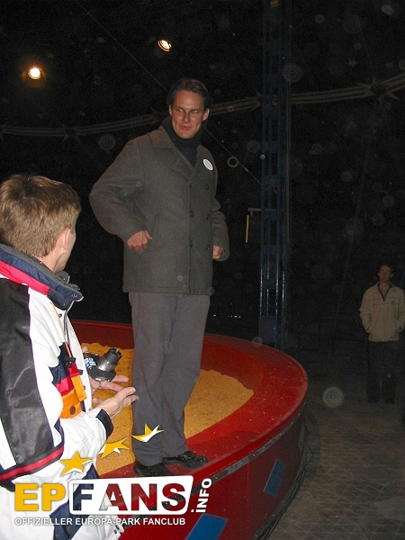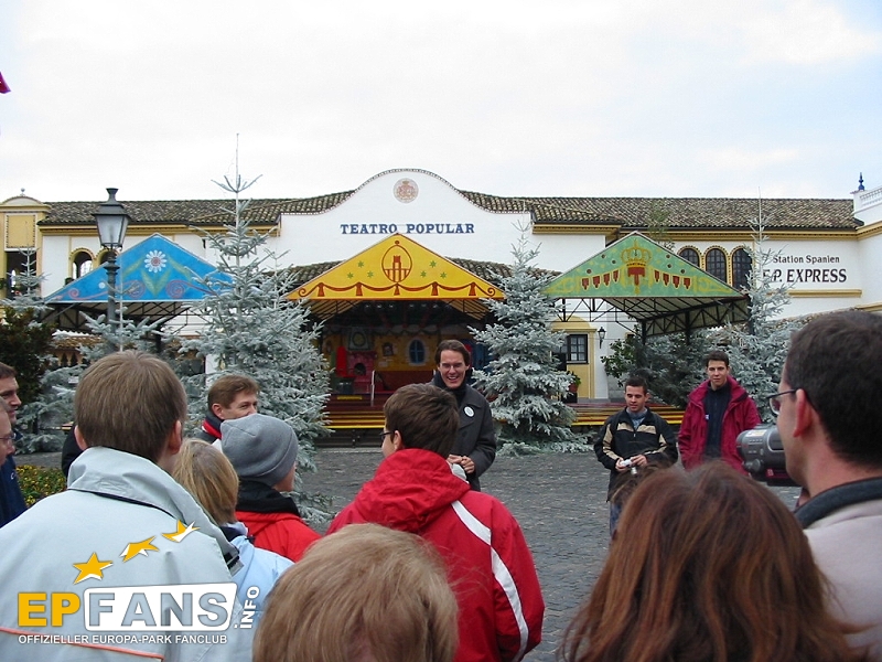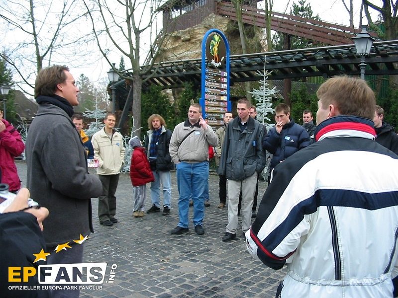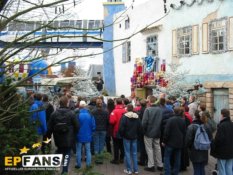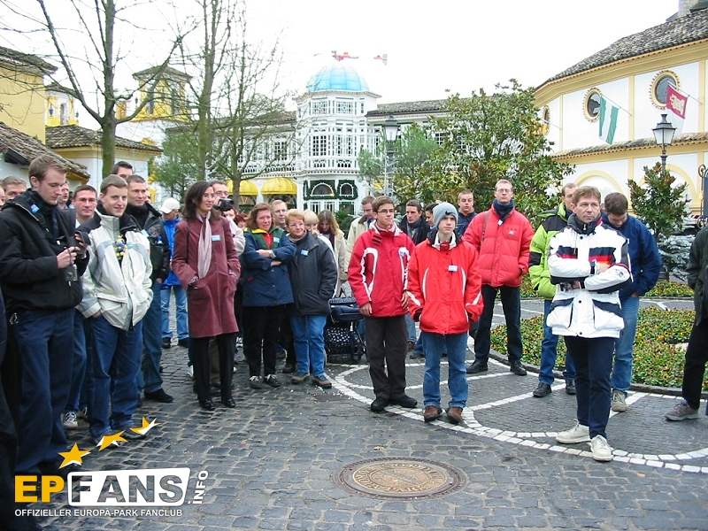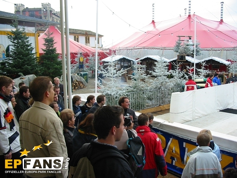 Erstes internationales Europa-Park WinterfantreffenGanz überraschend wurde innerhalb kürzester Zeit das erste internationale Europa-Park Winterfantreffen auf die Beine gestellt. Mitte Oktober landete bei uns die Anfrage, ob Interesse an einem Wintertreffen bestünde. Als Terminvorschlag wurde uns der 30. November 2003 genannt. Zusätzlich zum Wintertreffen bat man uns eine vergünstigte Übernachtung mit Frühstück für die Nacht vom 30. November 2003 auf den 01. Dezember 2003 in einem der beiden EP-Hotels("El Andaluz" oder "Castillo Alcazar") an. Bei diesem Angebot haben wir nicht lange gezögert und zugesagt. Für uns hieß dies allerdings innerhalb kürzester Zeit alles Notwendige zu organisieren, wie z.B. die Anmeldung , die Fertigung der Namensschilder, Sammlung der Gedanken zu möglichen Programmpunkten etc. .So sah das vergünstigte Übernachtungsangebot in Zahlen aus: 4-Bett: 27,00 € (statt 49,50 €) pro Person 3-Bett: 29,50 € (statt 55,00 €) pro Person 2-Bett: 36,00 € (statt 68,00 €) pro Person 1-Bett: 56,50 € (statt 106,00 €) pro Person Ab 9:15 Uhr begann der Check-In für die Fans diesmal in der Lobby vom Hotel "El Andaluz". Dort erhielt jeder der Teilnehmer, wie gewohnt, sein persönliches Namensschild. Während die Schilder ausgeteilt wurden, trafen auch Herr Kreft von Byern und Miro Gronau ein. Herr Kreft von Byern nahm alle Teilnehmer, die bereits in Besitz ihres Tickets und ihres Namensschildes waren mit in den spanischen Themenbereich. Wir folgten mit den restlichen Teilnehmern und Miro kurz darauf. Früher als geplant (9:45 Uhr anstatt 10 Uhr), standen die 62 Teilnehmer (40 aus Deutschland, 12 aus Frankreich, 7 aus der Schweiz und 3 aus der Niederlande) im Park und freuten sich auf das Programm des Tages. Nach einer kurzen Begrüßung begann unser Rundgang. Vorbei am Casa de Aventuras führte unser Weg zunächst in das Zirkuszelt. Darin wurden alle Vorbereitungen für den zweiten Wintersaisontag getroffen. Es wurde noch fleißig geputzt. Das Zelt stammte vom deutschen Zirkus Barum, wie wir dort erfuhren. In der Zirkus-Show waren auch einige Darbietungen vom Zirkus Barum zu sehen. Sie ergänzten die Auftritte der Parkeigenen Künstler. Wir setzten unseren Rundgang fort und landeten bereits nach wenigen Schritten mitten auf der "Schneezauberfläche". Im Sommer wurde auf dieser Fläche noch die Greifvogelpräsentation gezeigt. Jetzt befand sich hier die Schneerampe, wo Groß und Klein auf Reifen hinabrutschen konnten. Miro Gronau lud alle Fans dazu ein einmal herunter zu rodeln. Neben der Schneerampe gab es noch eine Kinderskischule, einige Buden, eine der zahlreichen Feuerstellen und eine Sesselliftgondel. Nach dem Rutschspaß erzählte Miro Gronau, dass die Grundschneedecke für die Rampe aus Hamburg stammt. Dort befindet sich ein Unternehmen, dass eigentlich aus Scherbeneis Schnee für die Kühlung von Meeresfischen auf Fischkuttern produziert. Es war für den Park tatsächlich günstiger den Schnee dort zu besorgen, als ihn aus den Alpen zu holen, wo noch nicht so viel Schnee vorhanden war. Am Feldberg im Schwarzwald gab es überhaupt keinen Schnee, den man hätte nutzen können und die Schneemaschinen hätten bei den für Wintertage recht hohen Temperaturen nicht genug Schnee produziert. Die nächste Station unseres Rundgangs war in der Nähe der Windmühle im holländischen Themenbereich. Am Fuße der Mühle stand eine Schneekugel. 2 Teilnehmerinnen hatten das Vergnügen sich dort hinein zustellen. Direkt vor dem Drehtheater waren die Kinder Skibobs. Hier wurde die Fläche von einigen Parkmitarbeitern gerade für den neuen Tag hergerichtet. Es wurde etwas Schneenachschub heran gefahren und verteilt. Auch hier waren die hohen Temperaturen ein Problem. Der Schnee schmolz fleißig vor sich hin. Dazu kam noch das Umwälzen des Schnees durch die Skibobs, weshalb diese Attraktion bereits am Vortag immer wieder geschlossen werden musste, um die Piste wieder befahrbar zu machen. Als Ersatz öffnete der Park im Laufe des Tages die Silverstone-Piste. Wir gingen ein paar Schritte weiter und landeten am Preview-Zelt vom Hotel Colosseo. Allzu viel erzählte Miro Gronau hier nicht, da noch eine Führung durch die Baustelle gegen 14 Uhr folgte. Der weitere Weg verlief durch den russischen Themenbereich zum Weg zwischen Russland und der Schweiz. Hier befand sich eine von zwei Attraktionen aus der Halloween-Zeit, die zur Winteröffnung umgestaltet und wieder geöffnet wurde. Es handelte sich dabei um das Grusellabyrinth, das nun ein Winterlabyrinthwar. Die zweite umgestaltete Attraktion besuchten wir direkt im Anschluss. Die Gruselkatabomben in Griechenland waren nun eine Weihnachtsgrotte. Nach dem durchlaufen dieser beiden Attraktionen konnten die Teilnehmer einmal in den Euro-Tower und dann kurz vor Parköffnung um 11 Uhr folgte eine Fahrt in Eurosat mit Beleuchtung. Anschließend trafen wir uns zur obligaten Gesprächsrunde im Konferenzraum "Petit Paris". Miro Gronau zeigte uns zuerst die offizielle Parkpräsentation, danach präsentierte Herr Kreft von Byern einen EP Image-Film und zum Schluss wurden Fragen der Teilnehmer von beiden beantwortet. Welches der neue Themenbereich 2005 wird, wurde uns natürlich nicht verraten. Über die nächste Saison erfuhren wir aber kleine News. So sollten in der spanischen Arena Gladiatorenkämpfe zu sehen sein. Allgemein wollte man alle Shows irgendwie mit dem Thema "Italien" in Verbindung zu bringen. In Sachen Attraktionen sollte es höchstens da und dort zu Änderungen an der Dekoration kommen. Einzig bei Poseidon sollte an der Bahn gearbeitet werden. Es war geplant eine Schiene beim First Drop zu wechseln, welche bis dato Schläge an die Fahrgäste verteilte. Herr Kreft von Byern erzählte auch, dass sowohl die Familie Mack als auch er und Miro Gronau fleißige Leser der Foren aus Deutschland und Frankreich seien. Dabei saßen sie schon so manches Mal davor und klopften sich auf die Schenkel. Als Gesprächsrunde gab Herr Kr