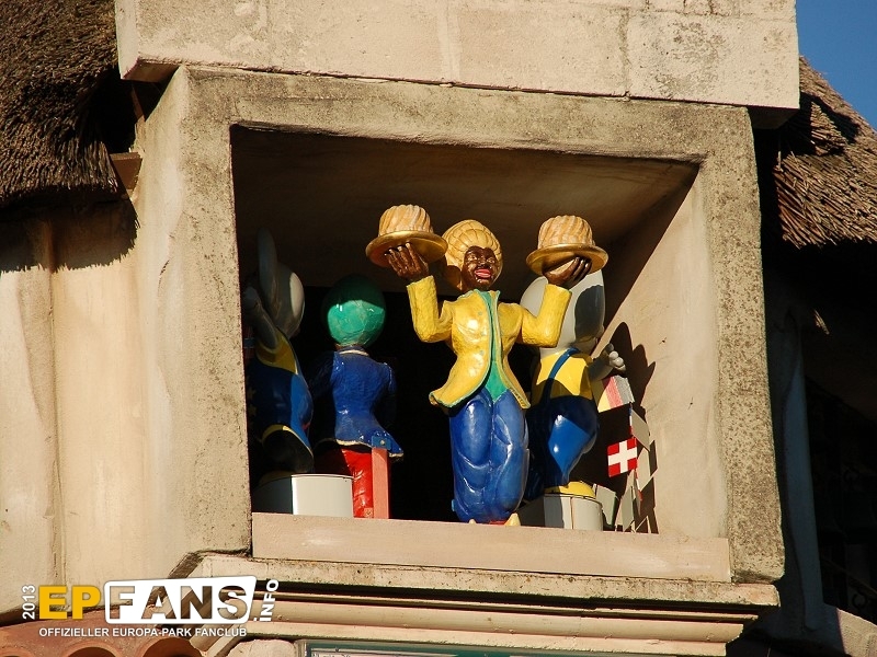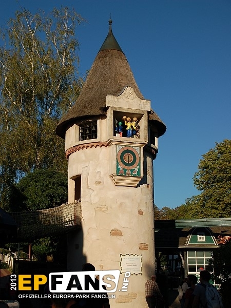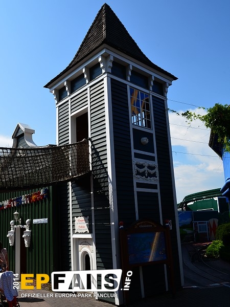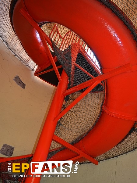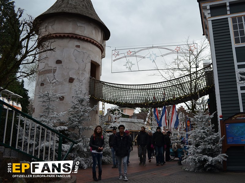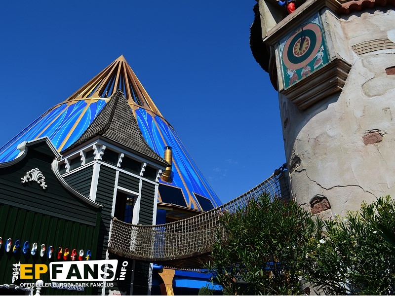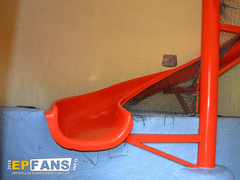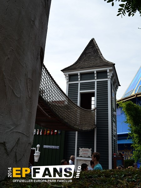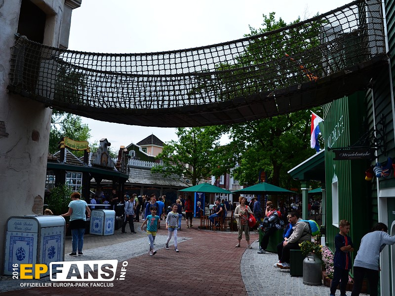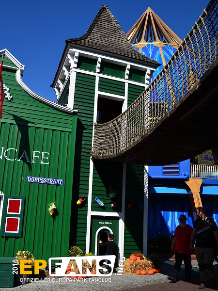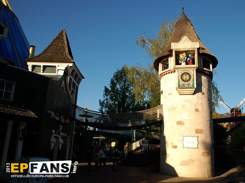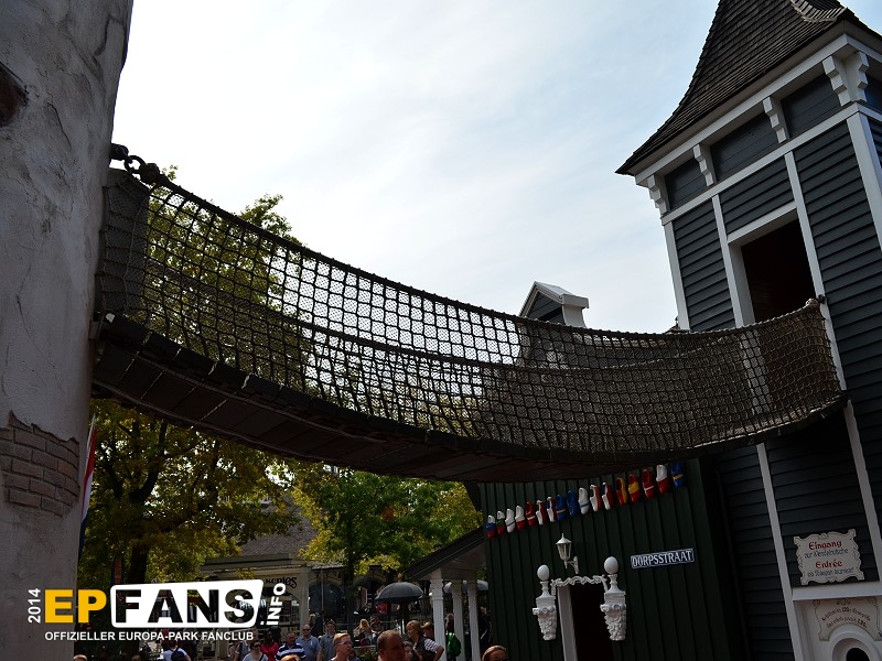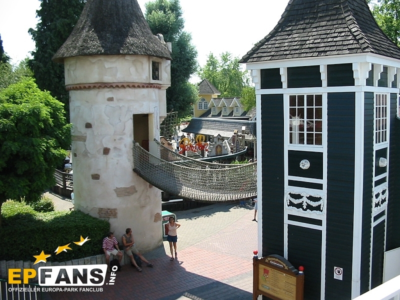Wackelbrücke mit WendelrutscheNiederlande - Betritt man den holländischen Themenbereich von Russland aus kommend, geht man unter der Wackelbrücke hindurch. Der Eingang ist für Kinder bis zu einer Größe von 1,20 m auf der rechten Seite im Haus. Hier führt eine Treppe hinauf zur Wackelbrücke. Überqueren die Kinder diese Brücke kommen sie linker Hand in einen Turm, in dem eine Wendelrutsche wieder hinabführt.