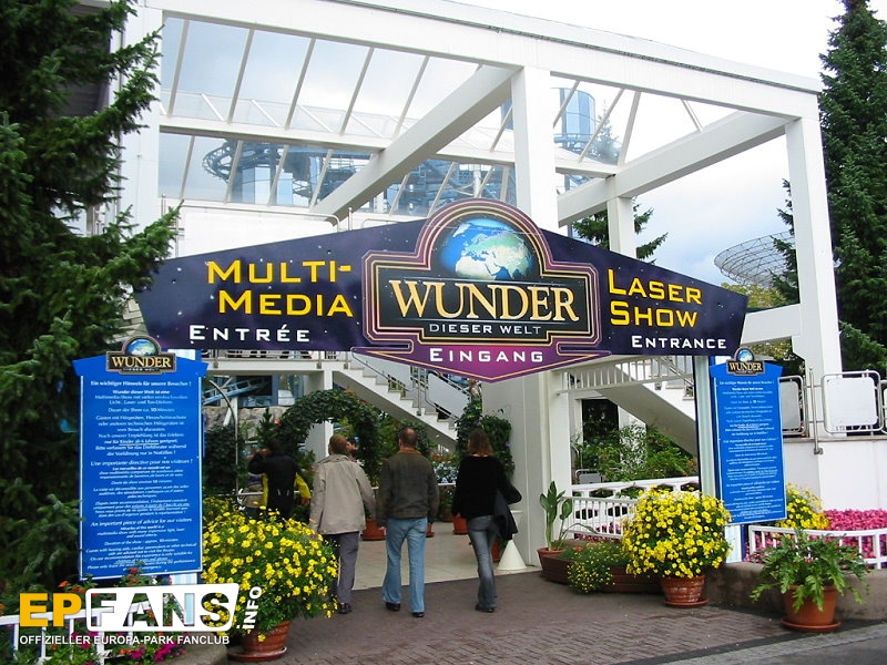 Multimedia-ShowChocoland - Ab der Saison 2004 bis zur Wintersaison 2009/2010 wurde im Drehtheater mit "Zeitreise" das vierte "Stück" gespielt. Erst 2003 wurde eine neue Show "Wunder dieser Welt" vorgestellt. Das erste Stück "Das Lila Geheimnis" erzählte die Entstehung der Milka-Schokolade und als zweites war das Stück "eMotional" mit viel Technik wie Laser oder Wasserfontänen zu sehen.Die Show war eine reine Lasershow, welche den Besuchern mit Lasertechnik die sieben Weltwunder zeigt. Der Hersteller ist LOBO electronic. Das Drehtheater befindet sich unterhalb der Glaspyramide. Sechs Säle mit 150 Sitzplätzen drehen sich um die Bühnen. Auf der Webseite von PRO-MUSIC-NEWS ist hierzu ein sehr interesanter Hintergrundbericht nachzulesen: Mit dem Multimediaspektakel "Wunder dieser Welt" ist der Europa Park in Rust um eine einzigartige Laserattraktion reicher. In nur drei Wochen Umbauzeit entstand unter Federführung des süddeutschen Laserspezialisten LOBO eine inhaltlich und technisch neuartige multimediale Erlebniswelt für die ganze Familie. LOBO-Geschäftsführer Bopp: "Mit insgesamt drei Festinstallationen und unzähligen Veranstaltungen verbindet uns mit dem Europa Park eine über Jahre gewachsene Geschäftsbeziehung, auf die wir sehr stolz sind. Umso mehr hat es uns gefreut, als wir nun den Auftrag erhalten haben, das Drehtheater unter Einsatz neuster Lasertechnologie komplett umzugestalten. Von der ersten Idee über das Storyboard, die komplette Musik-, Video und Multimediaproduktion, die Realisierung vor Ort bis hin zu ergänzenden Dienstleistungen für Öffentlichkeitsarbeit und Aussengestaltung lieferte LOBO alles aus einer Hand." Der Besucher betritt die Attraktion durch einen verwundenen Tunnel, der nur vereinzelt mit Lichteffekten und Spiegeln ausgestattetet ist, um die Augen schonend an die Dunkelheit zu gewöhnen. Nach kurzer Wartezeit betritt man einen Saal, der auf den ersten Blick wie ein Kino anmutet. Kaum geht jedoch das Licht aus, wird die Leinwand durchsichtig. Inmitten einer mit Technik vollgestopften Maschine erscheint ein liebenswürdig überdrehter Professor, der den Zuschauern stolz on der Erfindung einer Zeitmaschine berichtet. Noch ehe er weiter ins Detail gehen kann, setzt seine von kindlicher Neugier getriebene Tochter den Mechanismus der Zeitmaschine in Gang. Ihr dicht auf den Fersen begleiten die Zuschauer den Professor auf eine rund 10-minütige Reise durch die Zeit und erleben unterwegs die 7 Weltwunder der Antike sowie die Weltwunder der Neuzeit. Erst im letzten Moment gelingt es dem Professor mit einem kleinen Umweg über die Zukunft wieder in den Europa Park zu finden. Der technische Aufwand im Hintergrund ist beachtlich: Eine zentrale Laseranlage speist über Glasfaser insgesamt 6 digitale und praktisch wartungsfrei arbeitende Laserprojektoren, wovon zwei beweglich gelagert sind und einer auf einem Industrieroboter montiert ist. Kopfbewegte Scheinwerfer, Diaprojektoren, Videobeamer und eine Fülle an Licht- und Spezialeffekten binden den Besucher ins Geschehen ein. Die zur Projektion genutzten Leinwände sind in Schienen geführt oder lassen sich in Sekundenschnelle im Bühnenboden versenken. Gesteuert wird die gesamte Technik von einem zentralen Steuerrechner des Typs Lacon-5. Nur Fachleuten wird es auffallen, dass die Steuer- und Lasertechnik gekonnt in die Szenerie der Zeitmaschine integriert worden ist. Aber auch die Konstruktion des Theaters ist nicht ohne : Mit jedem Zeitsprung wird der Zuschauerraum unbemerkt in eine komplett neue Szenerie transportiert. So finden sich die Besucher nach Verlassen des Labors zunächst in einer Umgebung wieder, in der in einer hologramm-ähnlichen Projektion die Sieben Weltwunder präsentiert werden. Im nächsten Raum inszeniert ein wahres Feuerwerk an technischen Highlights die Weltwunder der Neuzeit und eine dreidimensionale Welt aus Laserlicht und Video. Über einen Flug durch den Weltraum geht es in die Schlussszene, die in enger Anlehnung an die charakteristische Außenfassade der Attraktion gestaltet worden ist. Manchen Zuschauern fällt erst beim Verlassen der Attraktion auf, dass sich das gesamte Theater mit ihnen an einen ganz anderen Ort bewegt hat. Ein internationales Team von über 30 kreativen Köpfen, Technikern und Software-Entwicklern war über fast ein Jahr an der Fertigstellung des Spektakels beteiligt. Regisseur Alexander Hennig: "Vom Projektmanagement her glich die Show einer großen Filmproduktion. Die besondere Herausforderung lag darin begründet, die unterschiedlichsten Darstellungsformen und neuen technischen Möglichkeiten des Mediums Laser zu einem harmonischen Ganzen zu verschmelzen. Insbesondere der Einsatz der von LOBO neu entwickelten Scanline Laser Video-Technologie, die erstmals die Darstellung hochauflösender Videoinhalte mit normalen Laserprojektoren ermöglicht, erwies sich in der Praxis als ein wahrer Quantensprung im Lasershowdesign." Während noch Zeichner Bild für Bild die Bewegungen der Tochter in Tausenden von Einzelbildern entwarfen, digitalisierten und colorierten sechs Personen die Ergebnisse sofort in den LOBO Studios. Die meisten Weltwunder und Gebäude sind direkt auf der Workstation Lacon-5 als dreidimensionale Objekte ausgearbeitet worden. Nur das Brüsseler Atomium, zwei antike Städte sowie einige Schriftzüge entstanden auf PC-basierten 3D-Animationsprogrammen, die dank der im Lacon-5 Lieferumfang enthaltenen Softwaretools ein lasergerechtes Ergebnis lieferten. Während in den Tonstudios noch an den Soundtracks und Sprachaufnahmen gefeilt wurde, waren in den LOBO Studios die Videoaufzeichnungen mit den Darstellern für die Scanline-Projektionen in vollem Gange. Da Entwickler und Designer bei LOBO unter einem Dach zusammenarbeiten, konnten Software-Erweiterungen für Spezialeffekte zügig nach Bedarf implementiert werden. Der Professor ist als dreidimensionale Cartoon-Figur entwickelt worden, die teils mit Laser und teils mit konventionellen Videoprojekto
