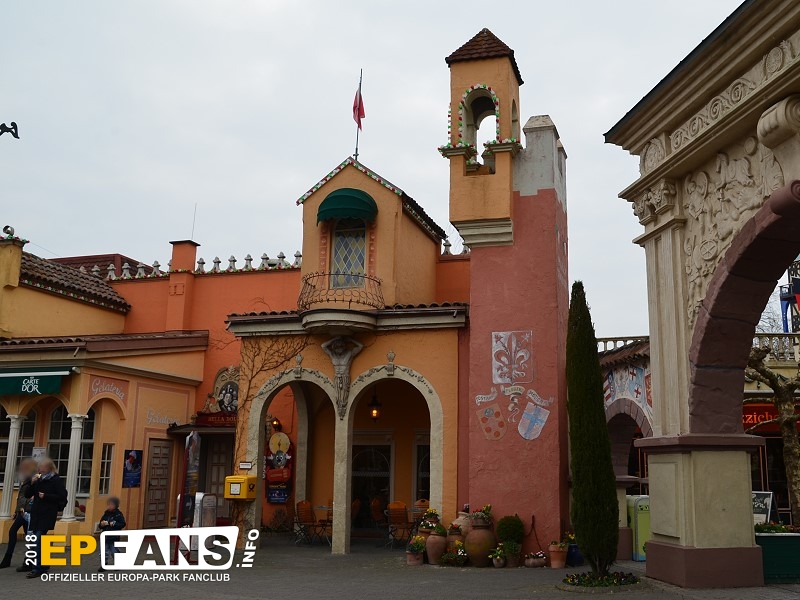 Direkt am Torbogen hat sich 2007 das Cafe Benedetto niedergelassen. Mit aufwendigen Wandmalereien und gemütlicher Einrichtung lädt es in den Mittagsstunden zum Verweilen ein.