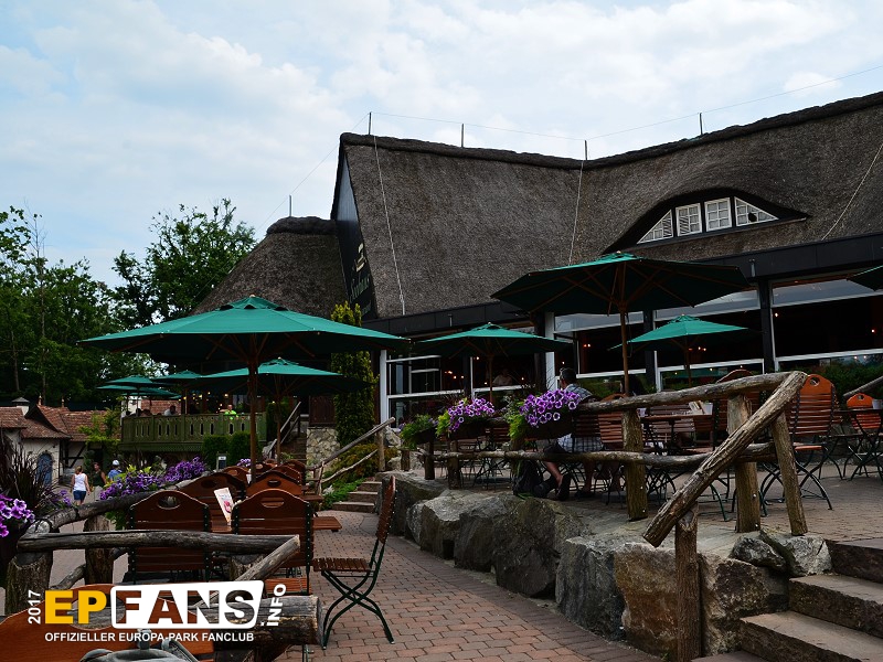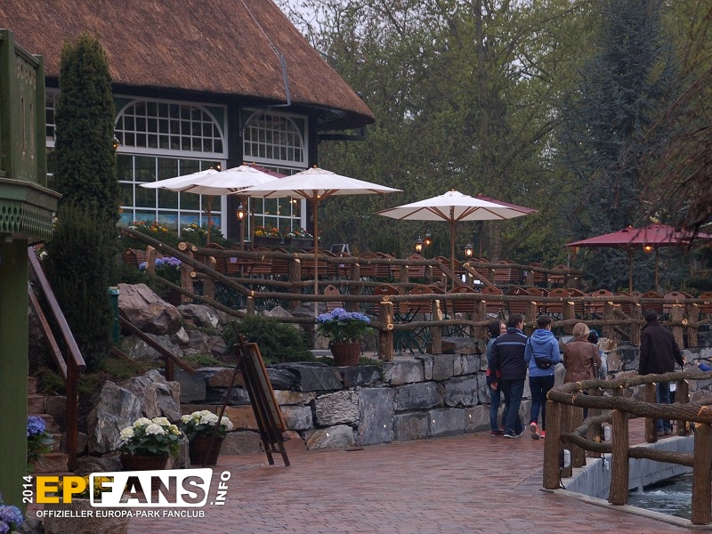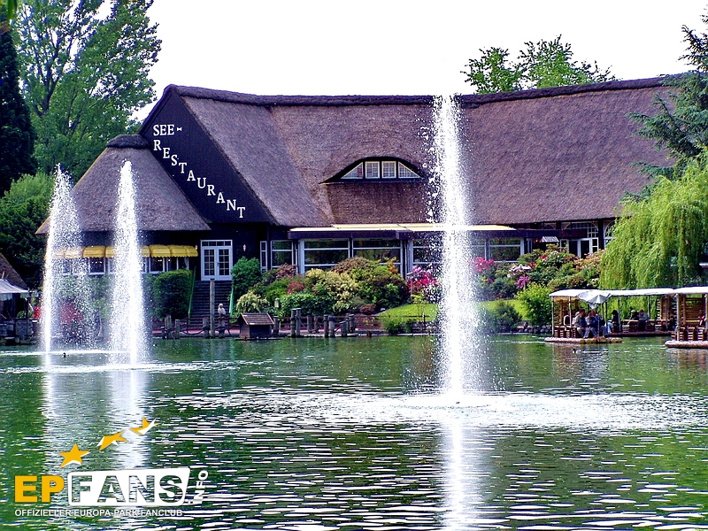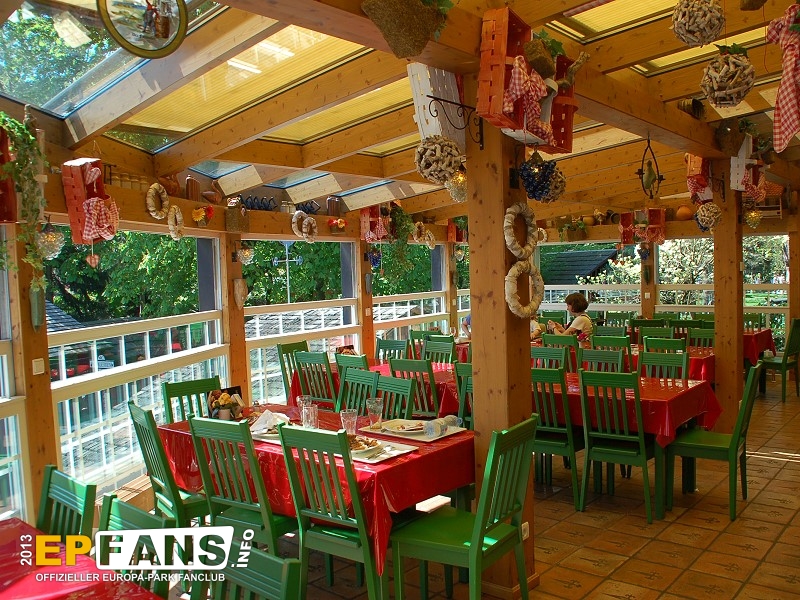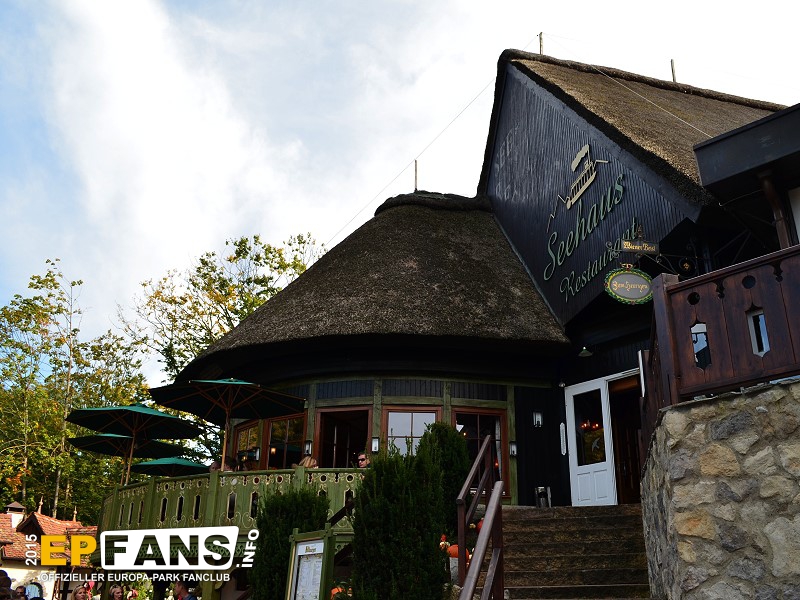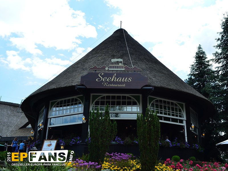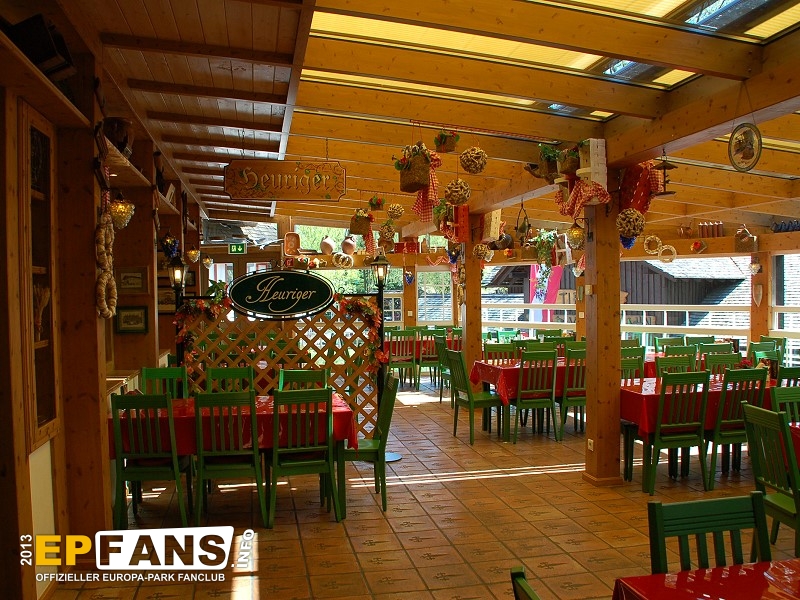 Das urgemütliche "Wiener Beisl" im Seehaus Restaurant wurde um den lauschigen Weingarten "Zum Heurigen" ergänzt und bietet sowohl einen wunderschönen Blick auf den Europa-Park See als auch auf die Familienattraktion Wiener Wellenflieger in Gestalt eines Steinpilzes.