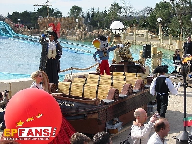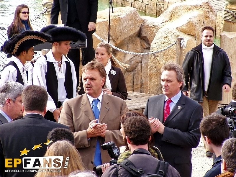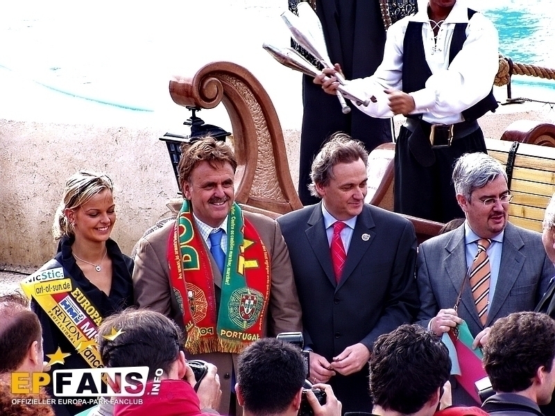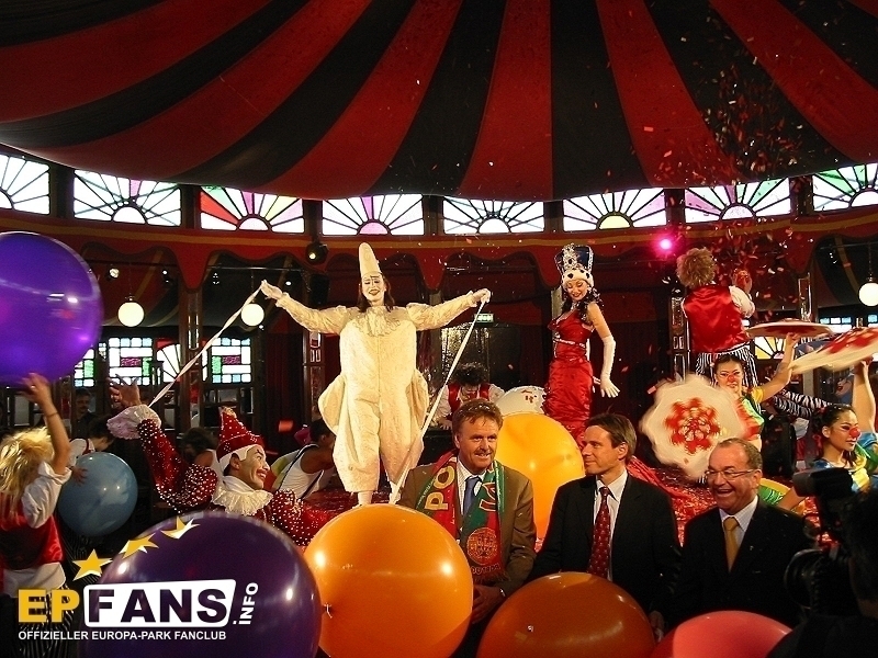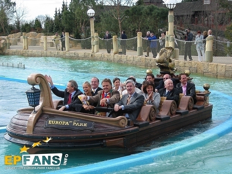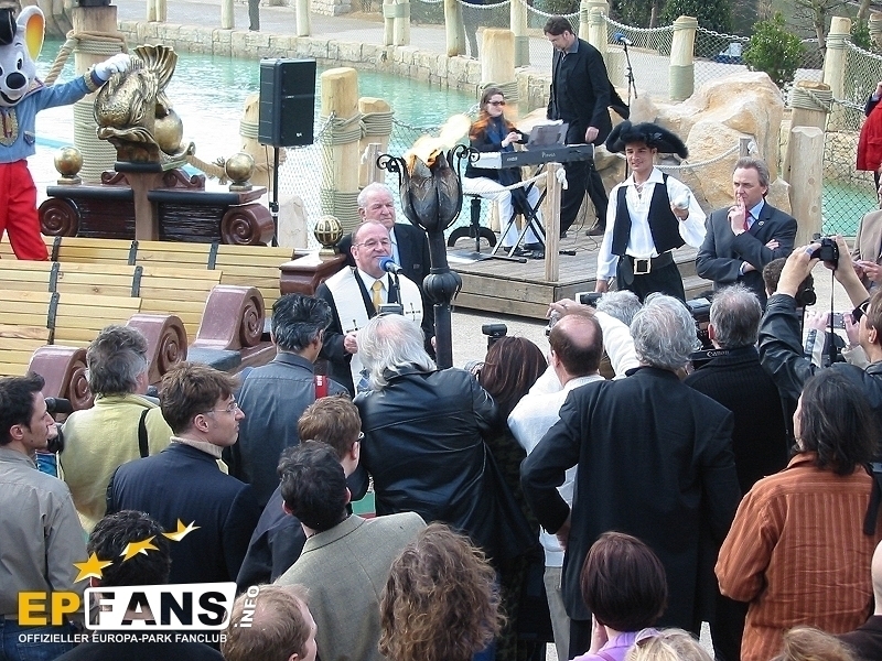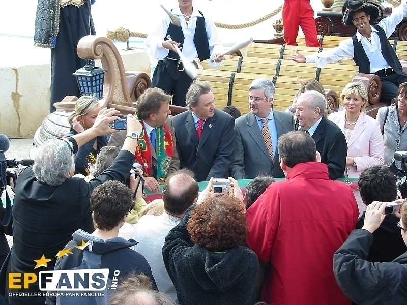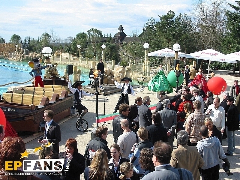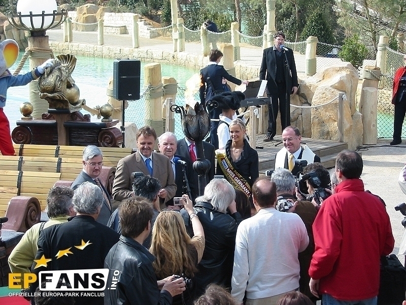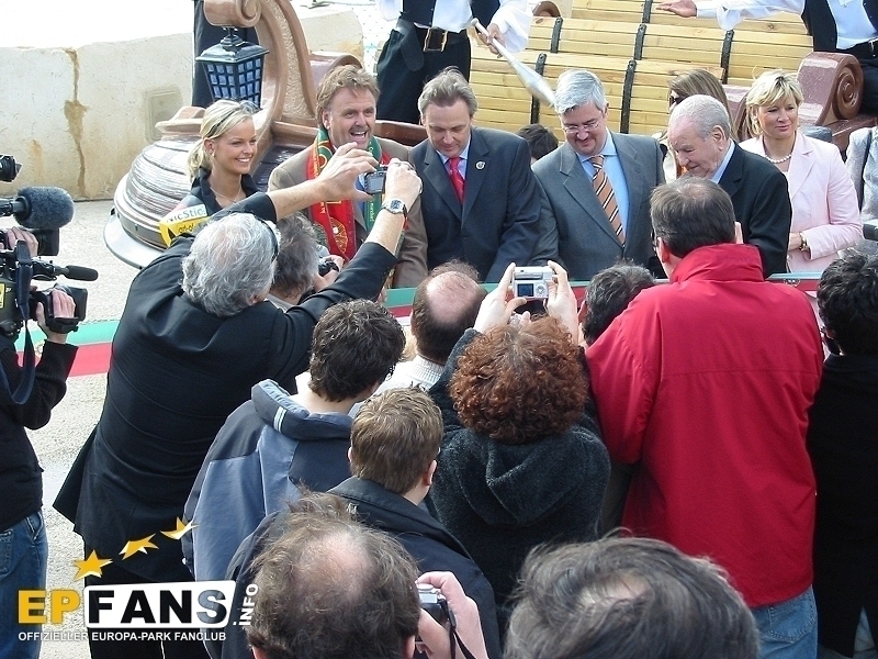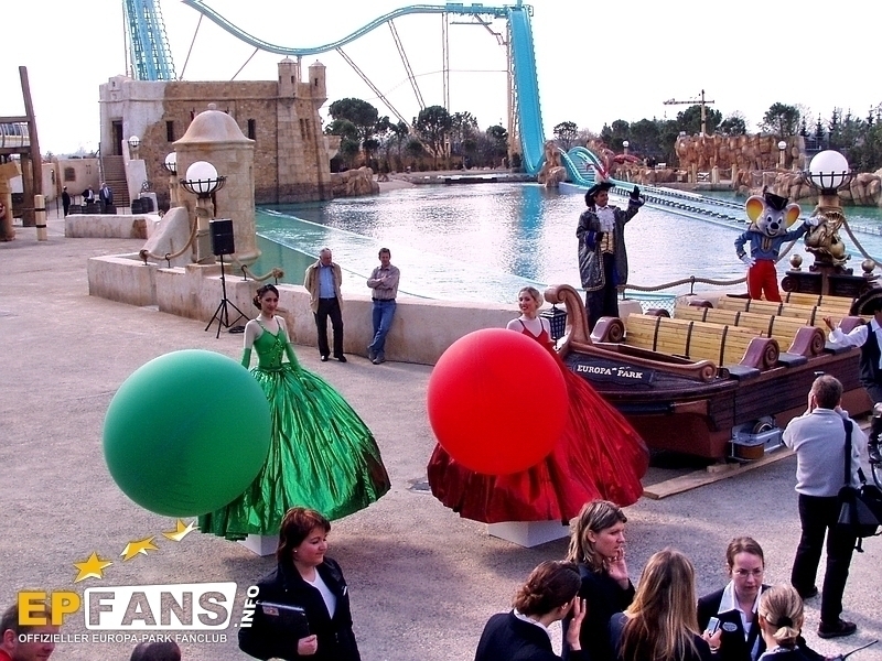 Pressekonferenz 2005Am 17. März fand im Europa-Park die alljährliche Eröffnungspressekonferenz statt. Um 10 Uhr versammelten sich Presse, Partner und Freunde der Familien Mack sowie einige Fans im Hotel Colosseo. Mit Kaffee, Sekt und Snacks wurden wir zum Konferenzsaal "La Scala" gelockt, wo dann auch gleich die diversen Vorträge der Geschäftsleitung des Parks stattfanden. Das Hauptthema war dabei das 30-jährige Jubiläum des Freizeitparks. Geschichten, Fakten und schliesslich ein Geburtstagsfilm erinnerten an die Anfängen im Jahr 1975. Die neue Attraktion "Atlantica" sowie Portugal wurden nur am Rande erwähnt, denn wir würden die Bahn ja bald live testen können. Zum Abschluss dieser Runde kam Roland Mack auf die politische Lage in Europa und Deutschland zu sprechen und verglich sie mit dem Europa-Park. Nachdem die Anwesenden alle nötigen sachlichen Informationen erhalten hatten, konnte zum praktischen Teil des Tages übergehen... der Eröffnung von Atlantica.Atlantica: Promi-Boot Von ausserhalb des Parks aus gesehen ist die neue Bahn wahrlich keine Schönheit. Da machte man sich schon etwas Sorgen, wie das denn von innen wirken wird. Doch die Sorgen waren nicht berechtigt. Vor allem die Bäume und Büsche im Hintergrund der Bahn verdecken die Sicht auf den Stützenwald über dem Hotelparkplatz. Die portugiesische Thematisierung ist wieder mal sehr gelungen. Trotz den ?hnlichkeiten mit Griechenland, kommt in Portugal eine andere Stimmung rüber. Wenn der Park mit dem Themenbereich dort weiterfährt, wo er nun begonnen hat, kann man sich durchaus auf die Erweiterung freuen. Nun noch ein paar Worte zur Bahn selber. Die beiden Drops (erst rückwärts, dann vorwärts) machen richtig Spass. Auch die Befürchtung, man werde nicht nass, hat sich nicht bewahrheitet. Wer nass werden will, sitzt hinten aussen. Trotz momentan voller Bremsleistung der Magnetbremsen wird man schon recht nass... im Sommer wird`s also dann so richtig lustig. Die Einfahrten auf die Drehplattformen sind sehr langsam und langweilig. Man wartet mit Sehnsucht dass es endlich losgeht. Ansonsten ist Atlantica für das was es ist, nämlich ein SuperSplash, sehr funny und bietet mit aussergewöhnlichen Fahrelementen Sensationen für die ganze Familie. Wir haben noch verschwiegen, dass wir nach den Vorträgen im Tagungsraum "La Scala" nicht direkt zu Atlantica gelaufen sind, sondern vor der "Via Rustica", der Unterführung vom Colosseo zum Park, einen Zwischenhalt vor einem wahrlich ungewöhnlichen Geburtstags-geschenk eingelegt haben. Der Schweizer Künstler Benno Schulthess hat den Familien Mack zum 30. Jubiläum des Europa-Parks den "Mack-Brunnen" geschenkt. Auf einer ovalen Schiene dreht eine riesige Chromstahlkugel im Vier-Minuten-Takt ihre Runden. Angetrieben wird die Kugel durch ein Wasserrad, welches ganz symbolisch mit 30 Sternen die 30 Jahre des Europa-Parks und mit acht Schaufeln die acht Mack-Generationen widerspiegelt. Nachts soll der Brunnen dann beleuchtet werden. Der Europa-Park hat letztes Jahr im Confertainment-Bereich ein zweistelliges Umsatzplus erreicht. Logische Konsequenz daraus ist es, die Möglichkeiten für Tagungen im Europa-Park zu erweitern. Beim Haupteingang, neben dem Europa-Park-Dome, wurde das historische Spiegelzelt "Traumpalast" aus dem Jahre 1920 des Zirkus Roncalli aufgebaut. Diese Erweiterung im Confertainment-Segment ist gleichzeitig auch ein Blick "back to the roots" auf die Firmengeschichte der Mack Rides GmbH. Schliesslich begann das Unternehmen mit dem Bau von Wagen für Schausteller und Zirkusleute. Das 23eckige Spiegelzelt hat einen Durchmesser von 16,3 Meter und bietet Platz für rund 200 Gäste. Der Zugang ist direkt von aussen oder aber durch das Foyer des EP-Domes. Natürlich haben sich im Park wieder zahlreiche weitere Kleinigkeiten geändert. So hat die Wildwasserbahn neue Boote erhalten. Sie haben mehr Wurzeln dran und sehen deshalb etwas wilder aus. Komplett erneuert wurde der Bodenbelag der Deutschen Allee. Auch dieses Jahr wurde an einigen Attraktionen renoviert und erweitert. Die Puppen der Old 99 Fahrt haben nämlich nun alle neue Kleidchen und auch in den Kamtschatka Airline Klub wurde weiter investiert. Diese Saison ist ein neuer Film zu sehen und in der Kabine wurden zusätzliche Effekte eingebaut. An vielen Ecken des Park sieht man frische Farbe wie beispielsweise im spanischen Themenbereich oder an der Schweizer Bobbahn.