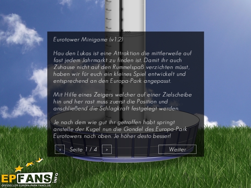 Eurotower MinigameHau den Lukas ist eine Attraktion, die mittlerweile auf fast jedem Jahrmarkt zu finden ist. Damit ihr auch Zuhause nicht auf den Rummelspa? verzichten müsst, haben wir für euch ein kleines Spiel entwickelt und entsprechend an den Europa-Park angepasst.