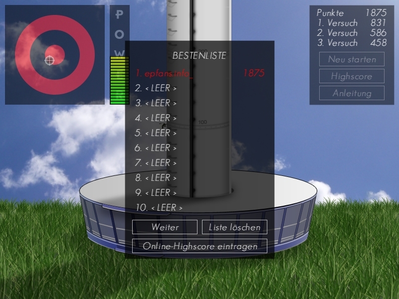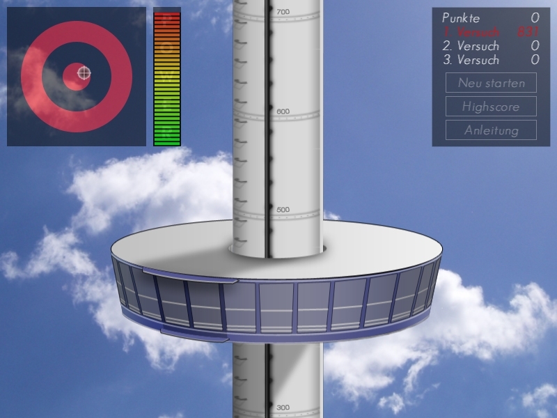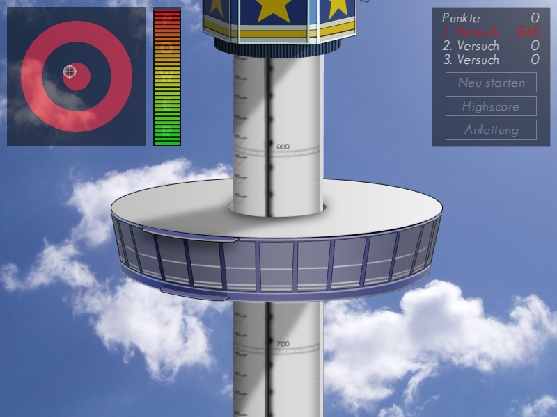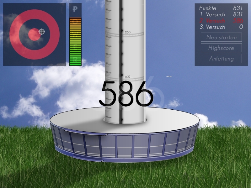 Je nachdem wie gut ihr getroffen habt springt anstelle der Kugel nun die Gondel des Europa-Park Eurotowers nach oben. Je höher desto besser! Es stehen euch insgesamt 3 Versuche zur Verfügung, um möglichst viel Punkte zu erreichen, welche ihr anschlie?end sogar mit eurem Namen in unserem Online Highscore veröffentlichen könnt.