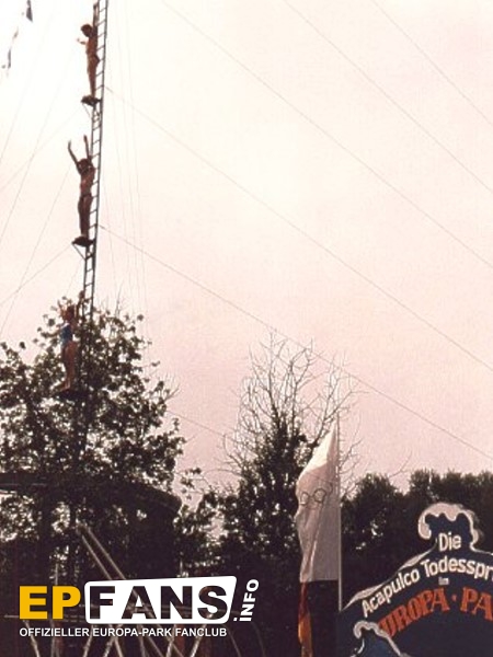 Acapulco Todesspringer1988 konnte man erstmals die Acapulco Todesspringer im Europa Park erleben. Im Acapulco Stadion konnten 2500 Personen das Programm verfolgen. Das Stadion stand 1988 dort, wo sich heute der Französische Themenbereich befindet. In der Saison 1989 wurde mit Eurosat der erste Teil des Französischen Themenbereiches eröffnet und somit musste das Stadion zum heutigen Standort des Eisstadions umziehen. Am neuen Standort konnte man die Springer von 1989 bis 1993 erleben. In der Saison 1994 waren die Acapulco Todesspringer im ehemaligen Delfinarium zu sehen. Dann verschwanden sie aus dem Parkbild. 1988 gehörten laut EP-Zeitung 15/1988 zum Springerteam "High-Diving-Eagles" 5 Männer und eine Frau. In der 30minütigen Show wurden Sprünge aus verschiedensten Höhen präsentiert. Man sprang in ein 3 m tiefes Wasserbecken. Zu den Highlights zählten der Massensprung und der Flammensprung. Beim Massensprung sprangen alle Springer gleichzeitig aus unterschiedlichen Höhen in das Wasserbecken. Für den Flammensprung zündete sich ein Springer an und sprang anschließend ins Wasser. Dabei war der Springer vor den Flammen und der Hitze von über 650 °C nur durch einen Jogginganzug aus Baumwolle geschützt.