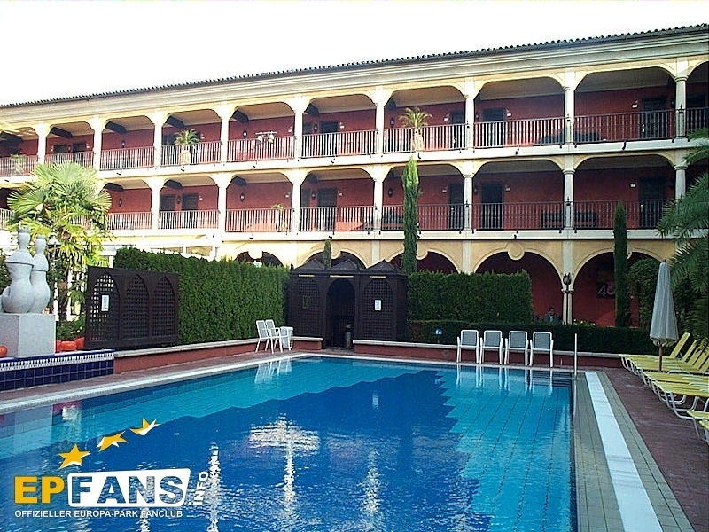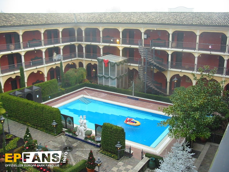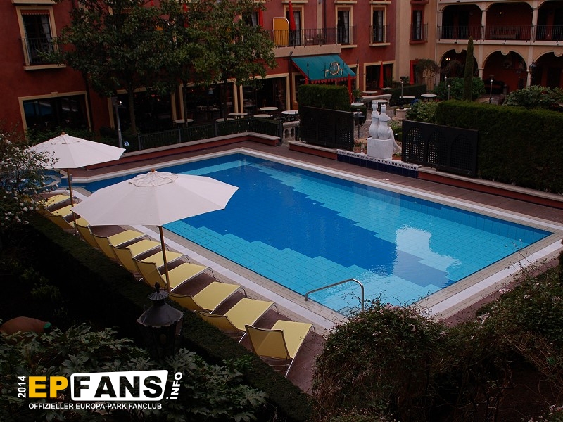 Der Pool ist von Mai bis September auf 28°C beheizt. Er lädt dann täglich von 07:00 - 22:00 Uhr zum Schwimmen im Innenhof ein.