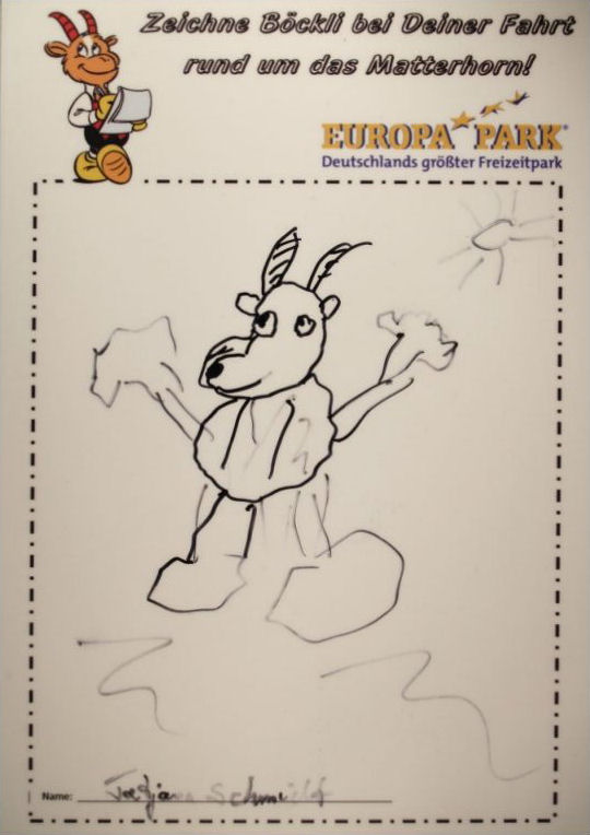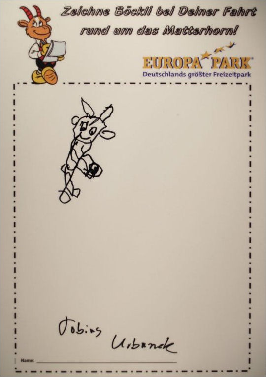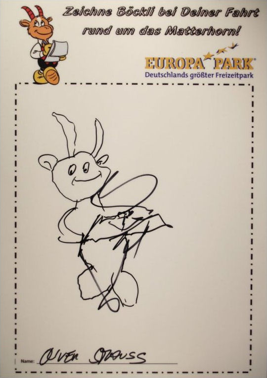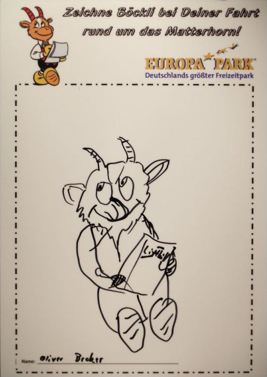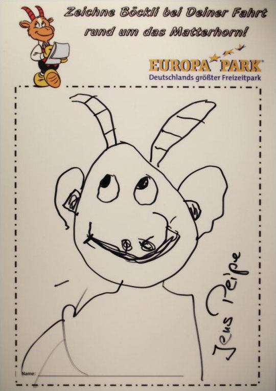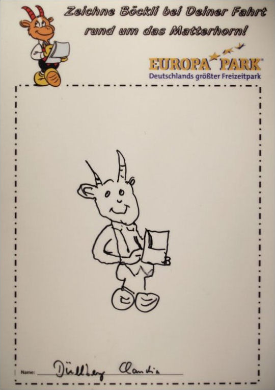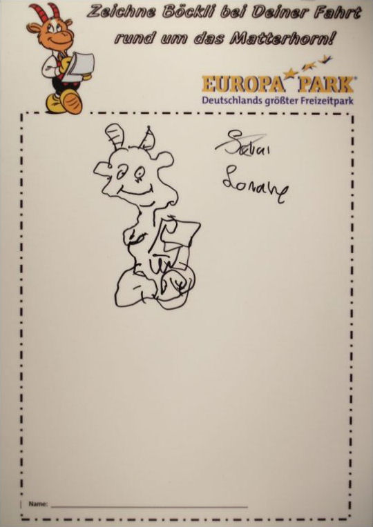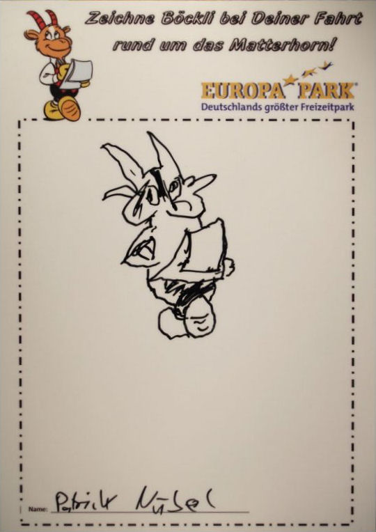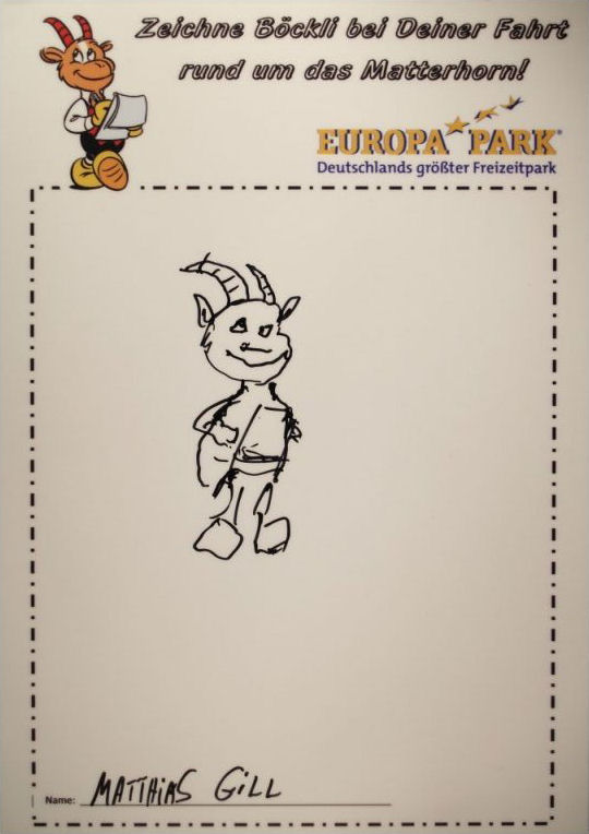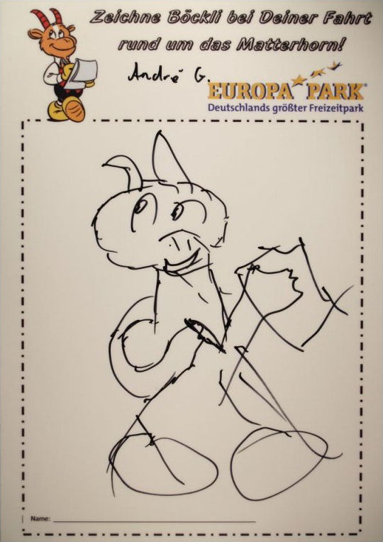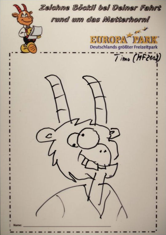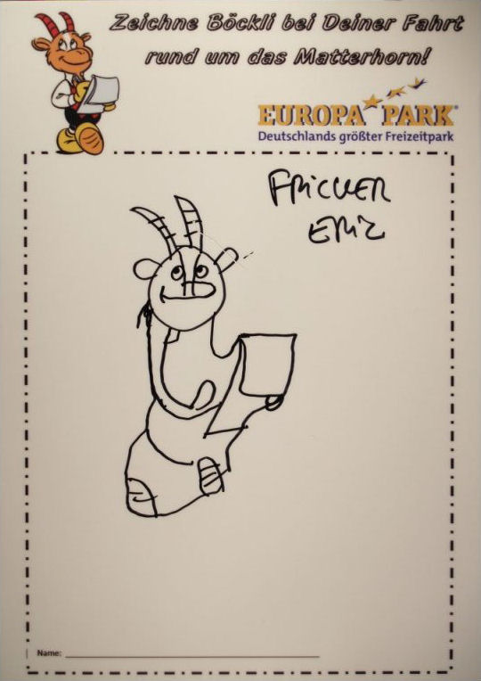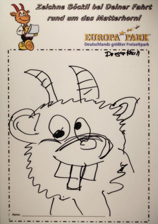 coasterbaer: 07.05.2008 - 18:20 E-N-D-L-I-C-H !!! Habe schon befürchtet,diese Kunstwerke wären für immer verschollen gewesen. Was man den Bildern leider nicht ansehen kann, ist der Spa?, den wir bei der "Kunststunde" auf dem Matterhorn-Blitz hatten. Auch wenn Zeichnen nicht zu meinen Steckenpferden gehört: Böckli malen während der Achterbahnfahrt - das war die stärkste Idee, die Ihr bisher auf einem Fantreffen hattet. Ich habe Tränen gelacht bei der Fahrt. Freue mich schon auf's nächste Treffen und zittere schon jetzt, dass ich Zeit habe, wieder dabei zu sein.