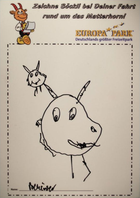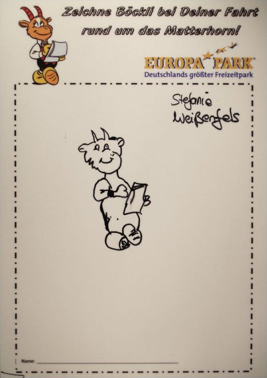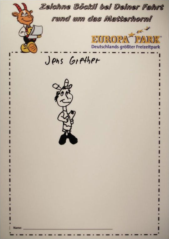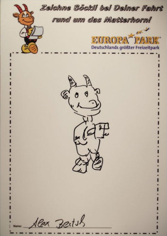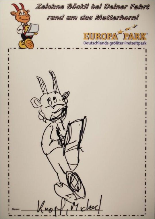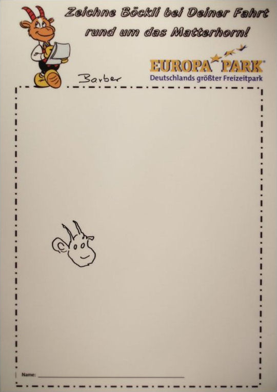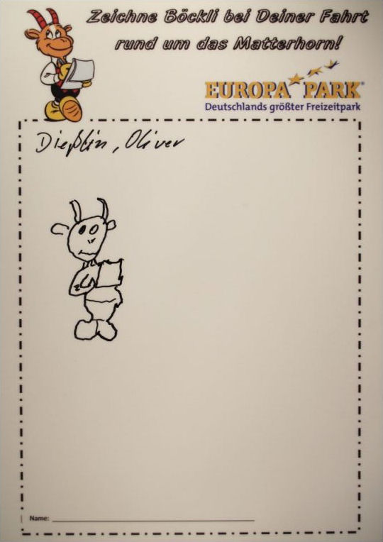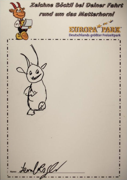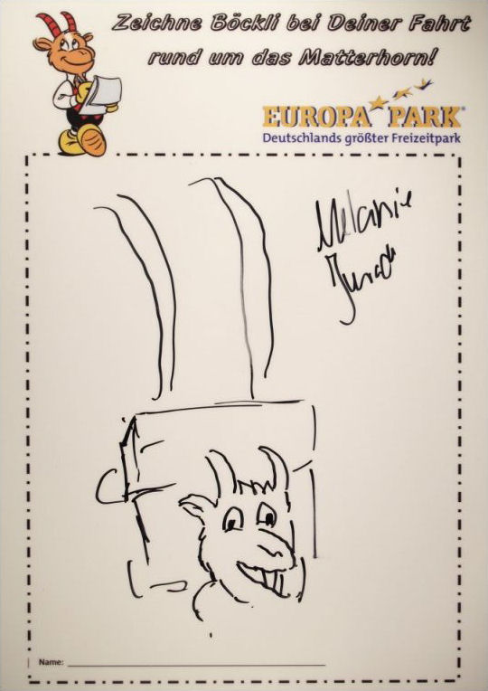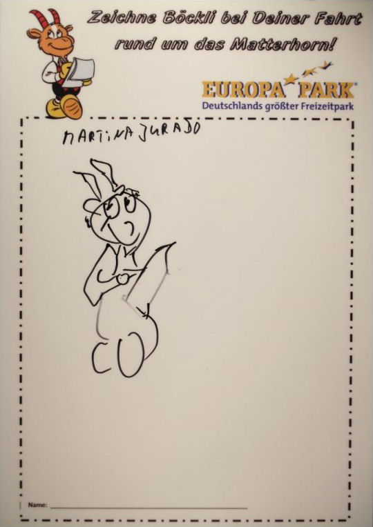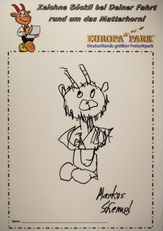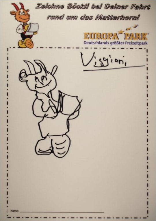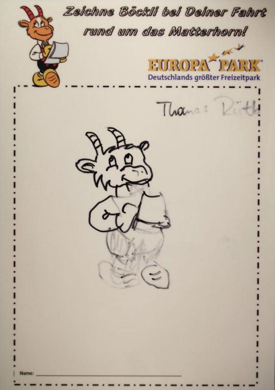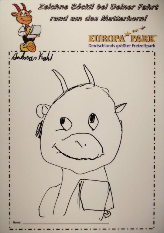 coasterbaer: 07.05.2008 - 18:20 E-N-D-L-I-C-H !!! Habe schon befürchtet,diese Kunstwerke wären für immer verschollen gewesen. Was man den Bildern leider nicht ansehen kann, ist der Spa?, den wir bei der "Kunststunde" auf dem Matterhorn-Blitz hatten. Auch wenn Zeichnen nicht zu meinen Steckenpferden gehört: Böckli malen während der Achterbahnfahrt - das war die stärkste Idee, die Ihr bisher auf einem Fantreffen hattet. Ich habe Tränen gelacht bei der Fahrt. Freue mich schon auf's nächste Treffen und zittere schon jetzt, dass ich Zeit habe, wieder dabei zu sein.