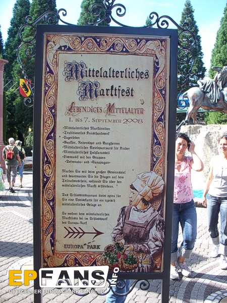 An den zahlreichen Baustellen (Neue Zufahrtsstra?e, Festsaal etc.) wird flei?ig gearbeitet. Wir haben für Euch wieder einige aktuelle Fotoimpressionen. Am Montag hat das Mittelalterliche Marktfest im Europa Park begonnen. Bis zum 07.09.08 ist nun eine Zeitreise ins Mittelalter in der Kulisse des Schlossparks möglich. Für die richtige Stimmung sorgen u.a. Gaukler, Jongleure und Musikgruppen. Natürlich fehlt auch das passende gastronomische Angebot nicht.