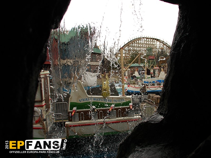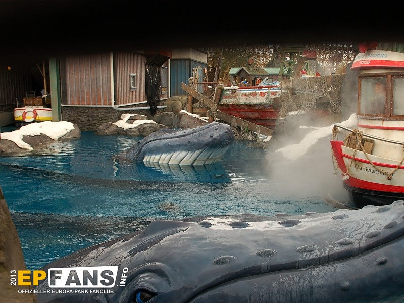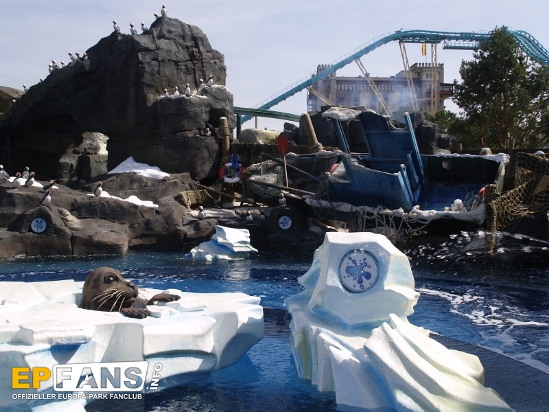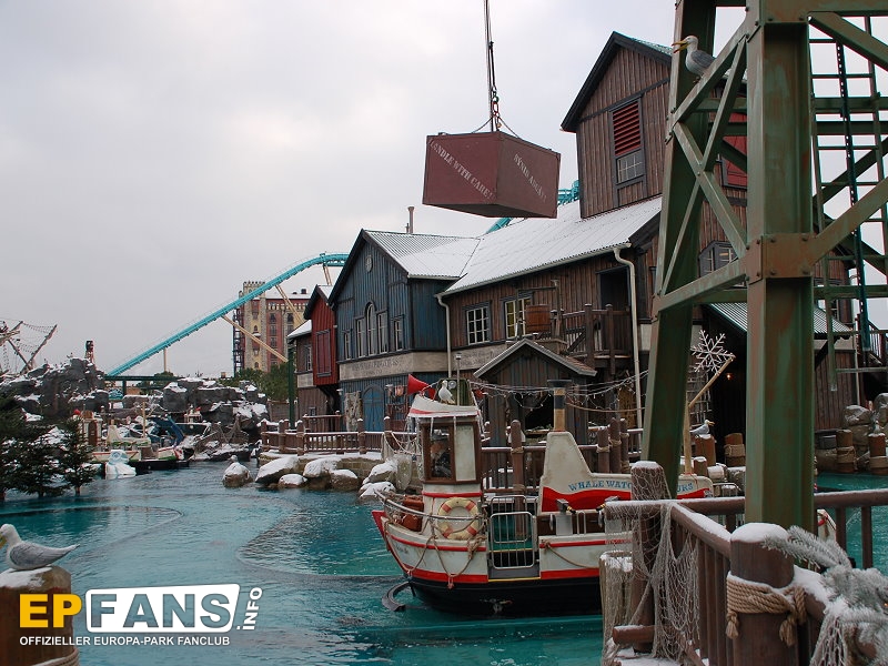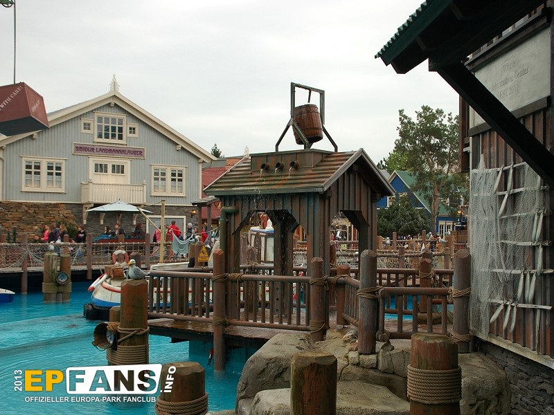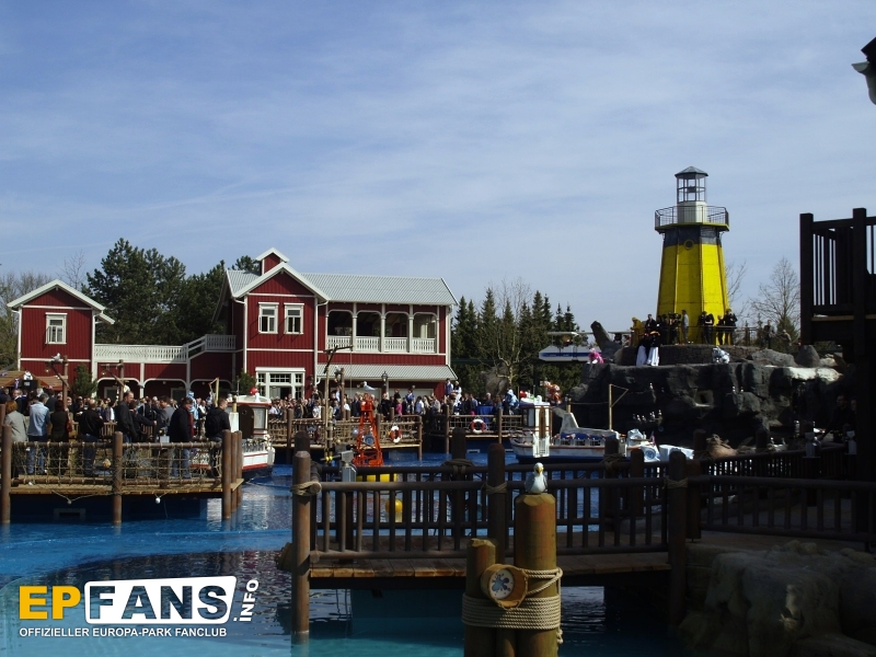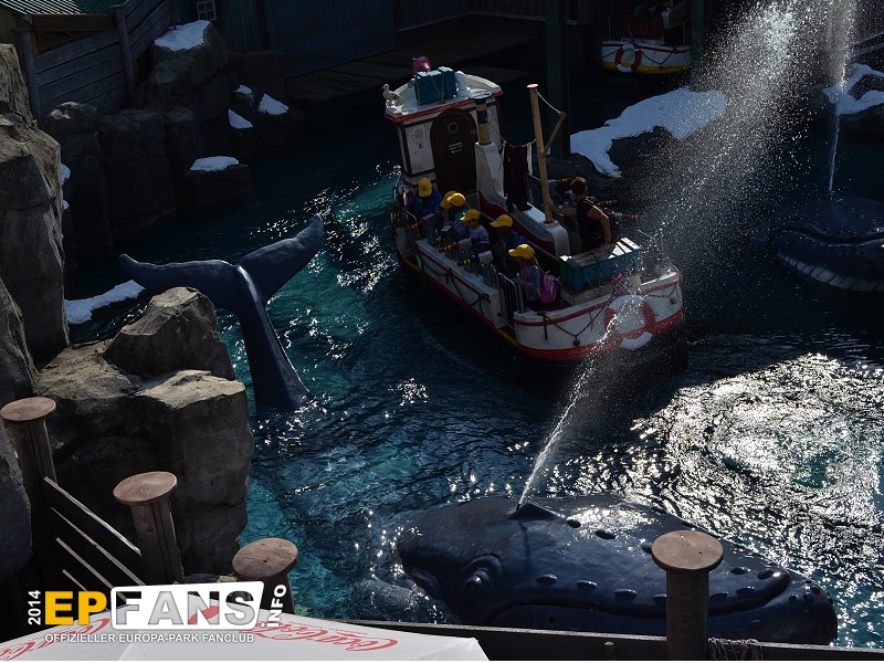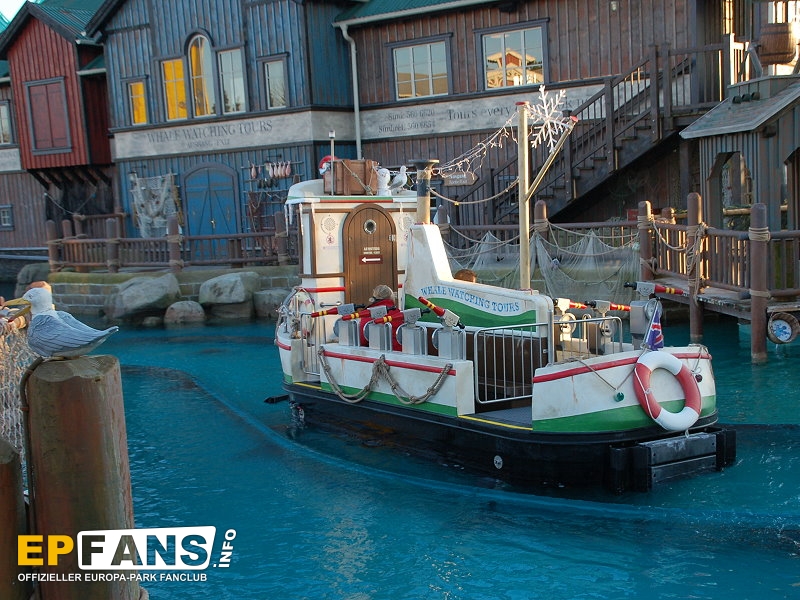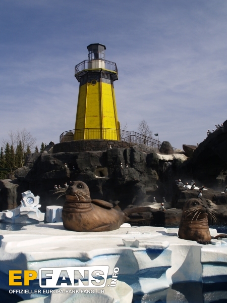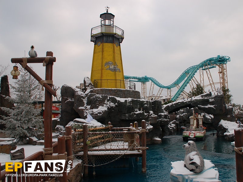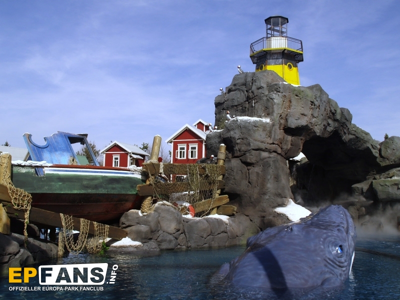 Whale Adventures - Splash ToursDie im Jahr 2010 im Themenbereich Island eröffnete interaktive Bootsfahrt bot ein spritziges Vergnügen für jung und alt. Mit Hilfe von Wasserkanonen, die durch Ankurbeln betätigt wurden, sollten in erster Linie die Zielscheiben während der Fahrt getroffen werden. Sie waren jedoch auch ein wichtiges Abwehrmittel gegen die Wasserkanonen, die entweder von anderen Boote oder von außen von den zuschauenden Parkgästen auf das eigene Boot gerichtet wurden. Das Gepäck wie z.B. ein Rucksack konnte in den Booten wassergeschützt verstaut werden. Die Strecke startete im Hafen und führte vorbei an Eisschollen mit Robben. Kurz vorm Ende passierte man einen Felsen mit zahlreichen Papageientauchern und fuhr anschließend noch an den Walen vorbei, bevor der Hafen wieder erreicht wurde. Ein 12 m hoher Leuchturm gehörte ebenfalls zur Kulisse dieser Attraktion. In der darunter liegenden Grotte führte eine Wendeltreppe hinauf auf die im Erdgeschoss des Leuchtturms liegende Aussichtsplattform. Von hier hatte man einen herrlichen und trockenen Ausblick auf die gesamte Anlage.