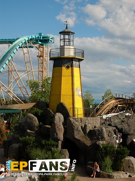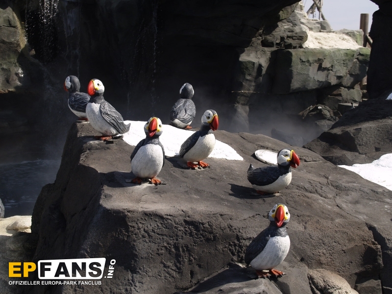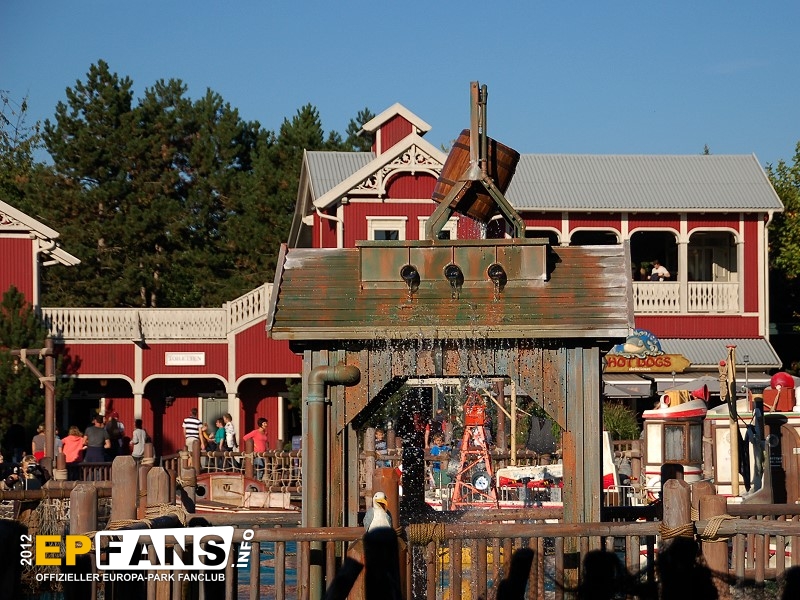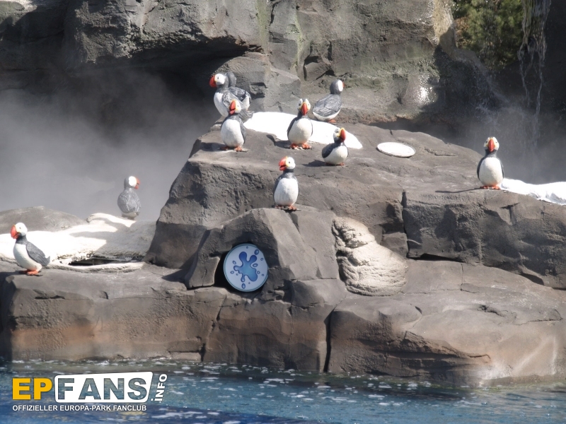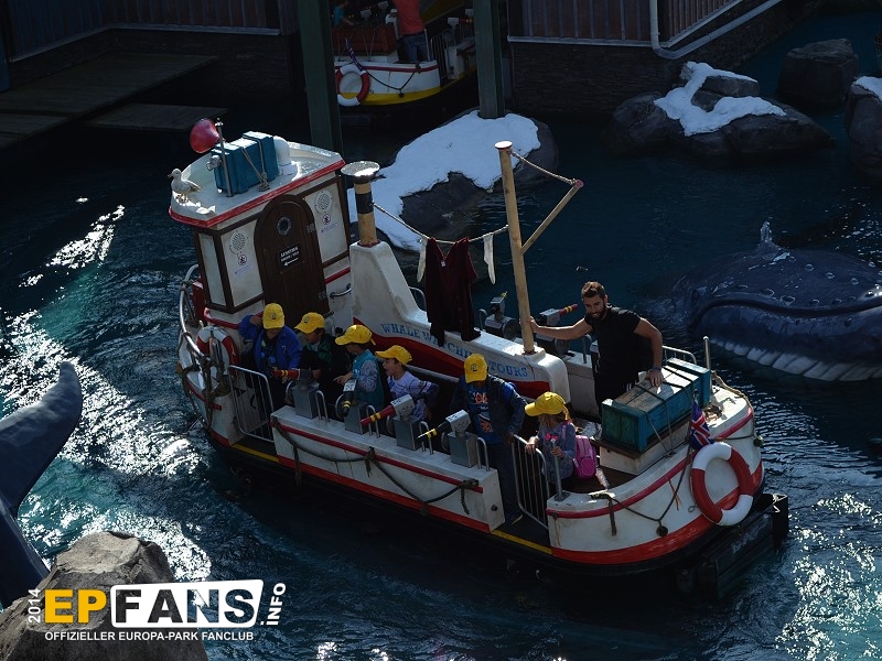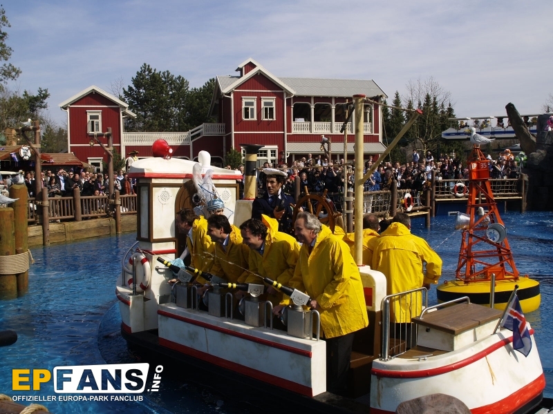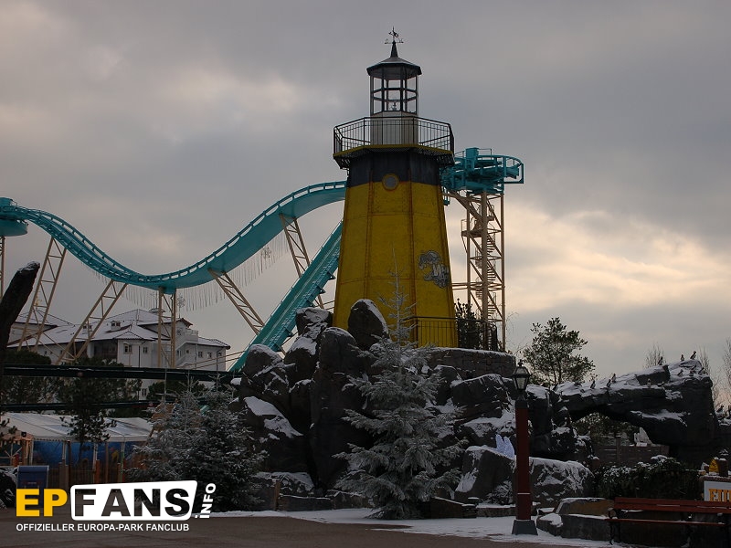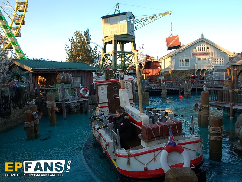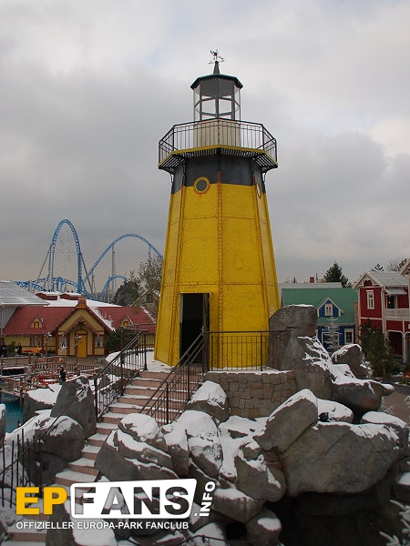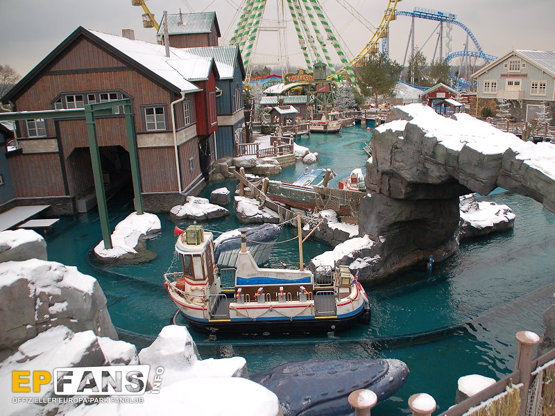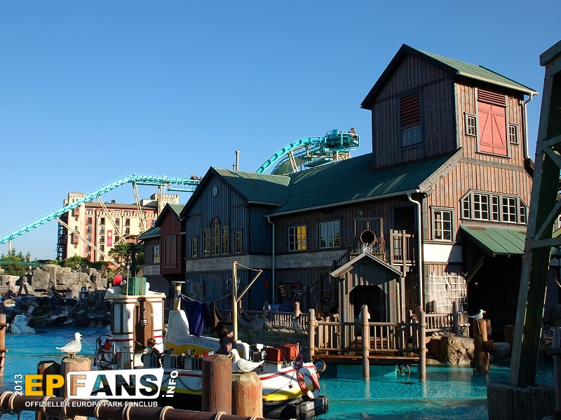 Whale Adventures - Splash ToursDie im Jahr 2010 im Themenbereich Island eröffnete interaktive Bootsfahrt bot ein spritziges Vergnügen für jung und alt. Mit Hilfe von Wasserkanonen, die durch Ankurbeln betätigt wurden, sollten in erster Linie die Zielscheiben während der Fahrt getroffen werden. Sie waren jedoch auch ein wichtiges Abwehrmittel gegen die Wasserkanonen, die entweder von anderen Boote oder von außen von den zuschauenden Parkgästen auf das eigene Boot gerichtet wurden. Das Gepäck wie z.B. ein Rucksack konnte in den Booten wassergeschützt verstaut werden. Die Strecke startete im Hafen und führte vorbei an Eisschollen mit Robben. Kurz vorm Ende passierte man einen Felsen mit zahlreichen Papageientauchern und fuhr anschließend noch an den Walen vorbei, bevor der Hafen wieder erreicht wurde. Ein 12 m hoher Leuchturm gehörte ebenfalls zur Kulisse dieser Attraktion. In der darunter liegenden Grotte führte eine Wendeltreppe hinauf auf die im Erdgeschoss des Leuchtturms liegende Aussichtsplattform. Von hier hatte man einen herrlichen und trockenen Ausblick auf die gesamte Anlage.