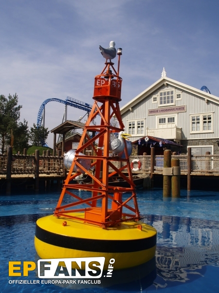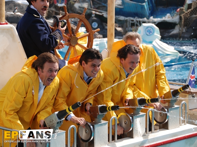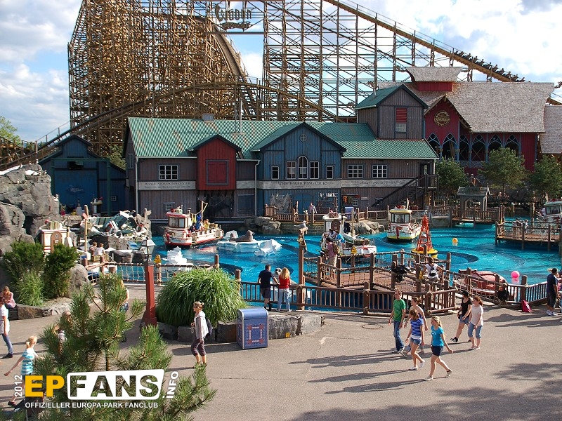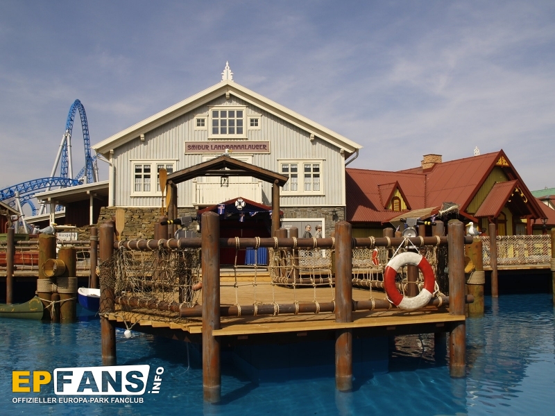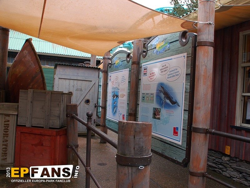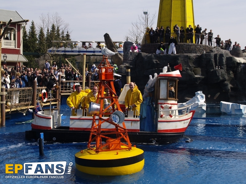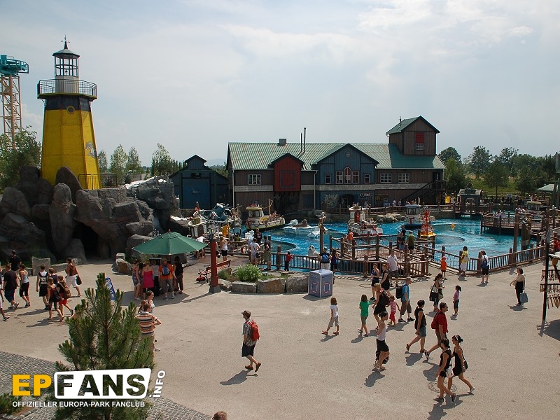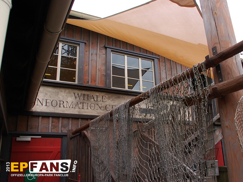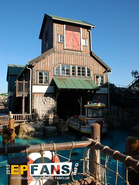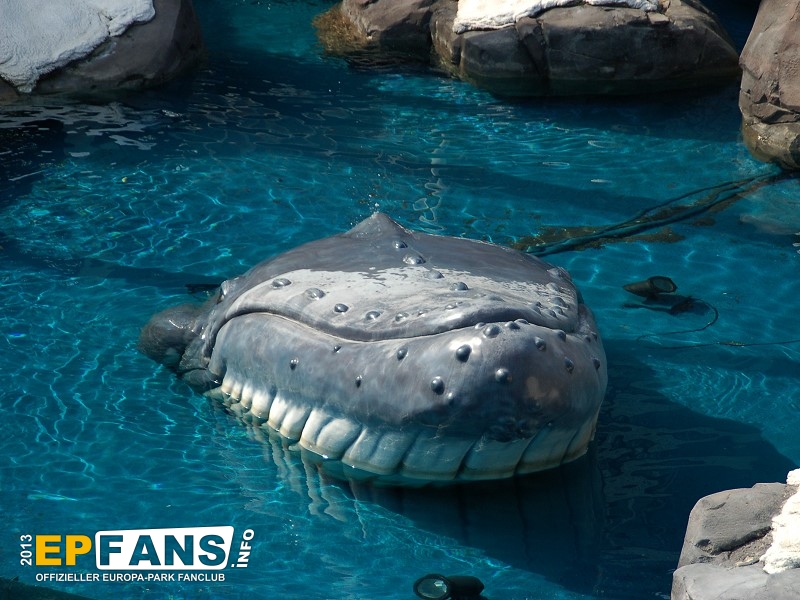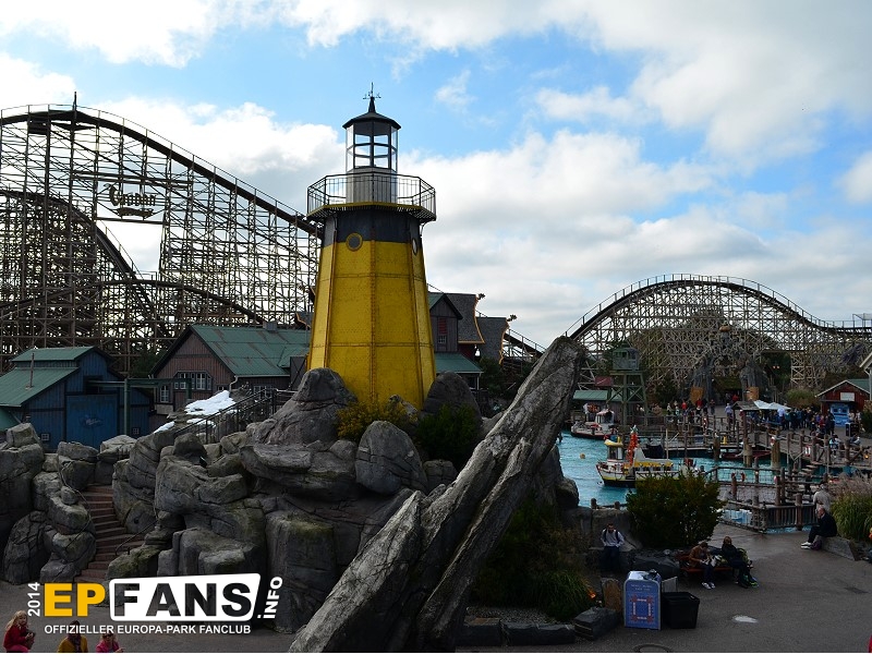 Whale Adventures - Splash ToursDie im Jahr 2010 im Themenbereich Island eröffnete interaktive Bootsfahrt bot ein spritziges Vergnügen für jung und alt. Mit Hilfe von Wasserkanonen, die durch Ankurbeln betätigt wurden, sollten in erster Linie die Zielscheiben während der Fahrt getroffen werden. Sie waren jedoch auch ein wichtiges Abwehrmittel gegen die Wasserkanonen, die entweder von anderen Boote oder von außen von den zuschauenden Parkgästen auf das eigene Boot gerichtet wurden. Das Gepäck wie z.B. ein Rucksack konnte in den Booten wassergeschützt verstaut werden. Die Strecke startete im Hafen und führte vorbei an Eisschollen mit Robben. Kurz vorm Ende passierte man einen Felsen mit zahlreichen Papageientauchern und fuhr anschließend noch an den Walen vorbei, bevor der Hafen wieder erreicht wurde. Ein 12 m hoher Leuchturm gehörte ebenfalls zur Kulisse dieser Attraktion. In der darunter liegenden Grotte führte eine Wendeltreppe hinauf auf die im Erdgeschoss des Leuchtturms liegende Aussichtsplattform. Von hier hatte man einen herrlichen und trockenen Ausblick auf die gesamte Anlage.
