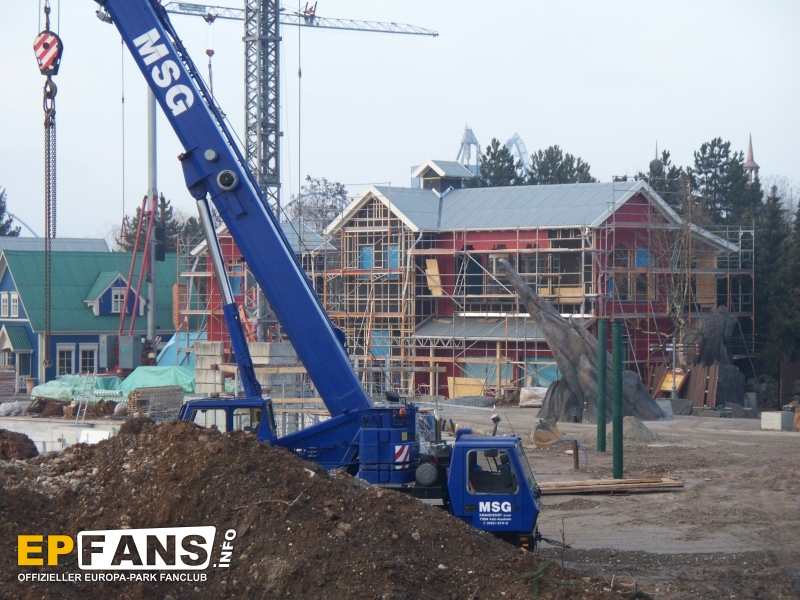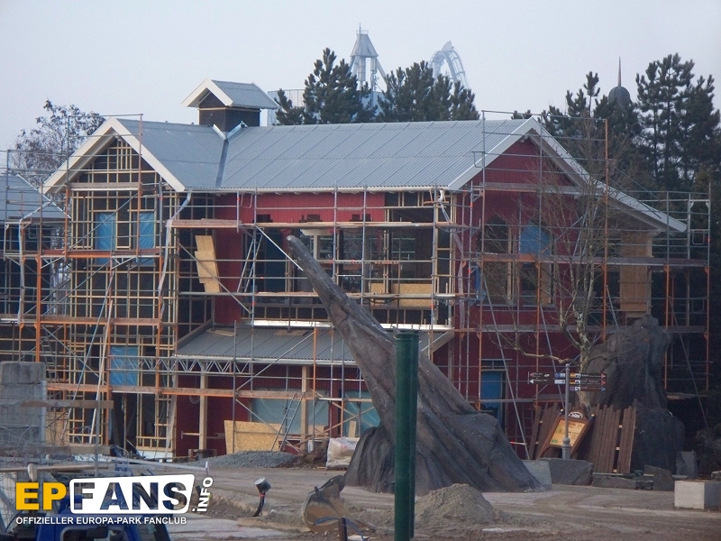 Und auch beim Stationsbau hat sich einiges getan. Das Hauptgebäude hat mittlerweile ein vollständiges Dach und immer mehr Gebäude werden errichtet. Auch wurde mittlerweile damit begonnen, erste Unterkonstruktionen für spätere Felsen zu montieren.