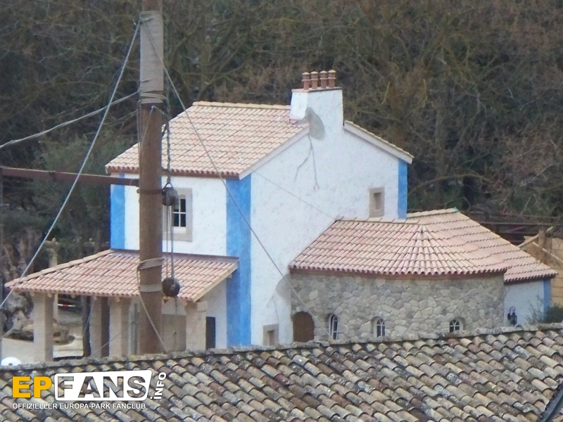 Die ehemalig grüne Wellblechwand nahe dem Lift der Tiroler Wildwasserbahn direkt nach der Edelsteingrotte wurde in dieser Saison im Stil einer spanischen Häuserfassade verkleidet.