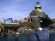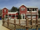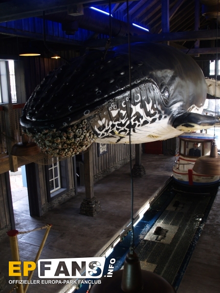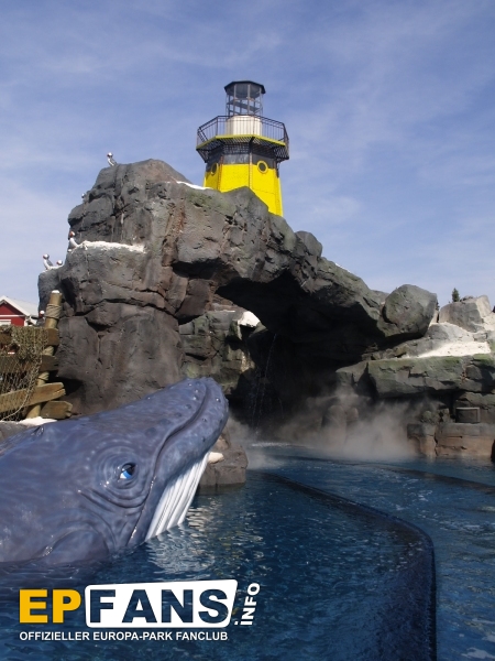 Thematisierung: isländisches Hafengebäude, Leuchtturm (12m), zwei Wale, Meer