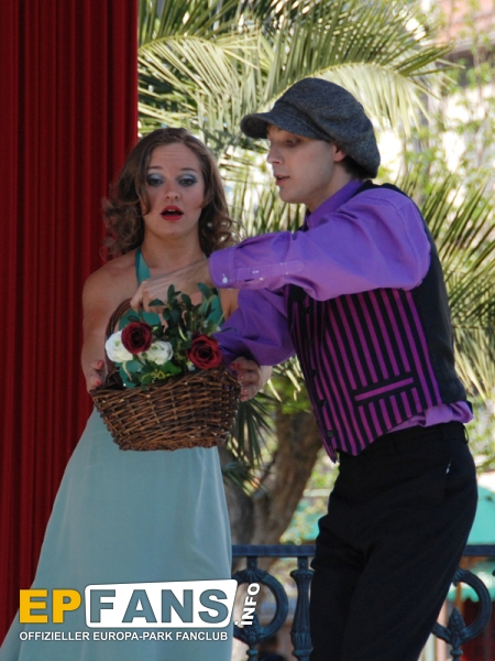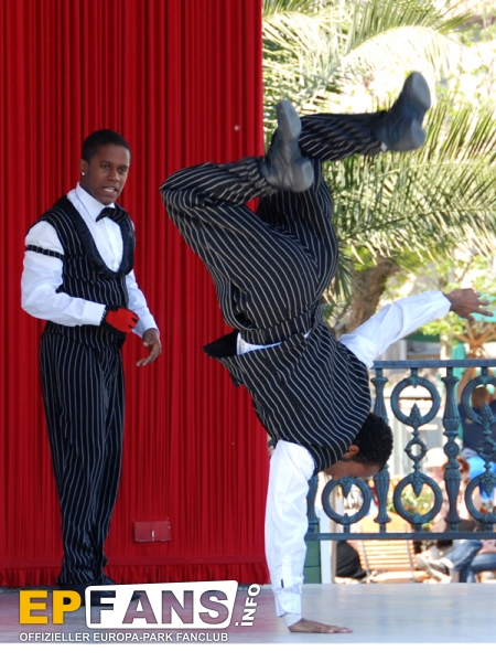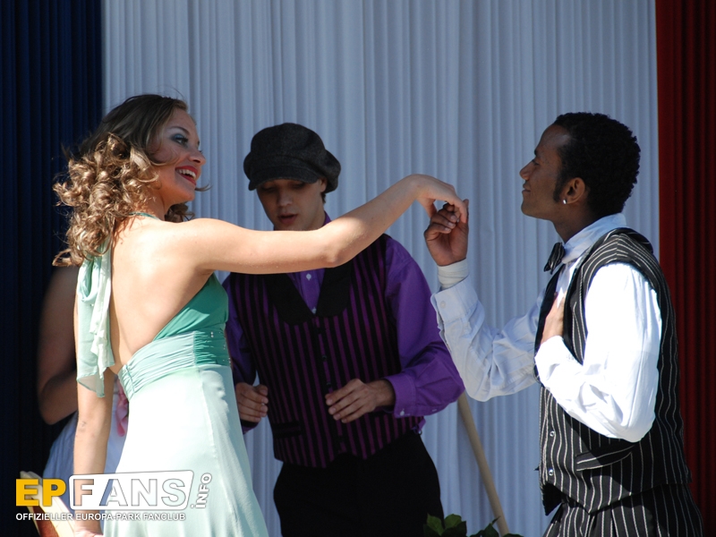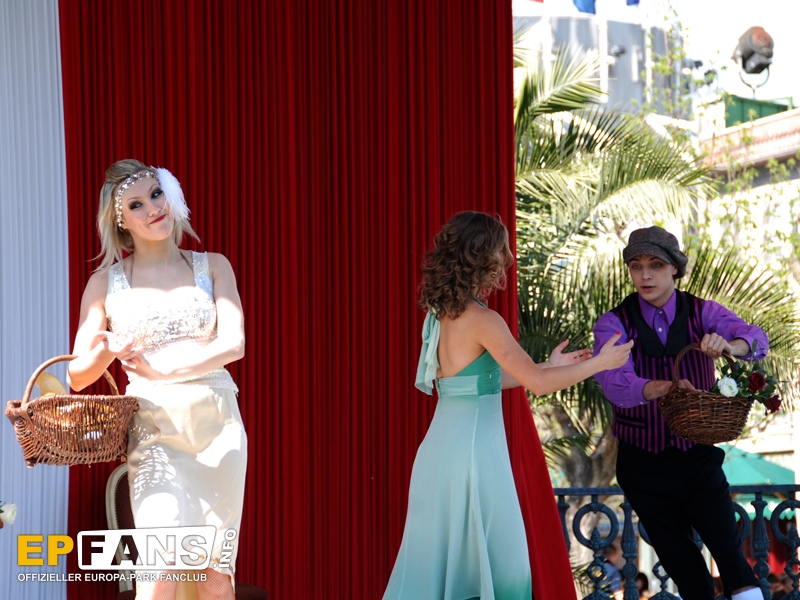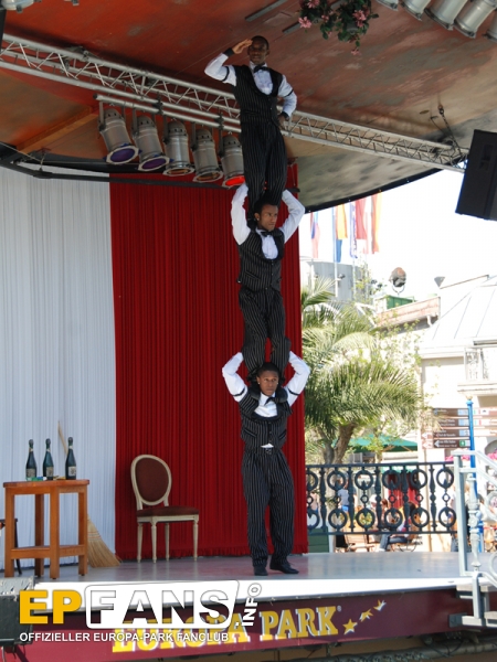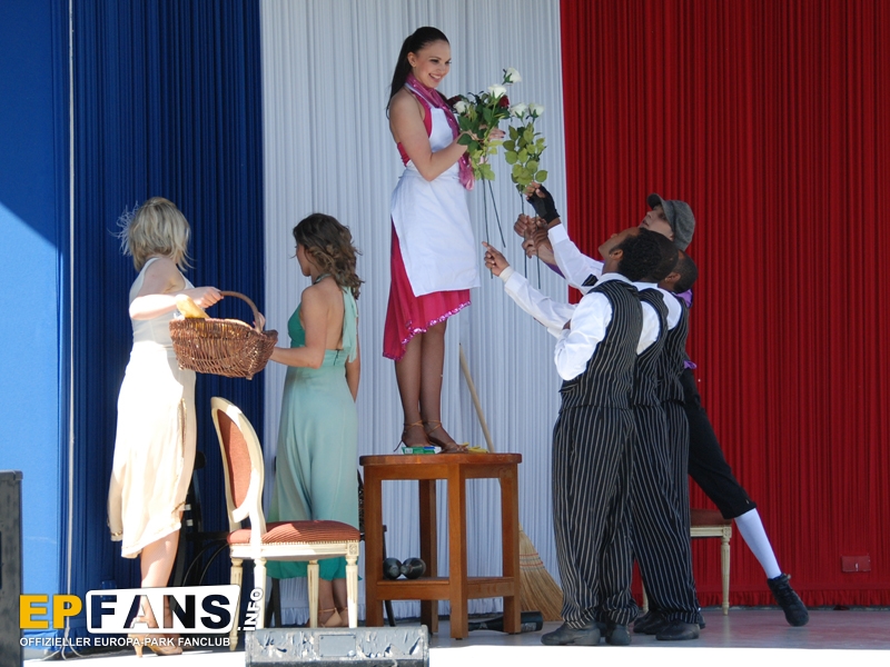 Tanz und Akrobatik 2010Die nachfolgenden Infos stammen noch aus der Saison 2010!Frankreich - Auf der Seebühne im französischen Themenbereich wird in der Saison 2010 einmal am Nachmittag (meist 15 Uhr) eine kurze Show unter dem Namen "Tanz und Akrobatik" aufgeführt. Eine Kombination von Tänzen des Europa-Park-Showballetts und artistischen Einlagen unterhalten sowohl die Gäste an den Tischen vor der Bühne wie auch vorbeigehende Parkbesucher. Die Show dauert ca. 15 Minuten.