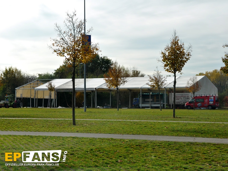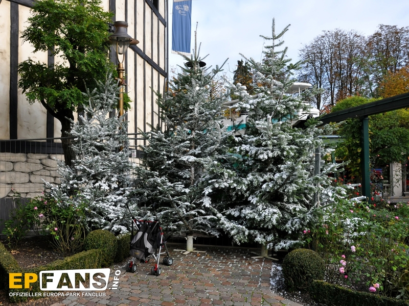 Auf dem gro?en Besucherparkplatz wurde wieder die Halle aufgebaut, in der die Weihnachtsbäume ihren edlen wei?en Flair erhalten. Die ersten Weihnachtsbäume wurden bereits im Park entdeckt. Sie verdecken die mobile Heizung des Globe Theaters.