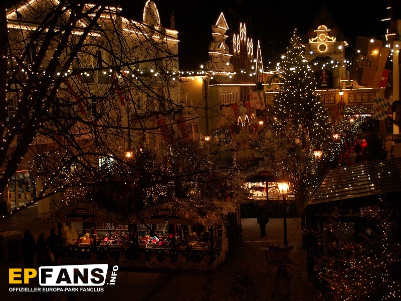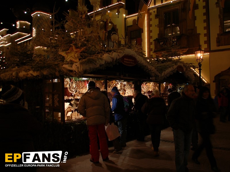 Weihnachtsmarkt *Es gibt etwas, das zur Weihnachtszeit einfach nicht fehlen darf: Ein Weihnachtmarkt!Auch der Europa-Park bietet seinen Gästen dieses Ereignis und baut jährlich in den Wintersaisons im Bereich der Deutschen Allee und auf dem Platz in Richtung italienischen Themenbereich zahlreiche kleine und größere Holzhütten auf. Das Angebot ist vielfältig: Während der Europa-Park selbst mit diversen Versorgungsständen für das gastronomische Angebot sorgt, bieten externe Dienstleister, Handwerker und Händler ihre Waren auf dem Europa-Park-Weihnachtsmarkt an. Man kann Bekleidung, Holzartikel, Strohschuhe und vieles mehr direkt vor Ort kaufen. Auch ein Glaskünstler arbeitet direkt vor Ort und verkauft Weihnachtskugeln sowie Deko-Artikel rund um Glas. Bemerkenswert, aber leider selten beachtet ist die liebevolle Dekoration der Hüttendächer!
