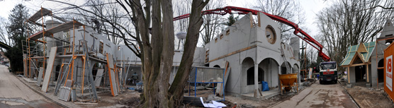 Einige der Gebäude wurden bereits mit Vollwärmeschutz verkleidet, um diese auch an kalten Tagen benutzbar zu machen. Wir sind gespannt, wie der Bereich Anfang April aussehen wird, in dem momentan noch Betonmischer und Baukräne das Bild beherrschen.