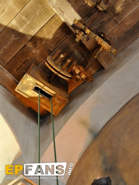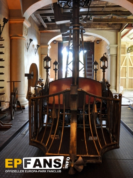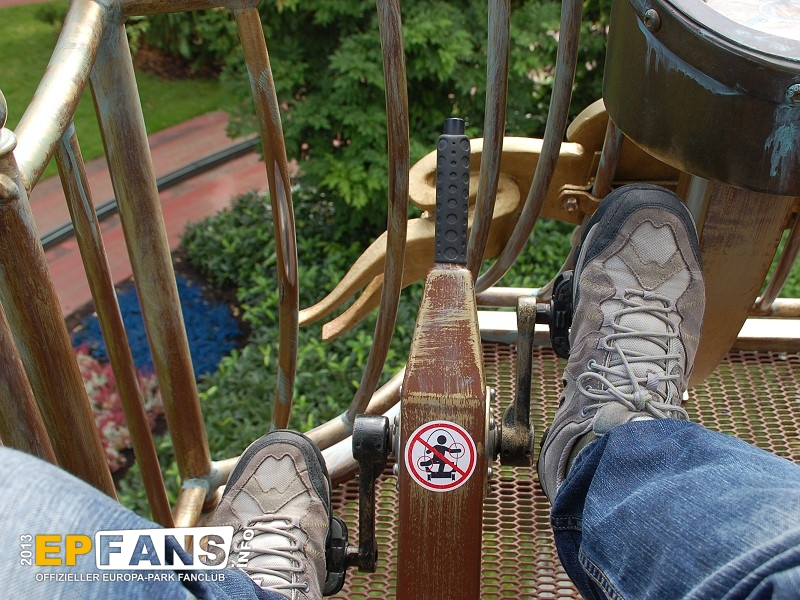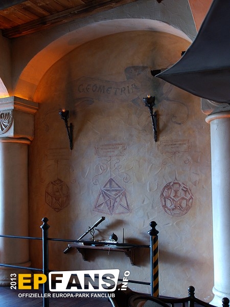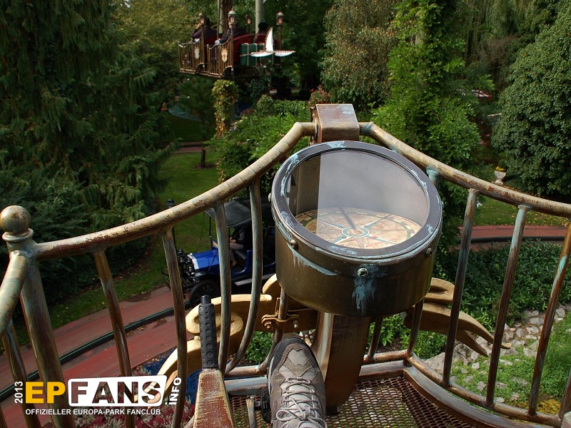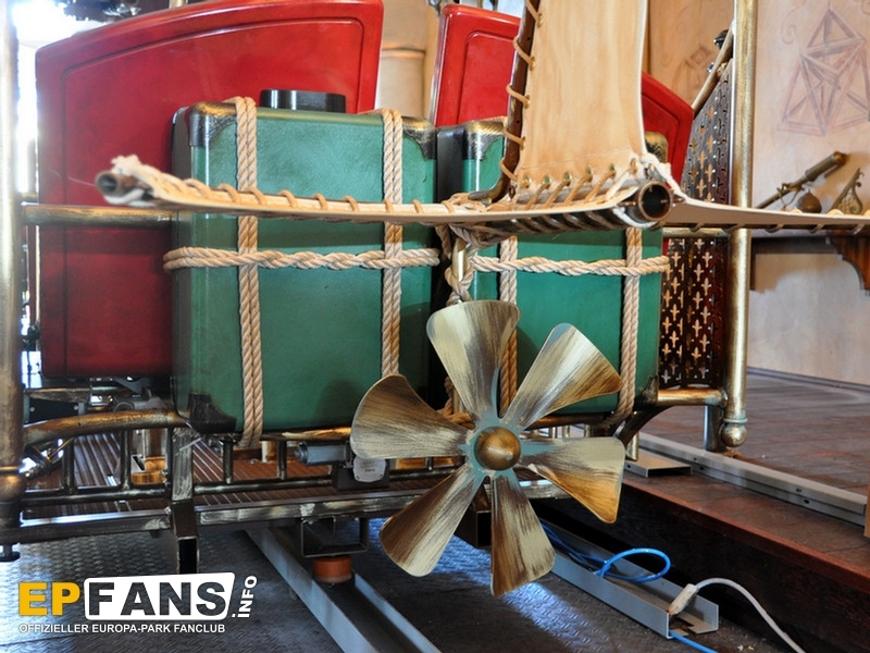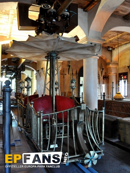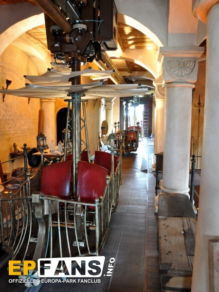 Beim Betreten des Ateliers von Leonardo begrüßt der Künstler höchst persönlich seine Gäste und bereitet sie auf den Flug mit seiner Erfindung vor. Bis zum Einstieg in seine Luftschrauber kann man noch an einigen anderen Erfindungen des großen Meisters vorbeigehen. Der Clou: Die Modelle sind alle auf Knopfdruck beweglich. So wird das Warten bis zum Abflug eigentlich viel zu schnell vorüber gehen... Die Flugobjekte sind für vier Personen ausgelegt. Alle Passagiere finden an ihrem Platz verstellbare Pedale, mit denen sich die Fahrgeschwindigkeit in einem gewissen Rahmen variieren lässt. Je schneller getreten wird, um so flotter ist man unterwegs. Um einen Zusammenstoß der Gondeln auf der Strecke zu verhindern, besitzt die Bahn eine gewisse Grundgeschwindigkeit. Zum Navigieren befindet sich als Dekoration ein funktionstüchtiger Kompass an Bord. Neben den Pedalen ist allerdings noch mehr "Bewegung an Bord". Der Hauptrotor über der Gondel sowie der Heckrotor drehen sich während der Fahrt. Für eine romantische Stimmung am Abend und bzw. in den Wintermonaten sind die Fluggeräte mit kleinen Laternen ausgerüstet.
