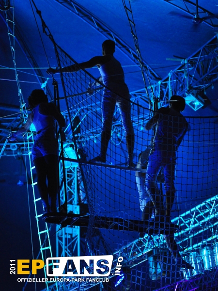 Vorbei an einigen Eislaufenden Comic-Figuren (Ein Gru? an die diesjährige Eisshow!) ging es schlie?lich zur Zirkus-Revue auf das Festivalgelände. Ein Ausschnitt aus dem Programm sorgte für den einen oder anderen kurzen Atemstillstand. Der Europa-Park präsentiert auch in diesem Jahr wieder einige waghalsige Artistik-Darbietungen. Das Kontrastprogramm hierzu bietet die Kunstausstellung in der Mercedes-Benz-Hall. Hier kann man in Ruhe verweilen und die Zeichnungen und Werke des elsässischen Künstlers Raymond-Emile Waydelich auf sich wirken lassen. Die zweite gro?e Neuheit in dieser Wintersaison 2011/2012 ist der neue 4D-Kinofilm mit der Euromaus und ihren Freunden. Anlässlich dieser Filmpremiere wurde sogar in kürzester Zeit zwischen Halloween und Wintersaison der Eingangsbereich des Kinos umgebaut: