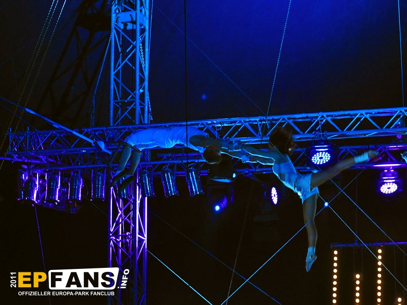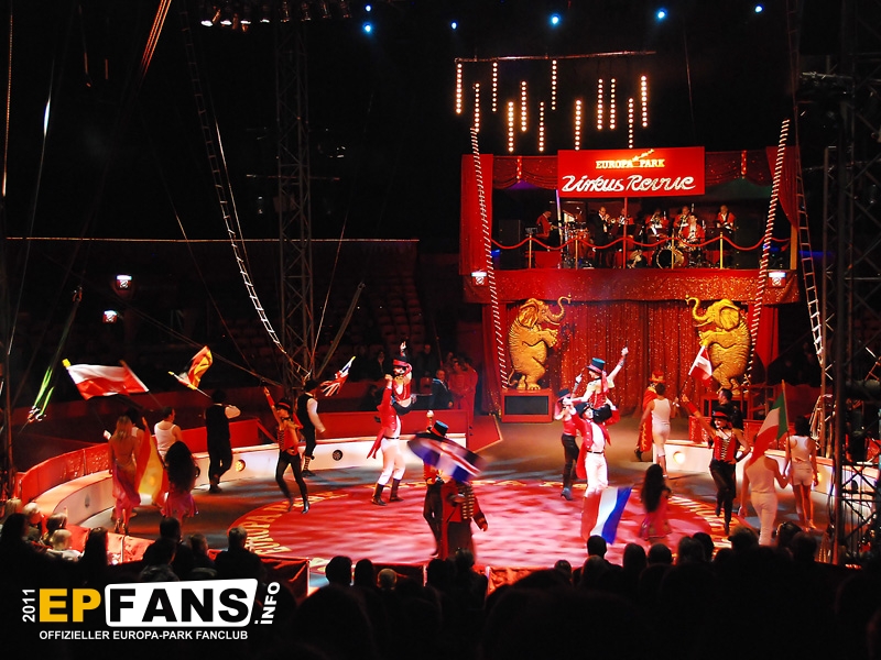 Zirkus Revue 2011/2012 Seit einigen Jahren zeigt der Europa-Park in der Wintersaion in einem Zirkuszelt auf dem Festival Gelände eine Zirkus-Revue mit zahlreichen international bekannten Artisten. Das beheizte Zelt stammt vom Circus Fliegenpilz. Es hat einen Durchmesser von 44 m und fasst 2200 Besucher in Schalensitzen.