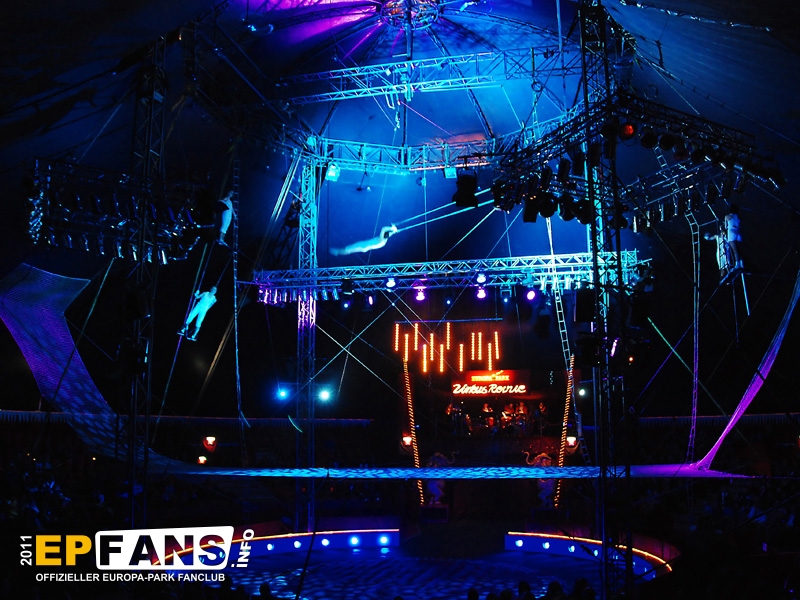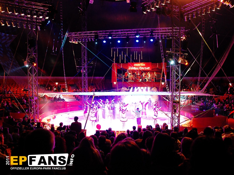 |  |  | Zirkus Revue 2011/2012 Seit einigen Jahren zeigt der Europa-Park in der Wintersaion in einem Zirkuszelt auf dem Festival Gelände eine Zirkus-Revue mit zahlreichen international bekannten Artisten. Das beheizte Zelt stammt vom Circus Fliegenpilz. Es hat einen Durchmesser von 44 m und fasst 2200 Besucher in Schalensitzen.