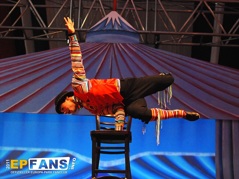 | Der Artist lässt die Zuschauer staunen, wie viele Stühle man übereinander stapeln kann...