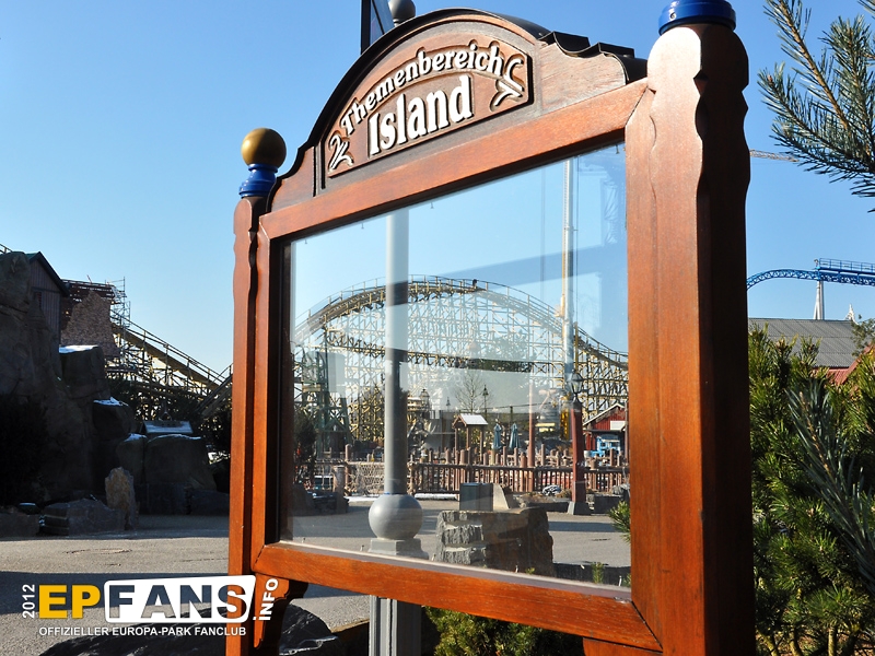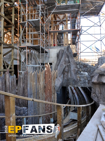 Wir durften nun die neue Holzkonstruktion hautnah erfahren und haben uns auf den Weg der Besucher-Warteschlange gemacht. Durchschreitet man das riesige Eingangstor vom weltlichen Teil Islands in das mythische Nordreich, fällt zunächst einmal der Blick auf das hier entstehende Wikingerdorf. Zugegeben, in der momentanen Ausbauphase braucht man noch einiges an Phantasie... Aber die gewaltige Kurve, die sich geradezu harmonisch um das blaue Stahlgerippe der BlueFire-Achterbahn windet, wird auch später an dieser Stelle noch genau so zu erleben sein: