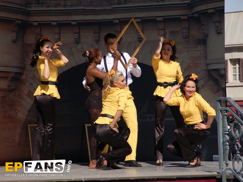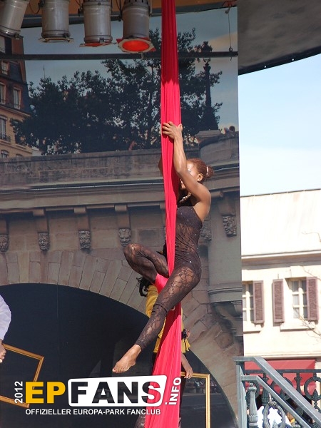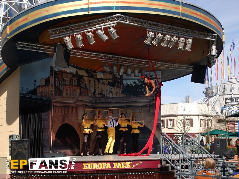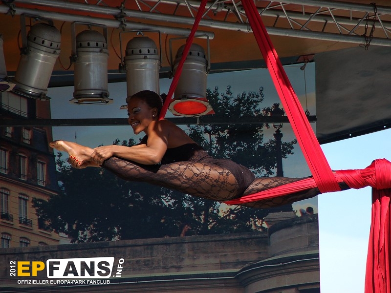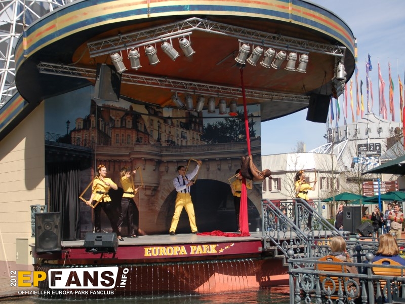 Tanz und Akrobatik 2012Frankreich - Auf der Seebühne im französischen Themenbereich wird in der Saison 2012 einmal am Tag (meist 12 Uhr) eine kurze Show unter dem Namen "Tanz und Akrobatik" aufgeführt.Eine Kombination von Tänzen des Europa-Park-Showballetts und artistischen Einlagen unterhalten sowohl die Gäste an den Tischen vor der Bühne wie auch vorbeigehende Parkbesucher. Die Show dauert ca. 15 Minuten.