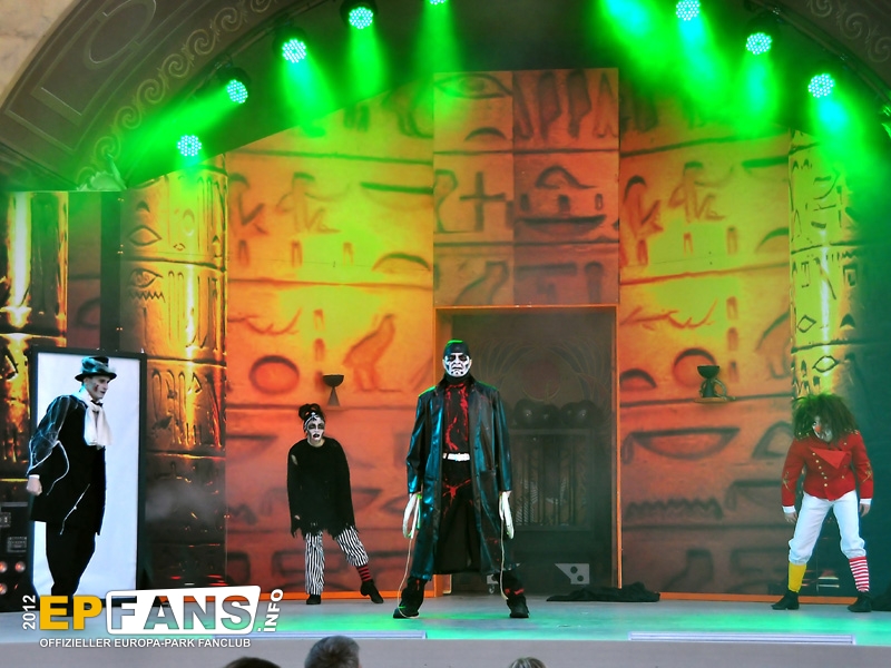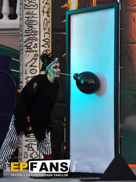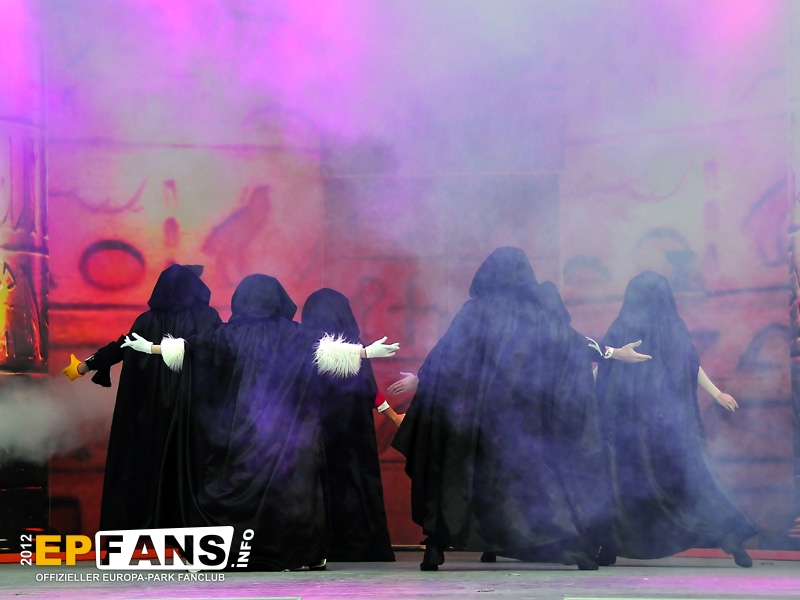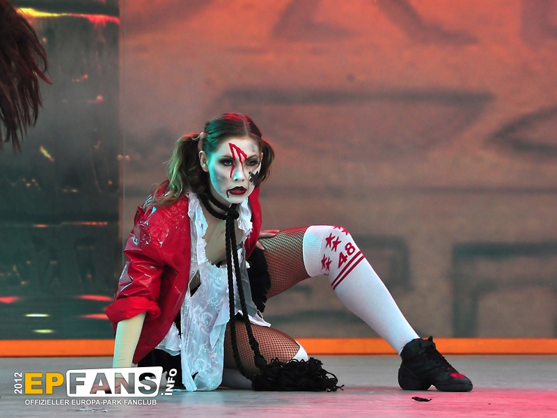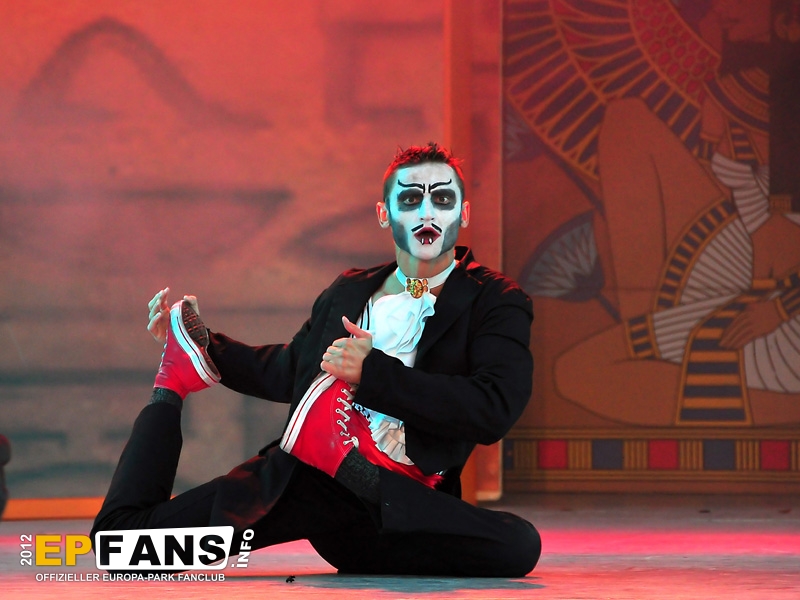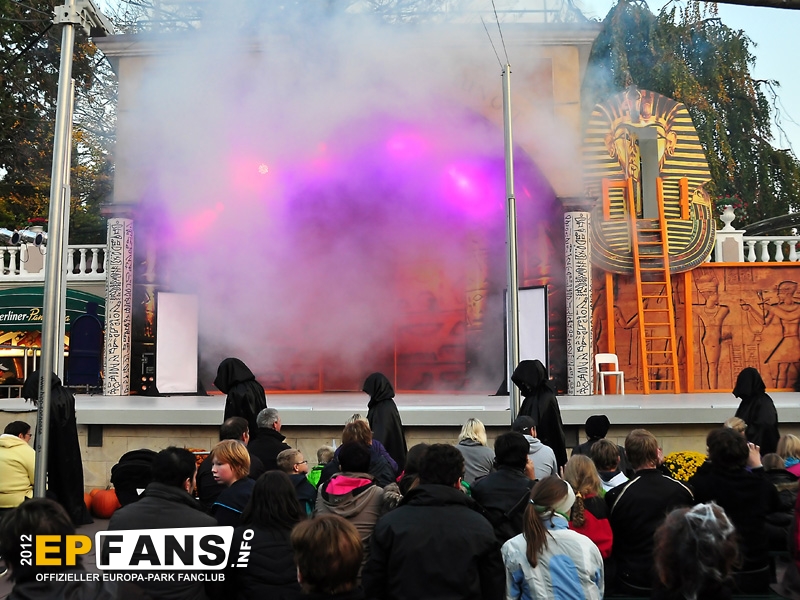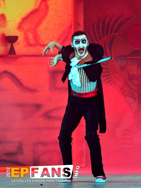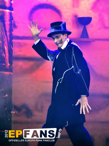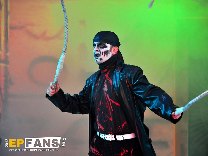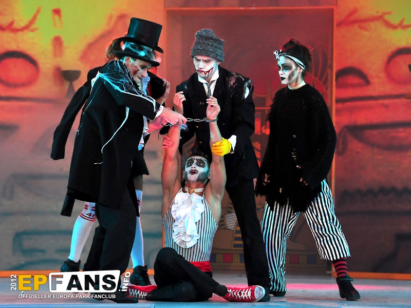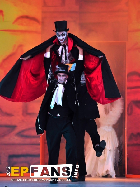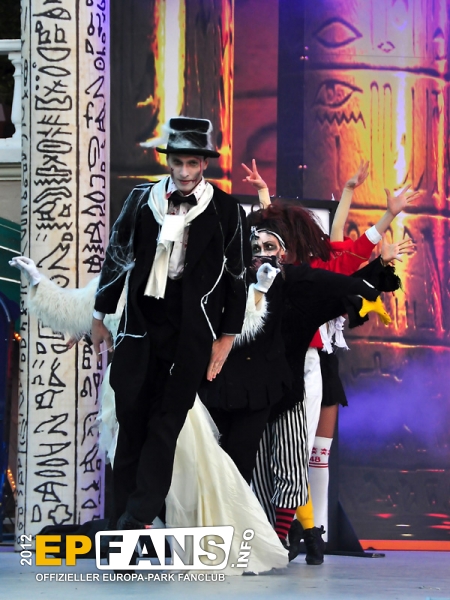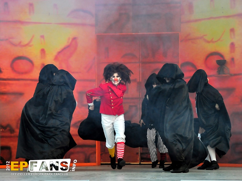 Dark side of the night - Halloween 2012Die "Dark side of the night" oder auch "Halloweenshow im Abendgrauen" genannt sucht man wie auch in den Jahren zuvor schon auf den Showplänen vergebens... Es handelt sich um eine "Zusatzshow", die nur einmal am Abend (jeweils zeitgleich zum Parkschluss) auf der Freilichtbühne in Italien aufgeführt wird. Mit dieser Show werden hauptsächlich die in Richtung Ausgang gehenden Gäste zum Verweilen und Gruseln eingeladen. Die Show besteht aus Tänzen des EP-Showballetts, Gesang sowie einer Artistik- und einer Peitschennummer. Die Vorstellung spukt ca. 25 Minuten lang.