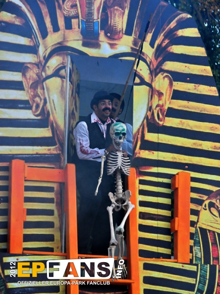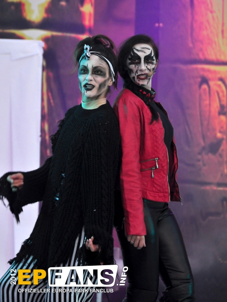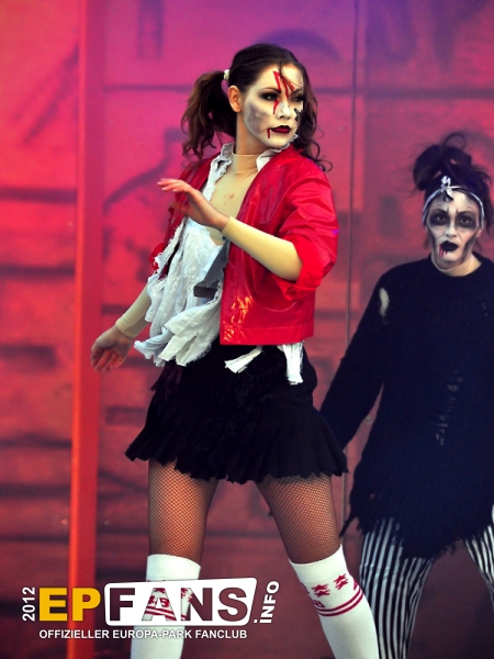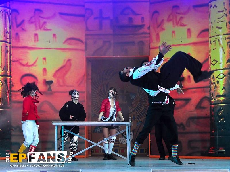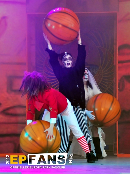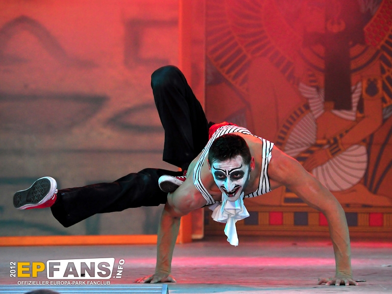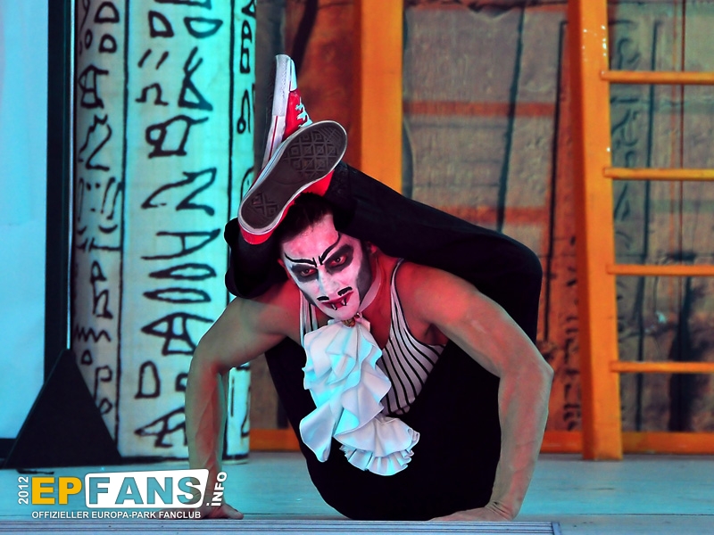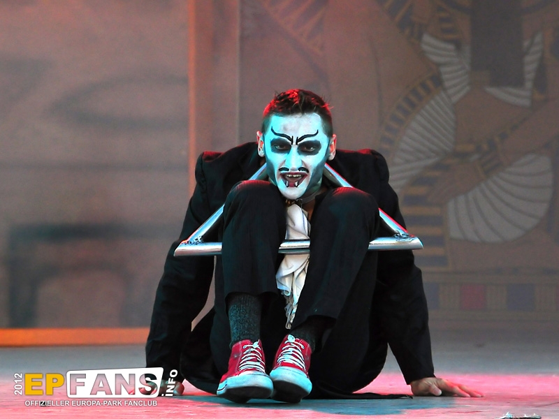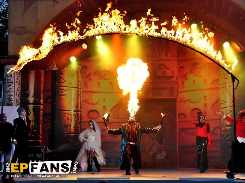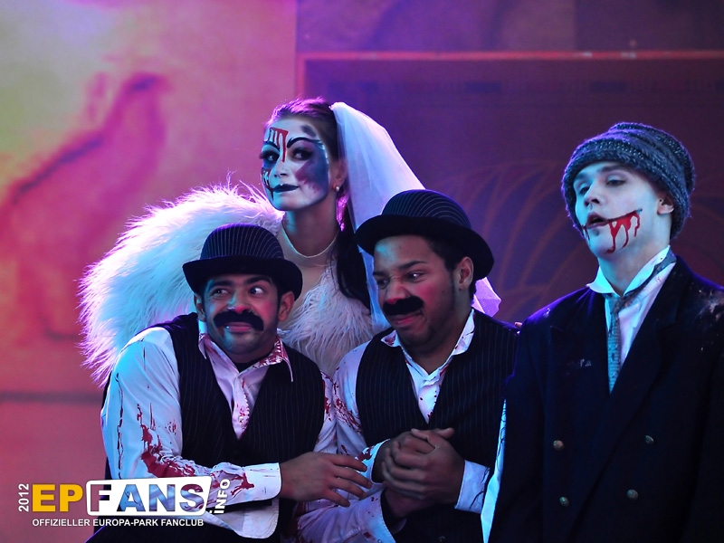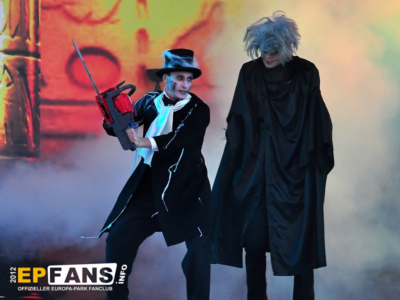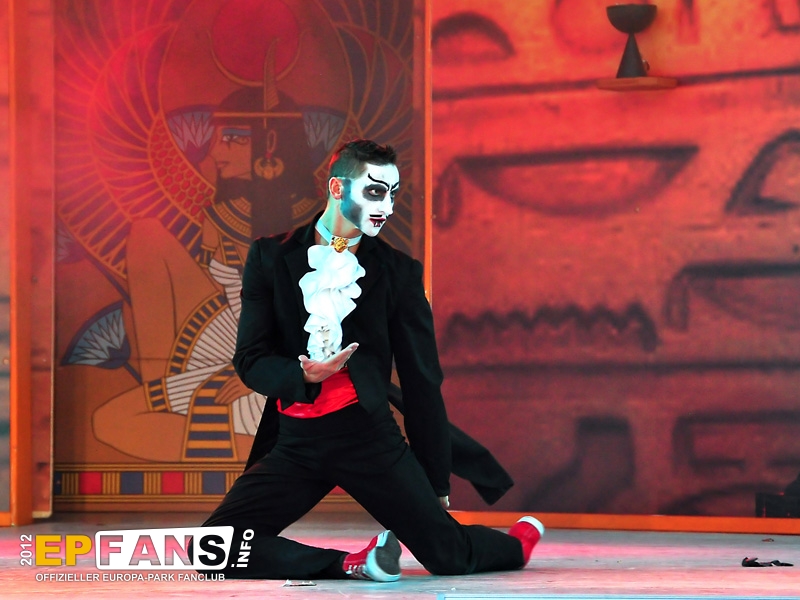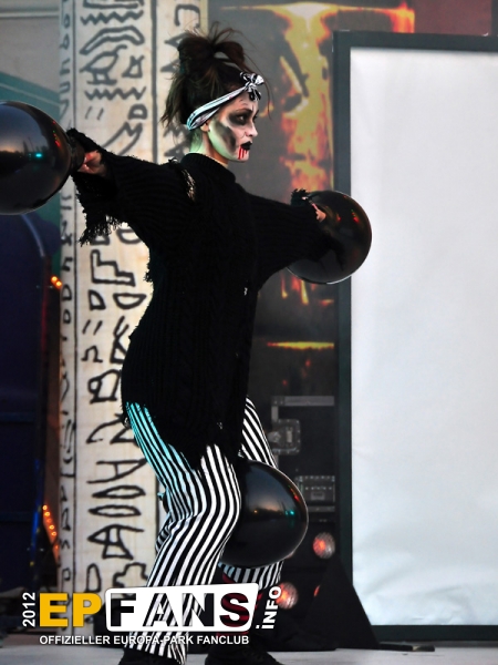 Dark side of the night - Halloween 2012Die "Dark side of the night" oder auch "Halloweenshow im Abendgrauen" genannt sucht man wie auch in den Jahren zuvor schon auf den Showplänen vergebens... Es handelt sich um eine "Zusatzshow", die nur einmal am Abend (jeweils zeitgleich zum Parkschluss) auf der Freilichtbühne in Italien aufgeführt wird. Mit dieser Show werden hauptsächlich die in Richtung Ausgang gehenden Gäste zum Verweilen und Gruseln eingeladen. Die Show besteht aus Tänzen des EP-Showballetts, Gesang sowie einer Artistik- und einer Peitschennummer. Die Vorstellung spukt ca. 25 Minuten lang.