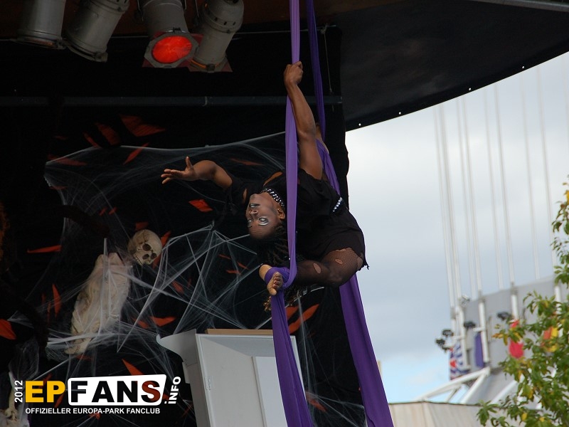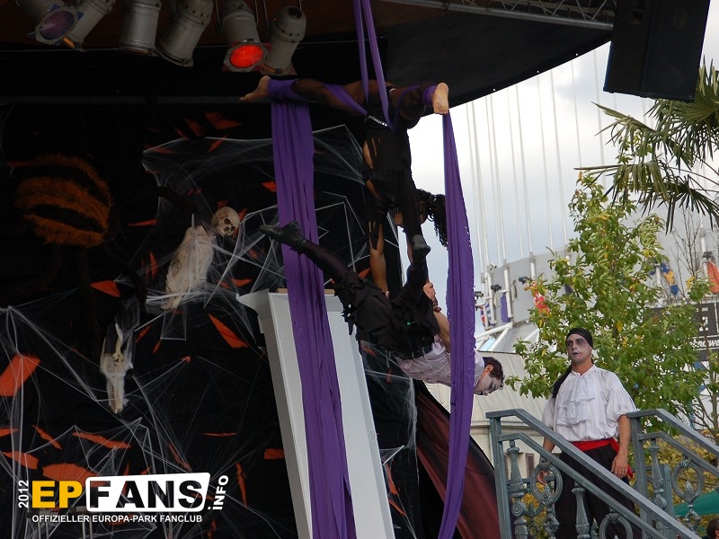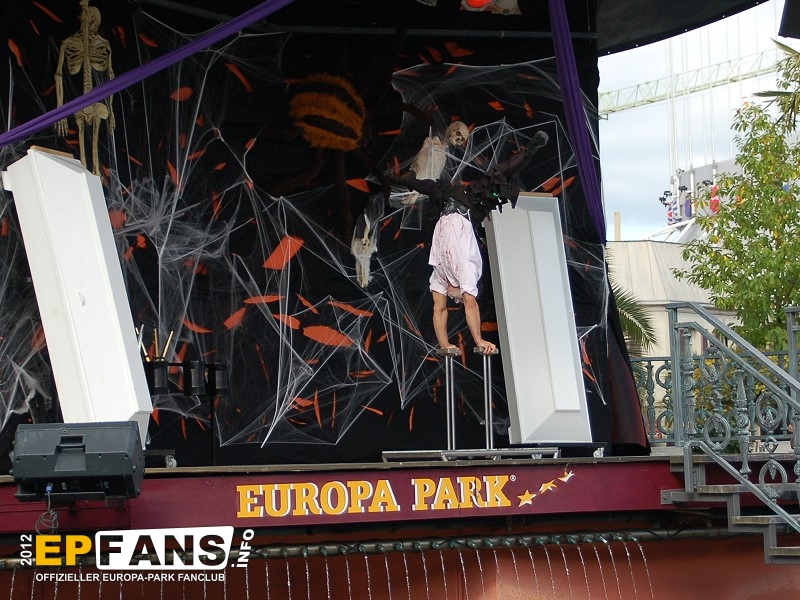 Halloweenshow 2012Frankreich - Auf der Seebühne im französischen Themenbereich wird in der Halloweensaison 2012 einmal am Tag eine kurze Show von "Up Leon" aufgeführt."Up Leon" zeigt Jonglage, das Vertikaltuch und Handstandakrobatik.