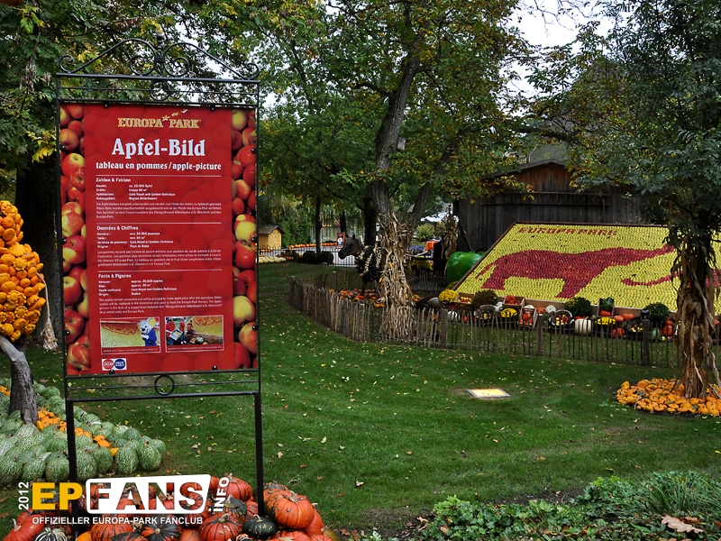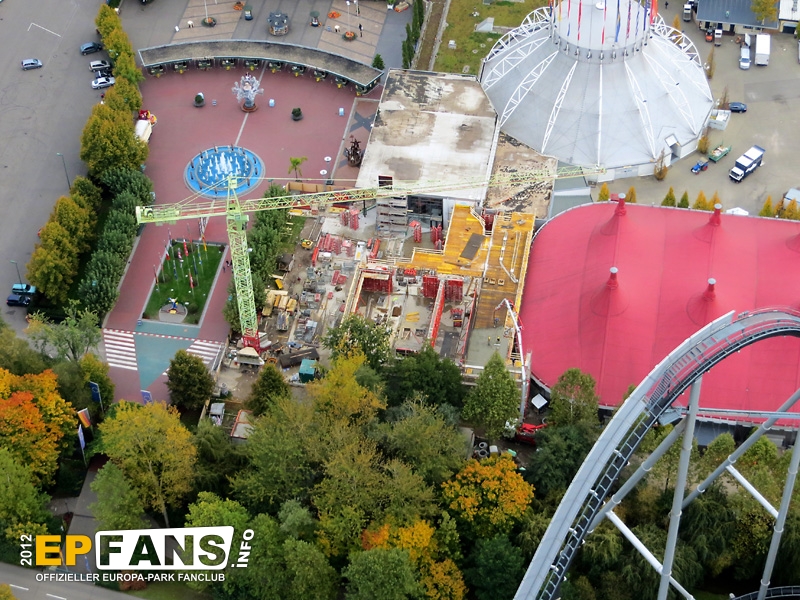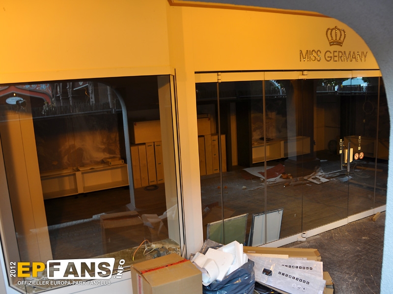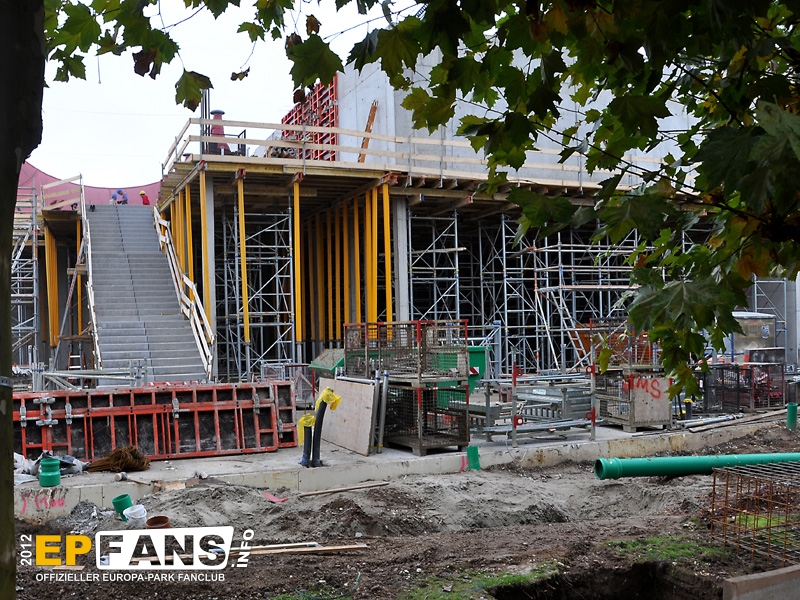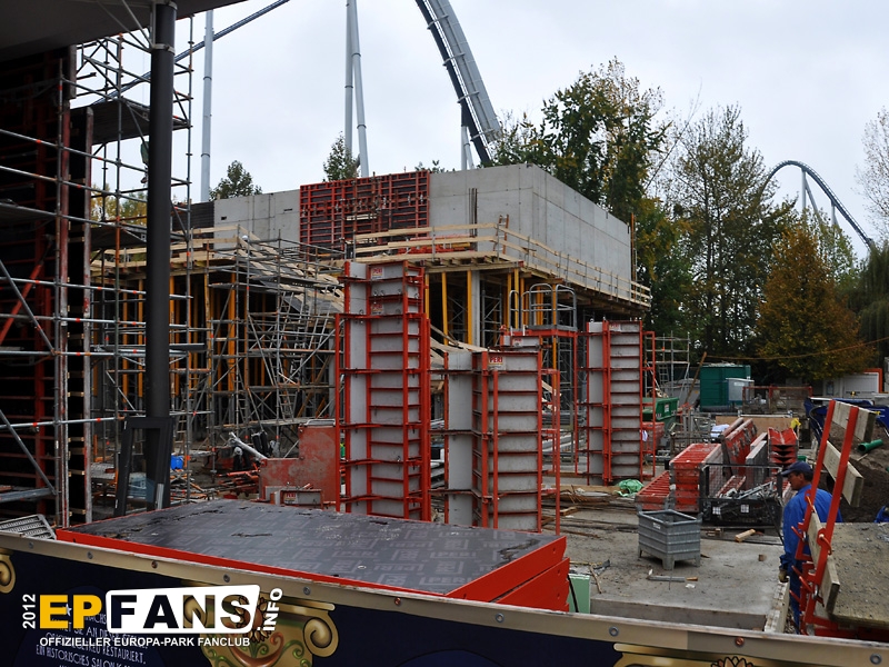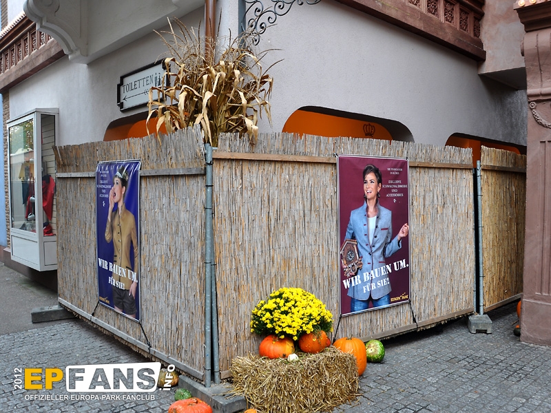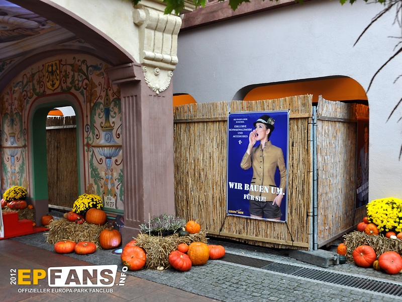 Aber nicht nur in Sache Dekoration hat sich seit dem letzten Besuch etwas getan. ?berall gibt es wieder Neues zu entdecken: ► Der Baufortschritt an der EP-Dome Erweiterung für das historische Karussell "Eden Palladium" ist beachtlich. Zwischenzeitlicht ist man bereits am Rohbau der 1. Etage angelangt. ► Der erst vor kurzem eröffnete "Miss Germany-Shop" in der deutschen Allee ist nun schon wieder Geschichte. An dieser Stelle wurde ein Bauzaun aufgestellt und die Verkaufsräume sind leer geräumt. Laut Infotafeln entsteht hier demnächst ein Verkaufsraum für "Exklusive Schwarzwaldmode und Accessoires". ► Die neu gestaltete Euromaus im Stil der Figur aus dem 3D-Film "Das Geheimnis von schloss Balthasar" nimmt im täglichen Parkgeschehen immer mehr Platz ein. Zahlreiche Schilder, Tafeln und Plakate sind nun mit der "modernen" Euromaus mit gelben T-Shirt, blauer Jeanshose und kindlicherem Gesicht versehen. ► Das Sortiment an Schokofrüchten im Park ist gewachsen. Es gibt nun auch Birnen-, Trauben- und Ananasspie?e. (Leider ist mit dem wachsenden Angebot auch der Preis der Produkte leicht gewachsen. Die einzelnen Früchte kosten im Schnitt nun 30 Cent mehr.) ► Damit keine Parkgäste verblüfft und traurig vor der 2012 geschlossenen Halloween-Attraktion "Tortuga" stehen, wurde dort ein Hinweisschild angebracht, welches auf das Zusatzangebot "The Villa" im griechischen Themenbereich hinweist. ► Wer bereits einen Schritt weiter als Halloween denkt, der kann sich schon jetzt auf die Wintersaison freuen. Die entsprechende Werbung in der Unterführung zum Besucherparkplatz wurde aufgestellt. Auch die provisorische Zelthalle am hinteren Rand des Parkplatzes steht schon, in welchem bereits jetzt flei?ig die wei?en Tannenbäume für die Winter-Dekoration hergestellt werden.(ohne Bild) ► Und noch eine Neuigkeit (ohne Bild): Bereits seit einigen Wochen wurden die Ausfahrtschranken beim Besucherparkplatz modernisiert, so dass nun bei jeder Schranke (also auch bei den vier linken) eine Ausfahrt mit der Jahreskarte möglich ist. Das hektische Spurwechseln von der linken Seite nach rechts zu den Lesegeräten der Jahreskarten entfällt nun erfreulicherweise und macht den Abreiseverkehr flüssiger.