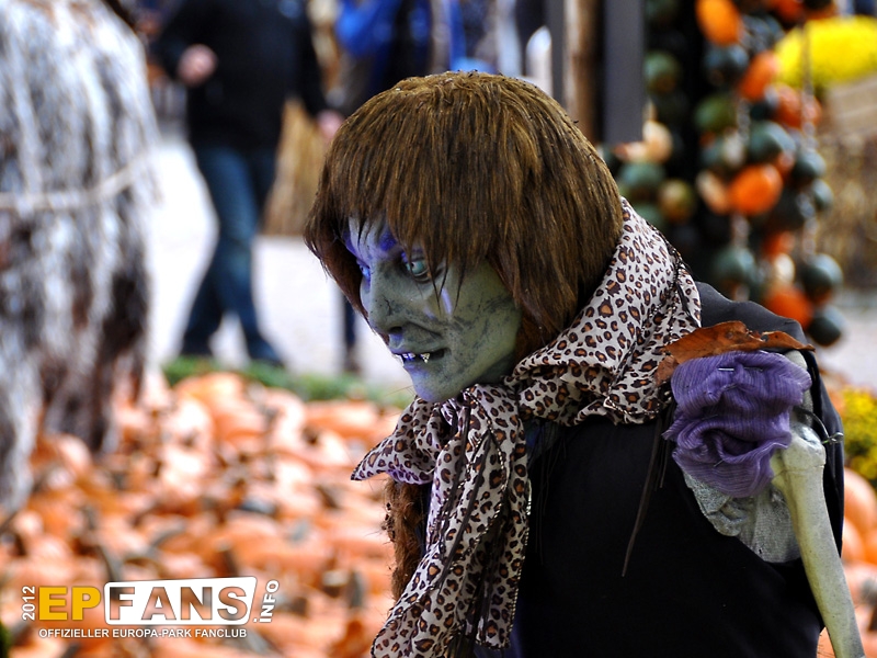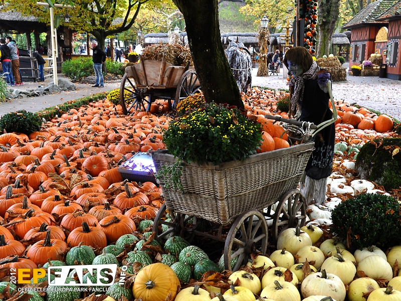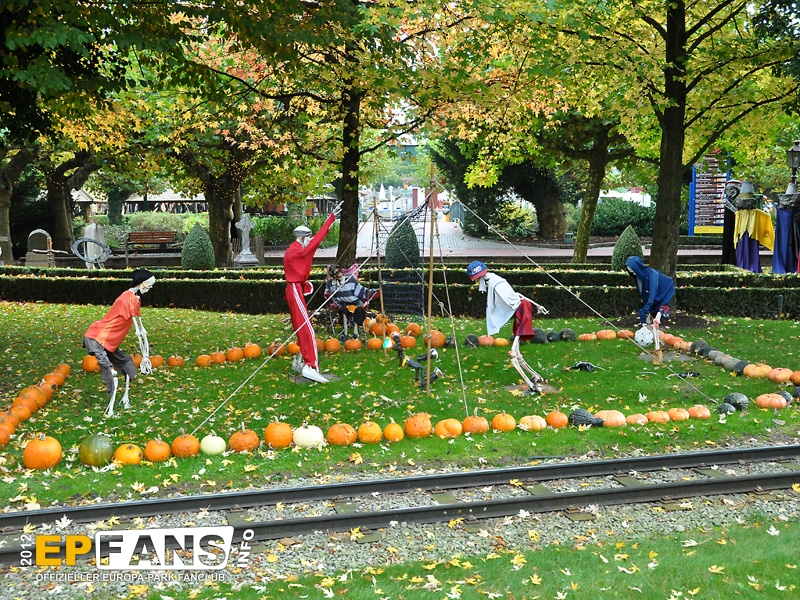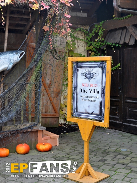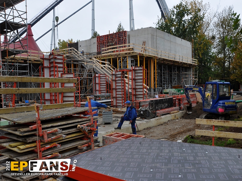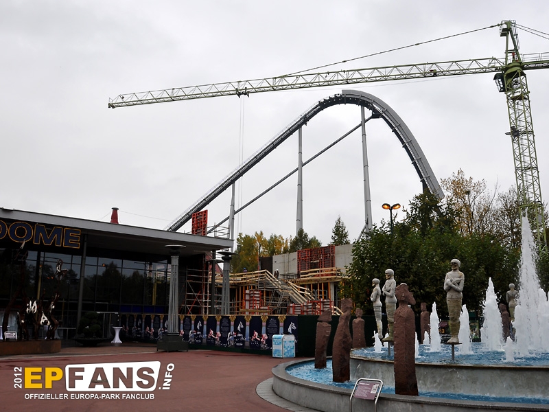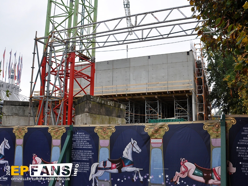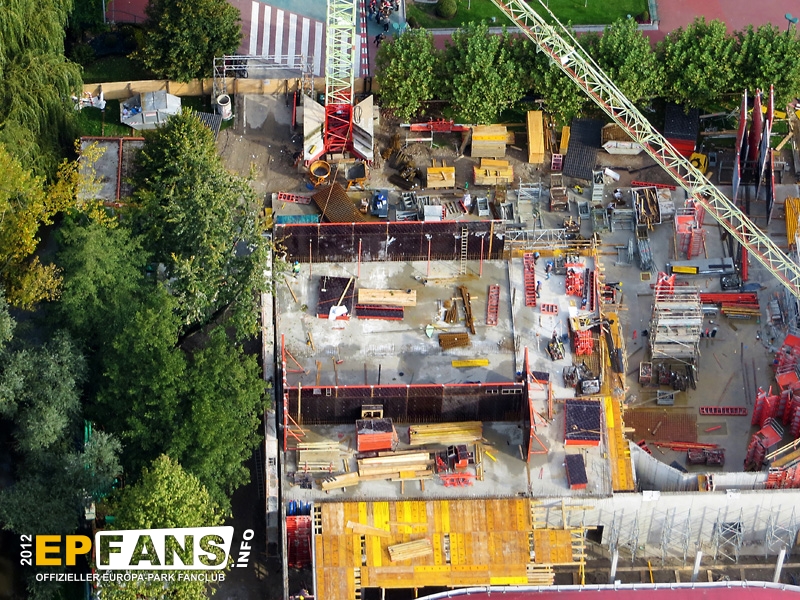 Aber nicht nur in Sache Dekoration hat sich seit dem letzten Besuch etwas getan. ?berall gibt es wieder Neues zu entdecken: ► Der Baufortschritt an der EP-Dome Erweiterung für das historische Karussell "Eden Palladium" ist beachtlich. Zwischenzeitlicht ist man bereits am Rohbau der 1. Etage angelangt. ► Der erst vor kurzem eröffnete "Miss Germany-Shop" in der deutschen Allee ist nun schon wieder Geschichte. An dieser Stelle wurde ein Bauzaun aufgestellt und die Verkaufsräume sind leer geräumt. Laut Infotafeln entsteht hier demnächst ein Verkaufsraum für "Exklusive Schwarzwaldmode und Accessoires". ► Die neu gestaltete Euromaus im Stil der Figur aus dem 3D-Film "Das Geheimnis von schloss Balthasar" nimmt im täglichen Parkgeschehen immer mehr Platz ein. Zahlreiche Schilder, Tafeln und Plakate sind nun mit der "modernen" Euromaus mit gelben T-Shirt, blauer Jeanshose und kindlicherem Gesicht versehen. ► Das Sortiment an Schokofrüchten im Park ist gewachsen. Es gibt nun auch Birnen-, Trauben- und Ananasspie?e. (Leider ist mit dem wachsenden Angebot auch der Preis der Produkte leicht gewachsen. Die einzelnen Früchte kosten im Schnitt nun 30 Cent mehr.) ► Damit keine Parkgäste verblüfft und traurig vor der 2012 geschlossenen Halloween-Attraktion "Tortuga" stehen, wurde dort ein Hinweisschild angebracht, welches auf das Zusatzangebot "The Villa" im griechischen Themenbereich hinweist. ► Wer bereits einen Schritt weiter als Halloween denkt, der kann sich schon jetzt auf die Wintersaison freuen. Die entsprechende Werbung in der Unterführung zum Besucherparkplatz wurde aufgestellt. Auch die provisorische Zelthalle am hinteren Rand des Parkplatzes steht schon, in welchem bereits jetzt flei?ig die wei?en Tannenbäume für die Winter-Dekoration hergestellt werden.(ohne Bild) ► Und noch eine Neuigkeit (ohne Bild): Bereits seit einigen Wochen wurden die Ausfahrtschranken beim Besucherparkplatz modernisiert, so dass nun bei jeder Schranke (also auch bei den vier linken) eine Ausfahrt mit der Jahreskarte möglich ist. Das hektische Spurwechseln von der linken Seite nach rechts zu den Lesegeräten der Jahreskarten entfällt nun erfreulicherweise und macht den Abreiseverkehr flüssiger.