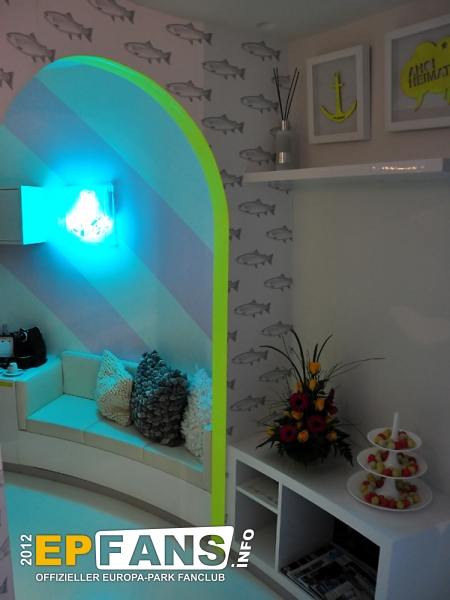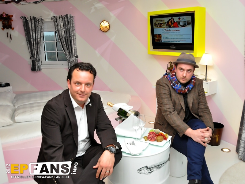 So präsentierte der EP, was im badischen Rust in der Wintersaison 2012/2013 alles geboten wird: Um es kurz und knapp auszudrücken: "Es ist gleich wie bisher. Nur besser!" Wir wollen damit sagen, dass es sämtliche Highlights der vergangenen Jahre auch in dieser Saison wieder zu besuchen, bestaunen und zu bewundern gibt. So ist das Riesenrad Bellevue genauso wieder am Start wie die ganzen anderen winterlichen Zusatzattraktionen wie Ski- und Rodelrampe, Eisbar Glaciar, die Skibobs für Kinder, die Wunderwelt für die kleinen Besucher im großen, roten Silverstar-Zelt, wie auch der Weihnachtsmarkt in der Deutschen Allee und vieles Andere mehr... Da es die erste Wintersaison ist, in der das neue Hotel Bell Rock existiert, wurden auch hier die Presseverteter empfangen. Der erste Programmpunkt auf der Tagesordnung der Pressekonferenz war ein kurzer Besuch in der Leuchtturm-Suite "Ahoi Heimat", die vom regional ansässigen, aber weltbekannten Künstler Stefan Strumbel hier für den Europa-Park exklusiv gestaltet wurde. Der Künstler selbst war für diese Besichtigung eigens in seine Suite "eingezogen" um einige Erklärungen abzugeben und Fragen zu beantworten. In der Bar "Spirit of St. Louis" begrüßte schließlich Herr Roland Mack seine eingeladenen Gäste bei einer traditionellen neu-englischen Tea-Time und gab einen kurzen Überblick über das Programm am Nachmittag wie auch über die Institution Europa-Park und seine Besucher.
