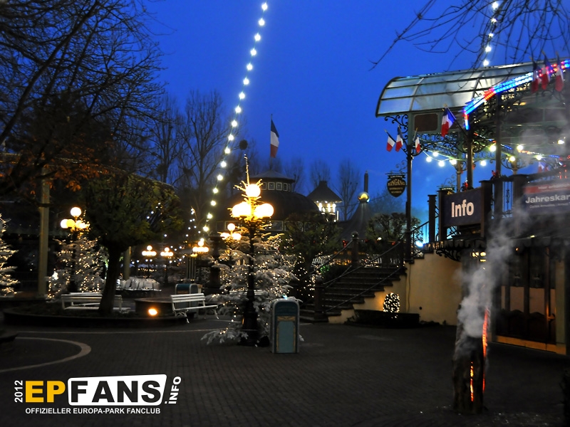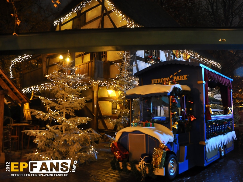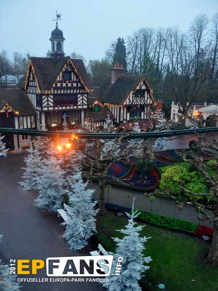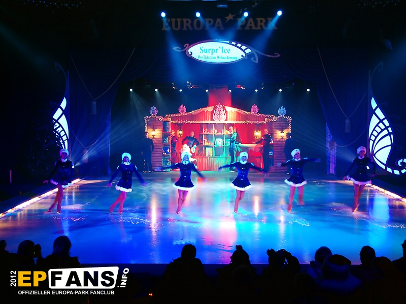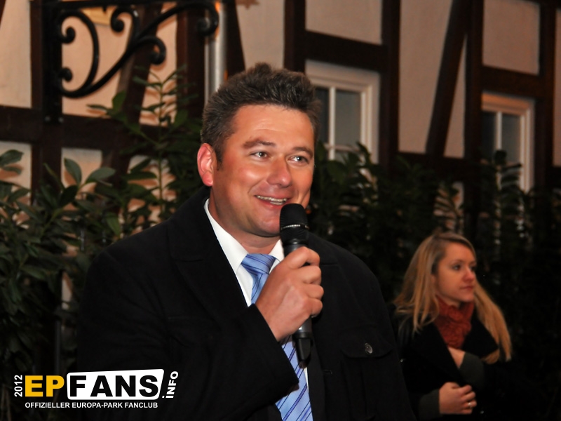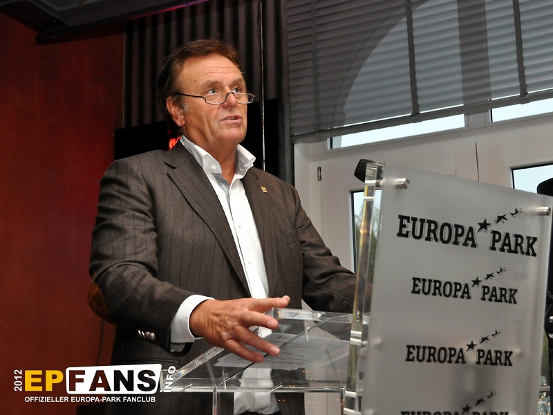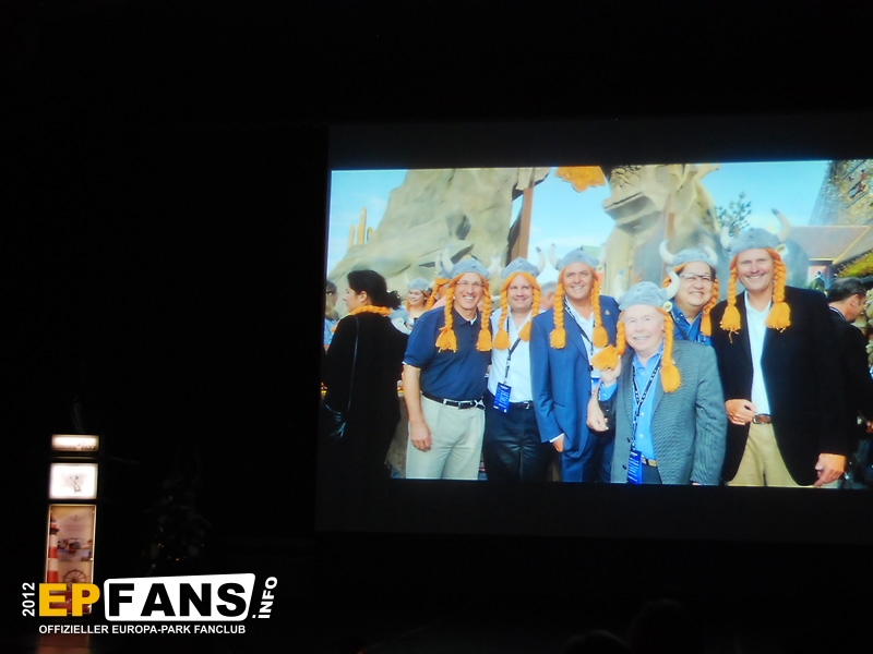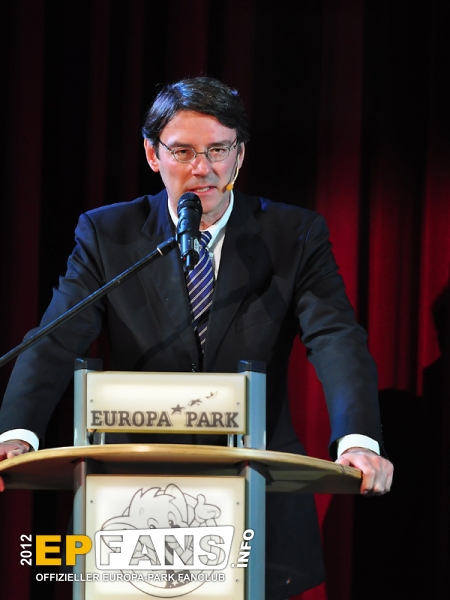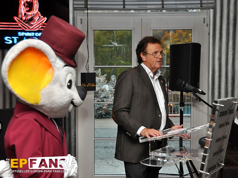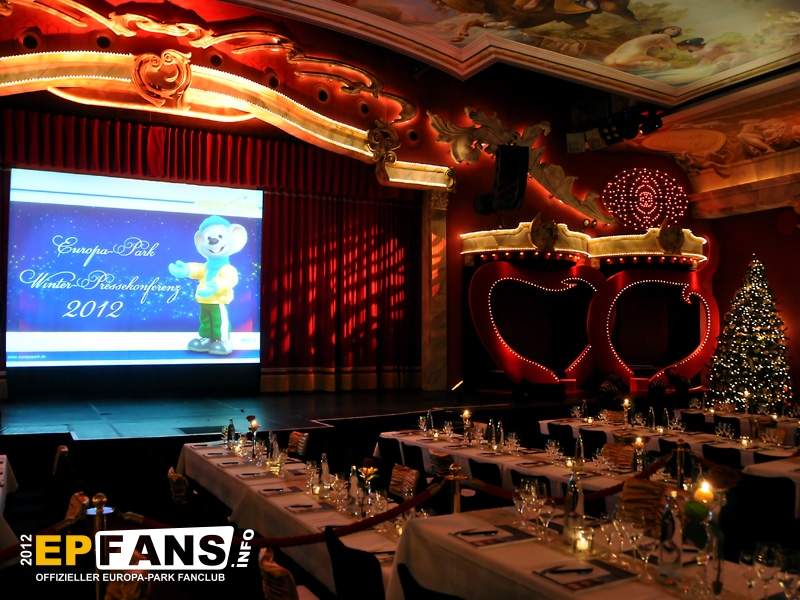 Bei der Winter-PK 2012 wurde ein Schwerpunkt auf das Showangebot des Europa-Park gelegt, denn direkt im Anschluss machten sich die Gäste auf den Weg zum EP-Express, der in Richtung Eisshow fuhr. Während der vom Pressesprecher Herr Dr. Volker Klaiber moderierten Fahrt über das Gelände war es möglich die unzähligen Lichter zu bewundern, die nun die nächsten Wochen den Himmel über Rust ein klein wenig heller erscheinen lassen. Damit nicht nur der Himmel strahlen kann, sondern auch das umweltbewusste Gewissen, folgte die Erklärung, dass nun weitgehend flächendeckend moderne und stromsparende LED-Leuchtmittel zum Einsatz kommen. Alleine der Austausch der tausenden von Lichtern am Riesenrad Bellevue sorgt dafür, dass hier über 80% Stromersparnis möglich sind. Nach der Präsentation eines Auszuges aus der Eisshow "Surpr`Ice - Das Ticket zum Weihnachtsmann" folgte ein kurzer Fußmarsch in die deutsche Allee zur Vorstellung des neuen Shops für Schwarzwaldmode und Accessoires, welcher in den letzten Wochen der Halloweensaison hier eröffnete. Gestärkt durch einen Glühwein ging es schließlich wieder zurück in den Italienischen Themenbereich zum Theatro Dell` Arte. Dieser festlich anmutende Saal war die ideale Örtlichkeit für die große Rede von Herrn Roland Mack über seine Zeit als IAAPA-Präsident. (Weltverbandes der Freizeitindustrie) Das Amt hatte er seit November 2011 inne bis er vor einigen Tagen in Orlando, Florida turnusmäßig diese Position an seinen Nachfolger übergab. Neben den traditionellen Dankesworten an seine Familie und die Mitarbeiter, die das Produkt Europa-Park mittragen und mit(er-)leben, präsentierte Herr Mack erstmalig die "Kulturbilanz" des Parks in Form einer eigens hierfür hergestellten 110-seitigen Publikation.
