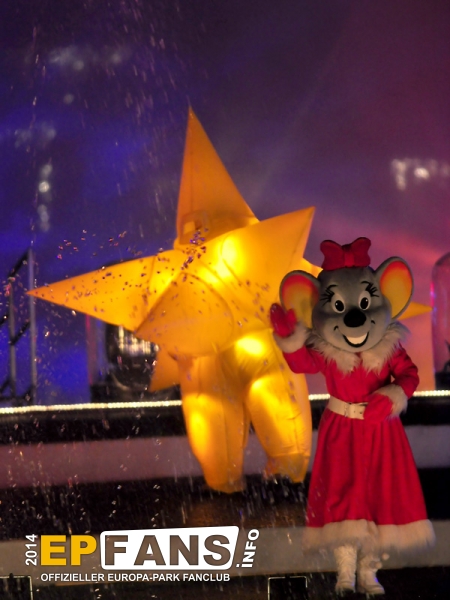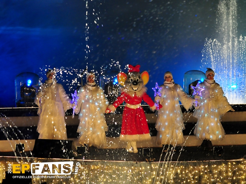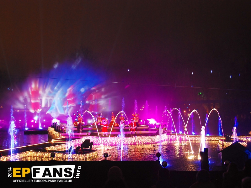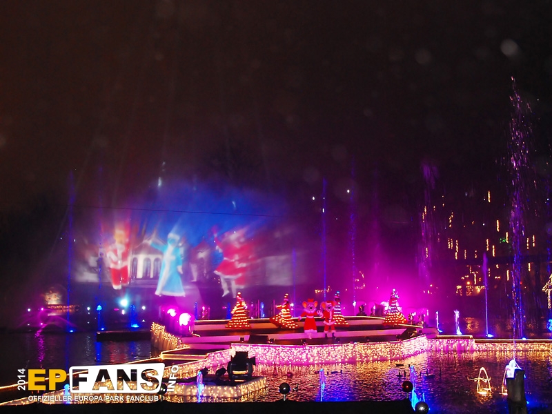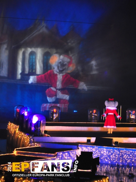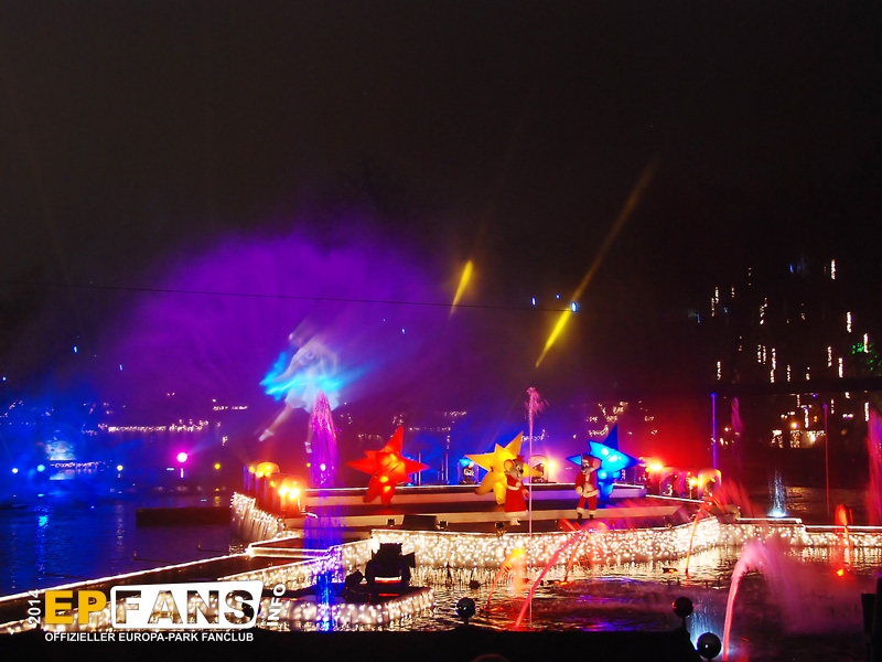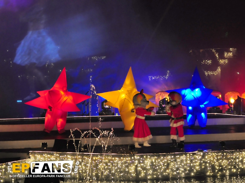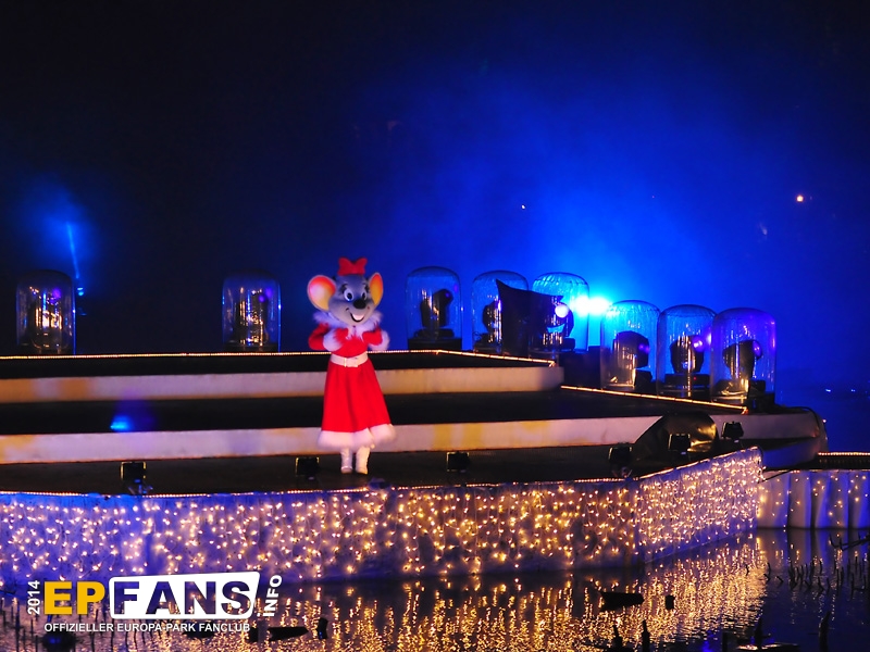|  |  |  | Luna Magica - Sternensee presented by EnBW 2014Die Euromaus ist ungeduldig und packt ein Geschenkt vom Weihnachtsmann zu früh aus. Die Besucher kann es freuen. Denn im Geschenk sind allerhand Licht,- Wasser-, und Feuereffekte.Doch der Weihnachtsmann bemerkt das Treiben der Euromaus und kommt höchstpersönlich auf seinem Schlitten eingeschwebt. Tausende Lichter auf der Bühne und rund um den See sowie ein kleines Abschlussfeuerwerklassen lassen die Besucher in ein funkelndes Weihnachtsmärchen eintauchen. Die Darsteller sind entweder "live" auf der Bühne, oder werden auf den speziellen Wasser-Fontainenvorgang projiziert. Die Show dauert ca. 15 Minuten und wird allabendlich ab 18.00 Uhr auf der hierfür errichteten Seebühne vor dem Seerestaurant aufgeführt. Beim Zugang zum See verteilen Mitarbeiter spezielle Effektbrillen, die jeden Lichtpunkt in einen Stern bzw. eine Schneeflocke verwandeln. Die Show ist inhaltlich angelehnt an die Aufführungen der vergangenen Jahre, wurde jedoch 2014 neu konzipiert und durch die Installation einiger Wasserfontainen der Firma Aquatique erheblich aufgewertet. Seit 2014 tritt EnBW als Sponsor der Show auf, weshalb der Name auch im Showtitel enthalten ist.