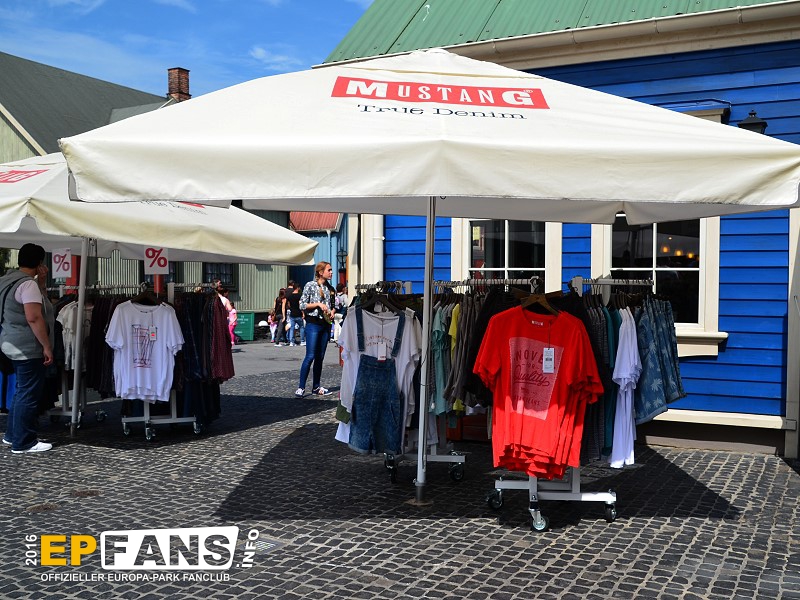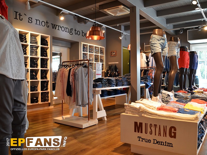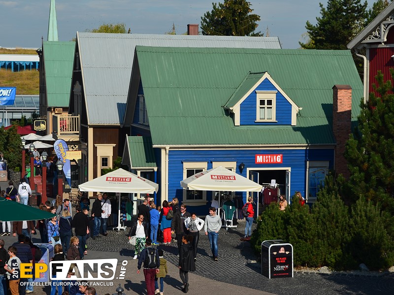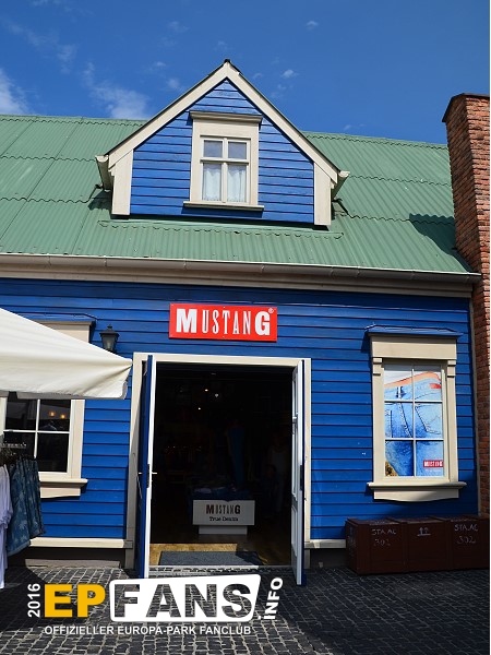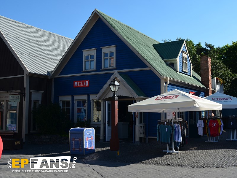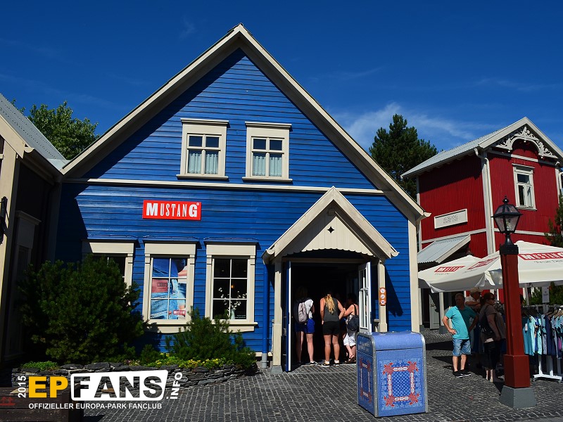MUSTANG-ShopIsland - In der Saison 2015 zog der MUSTANG Shop aus Griechenland in dieses Gebäude in Island um. MUSTANG ist der Kooperationspartner der Holzachterbahn WODAN, die sich im Themenbereich Island befindet. Im Shop erhält man eine Auswahl der MUSTANG Kollektion.