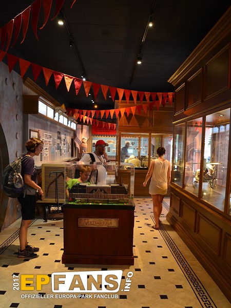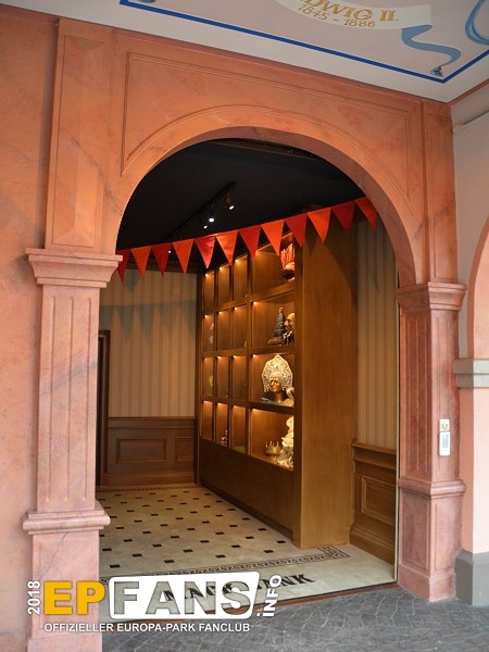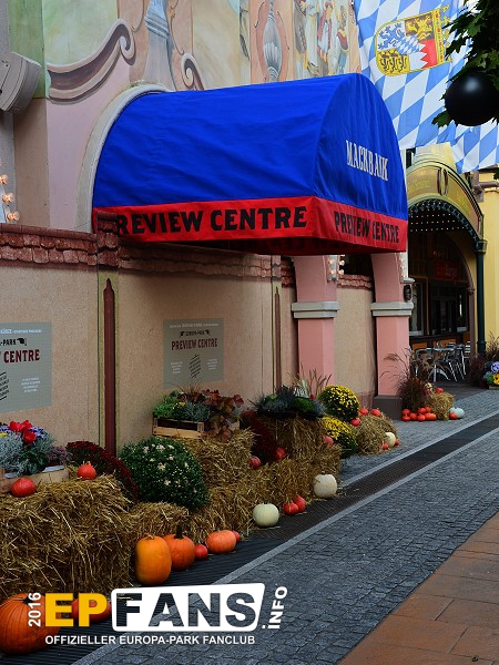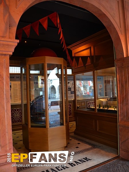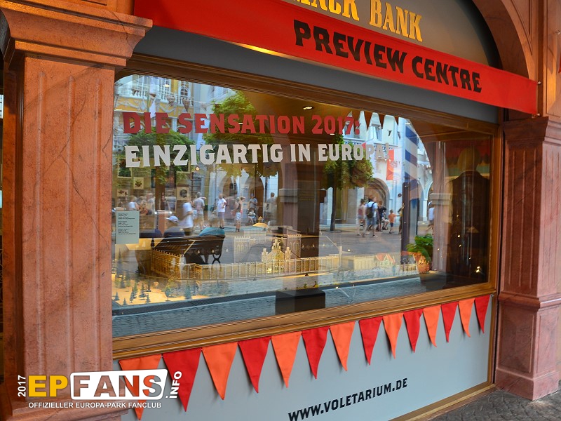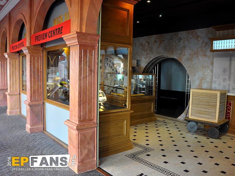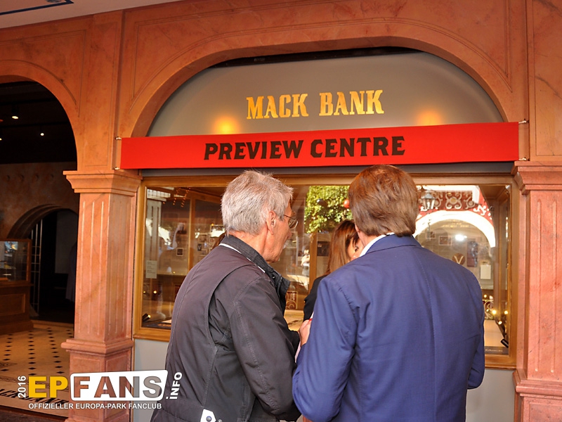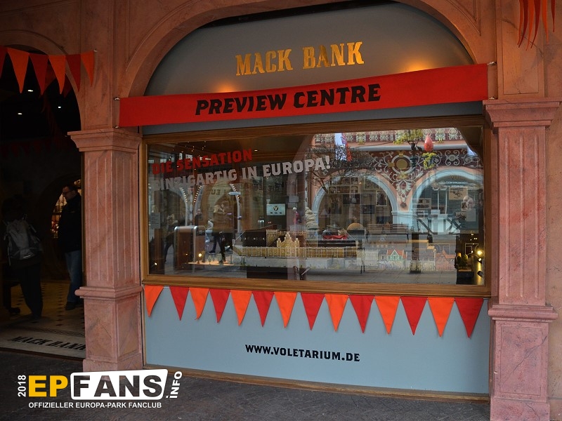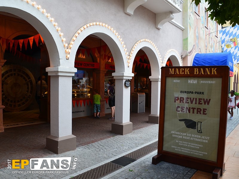SchatzkammerDeutschland - Dort, wo einst im Themenbereich Deutschland der Altdeutsche Jahrmarkt und danach das Puppenmuseum "Käthe Kruse" sich befanden, zog im Herbst 2016 das Preview Center "Mack-Bank" ein. Hier zeigt nun der Park seinen Gästen die Neuheiten, die es in naher Zukunft gibt. In der Saison 2019 wird der Europa-Park hier einiges zum Wiederaufbau der Attraktion "Piraten in Batavia" zeigen. Das Preview Center löste die Preview Zelte, die es in den Jahren zuvor immer wieder bei größeren Neuheiten im Park gab, ab. Nach der Sommersaison 2018 wurde die "Mack-Bank" in "Schatzkammer" umbenannt und zeigte im Winter 2018/2019 eine James Rizzi Ausstellung.